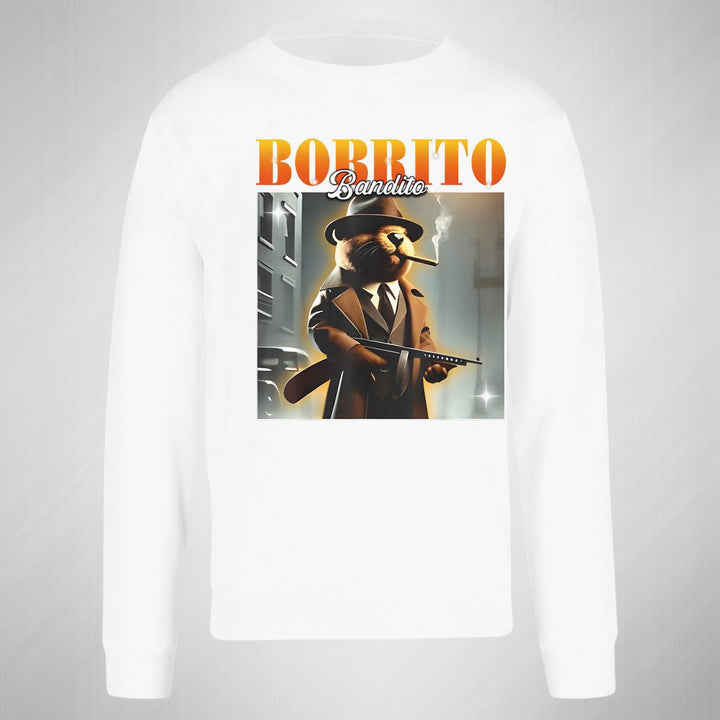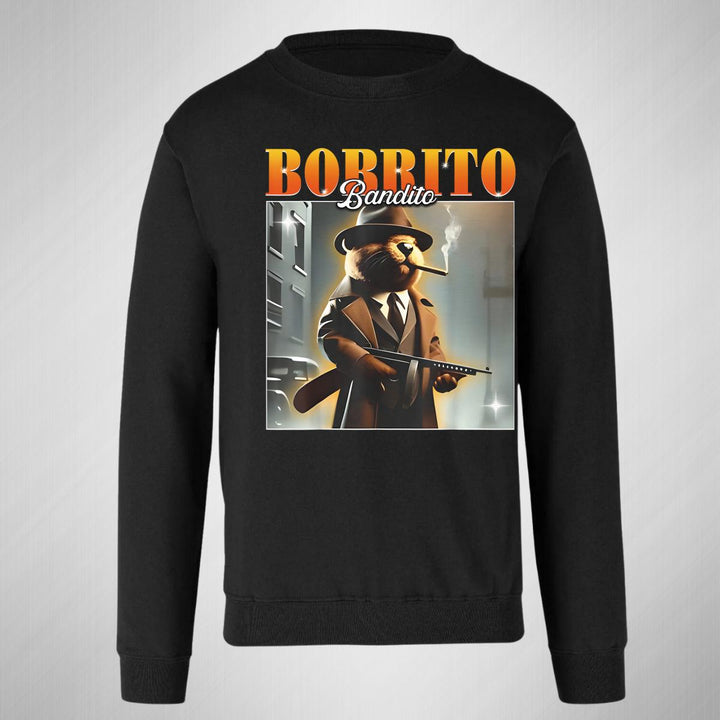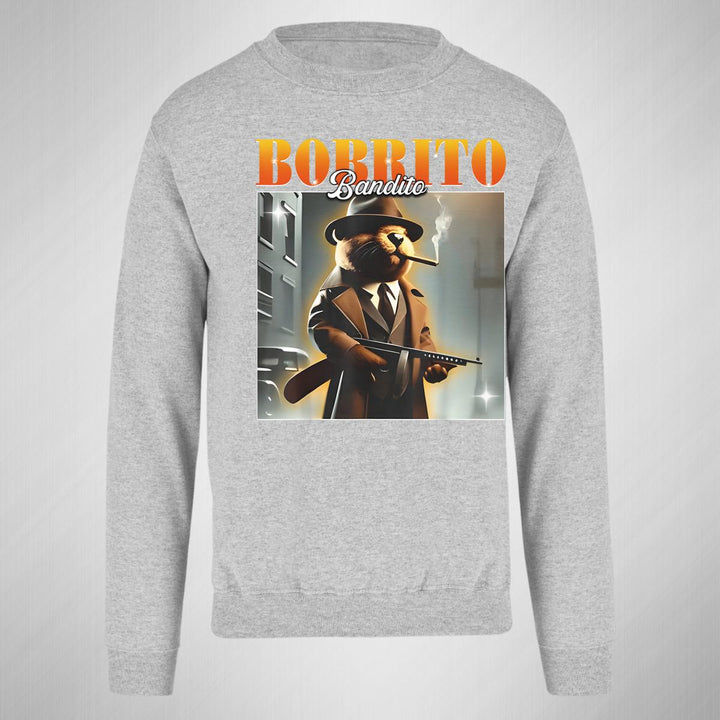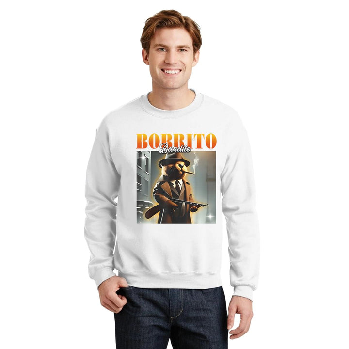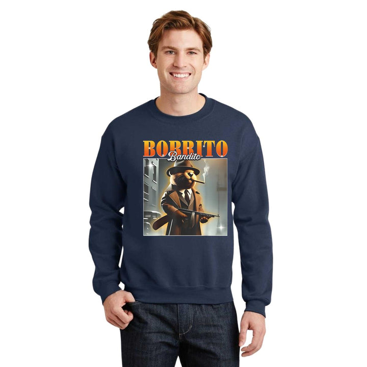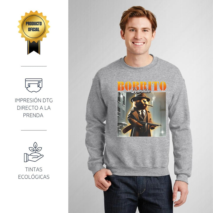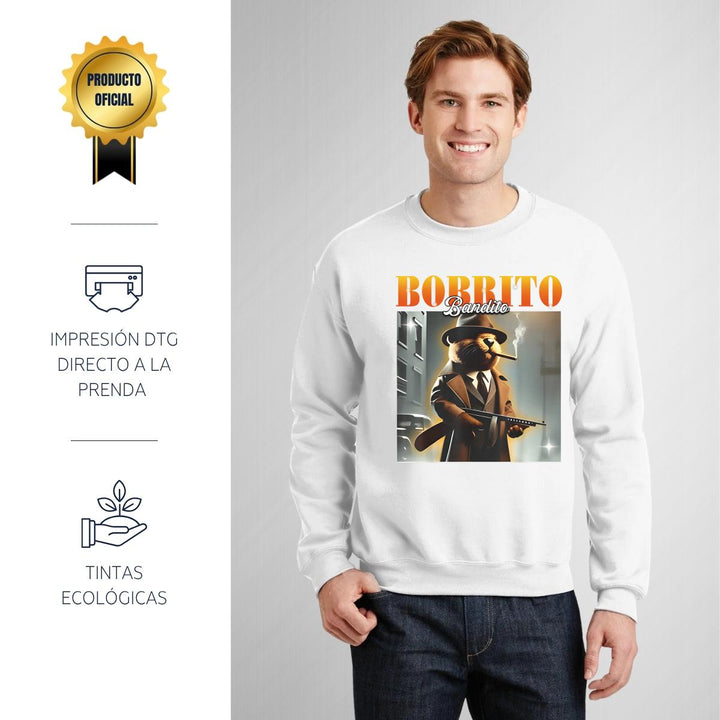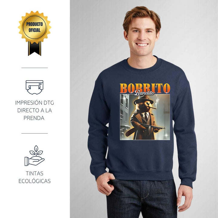 Sudadera de adulto cuello redondo sin gorro o capucha, para hombre nueva, diseño Brainrot Bobrito Bandito original impreso con tecnología DTG (directo a la prenda) tacto cero, uso casual o deportiva, 50% algodón y 50% poliéster, estructura sin costura en los costados con ajuste clásico. Colores de sudadera: Negro, Blanco, Azul Marino, Gris.