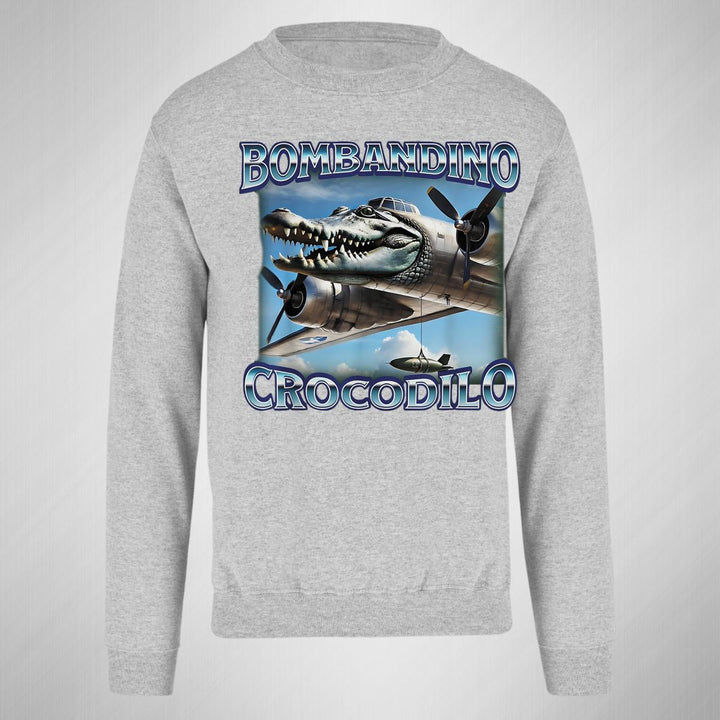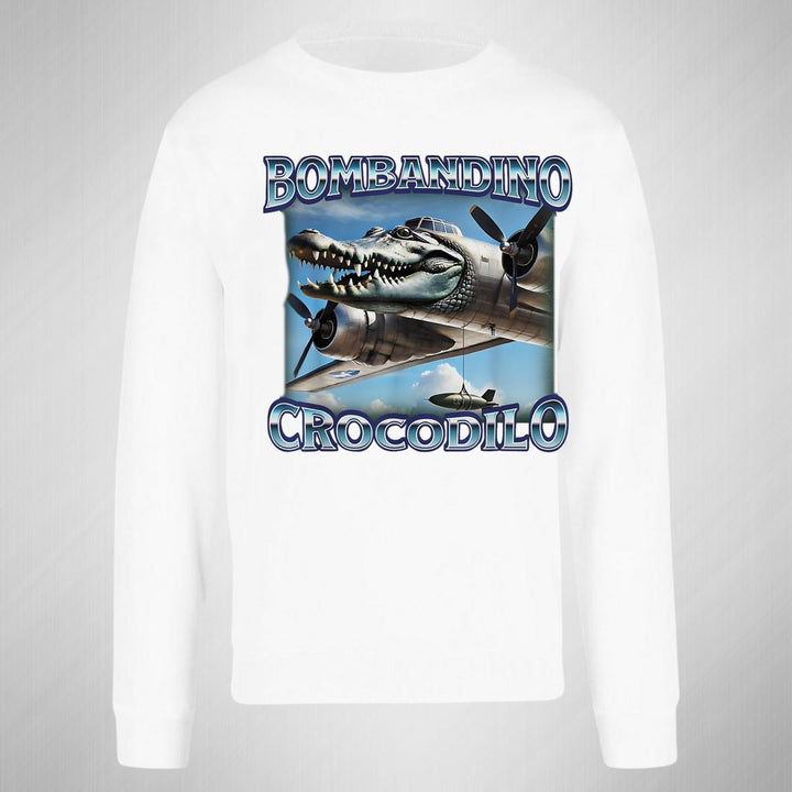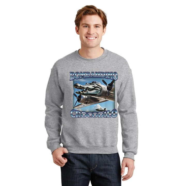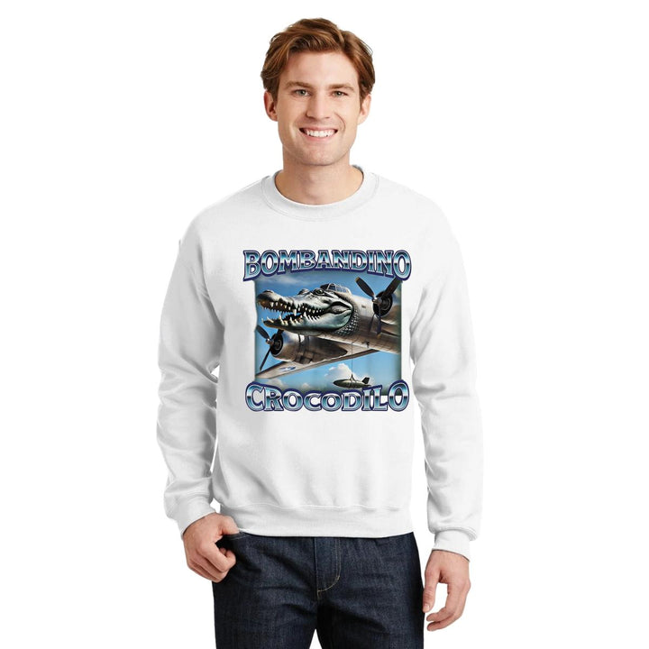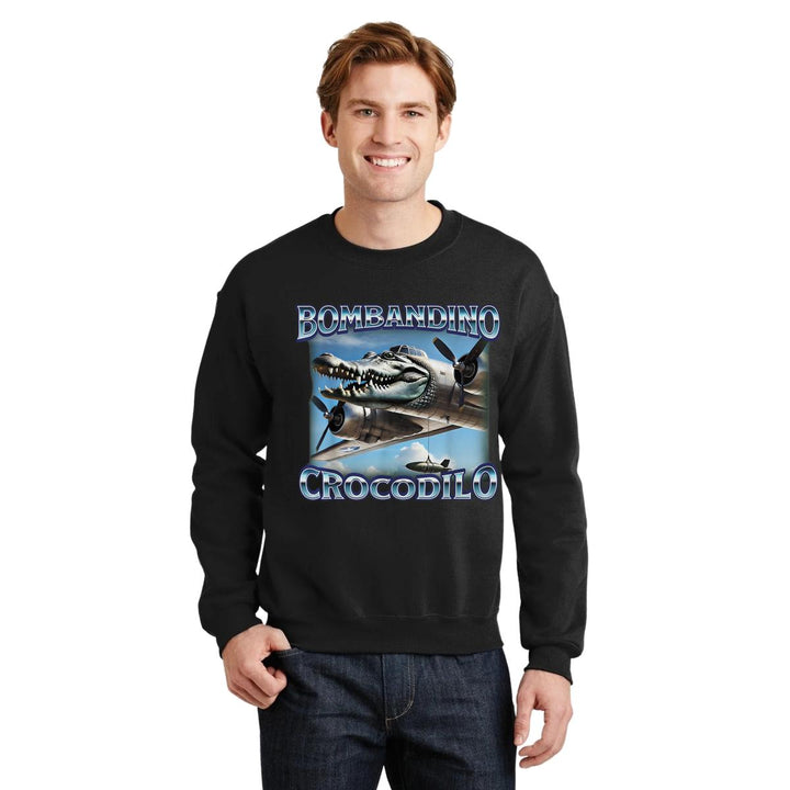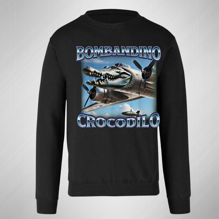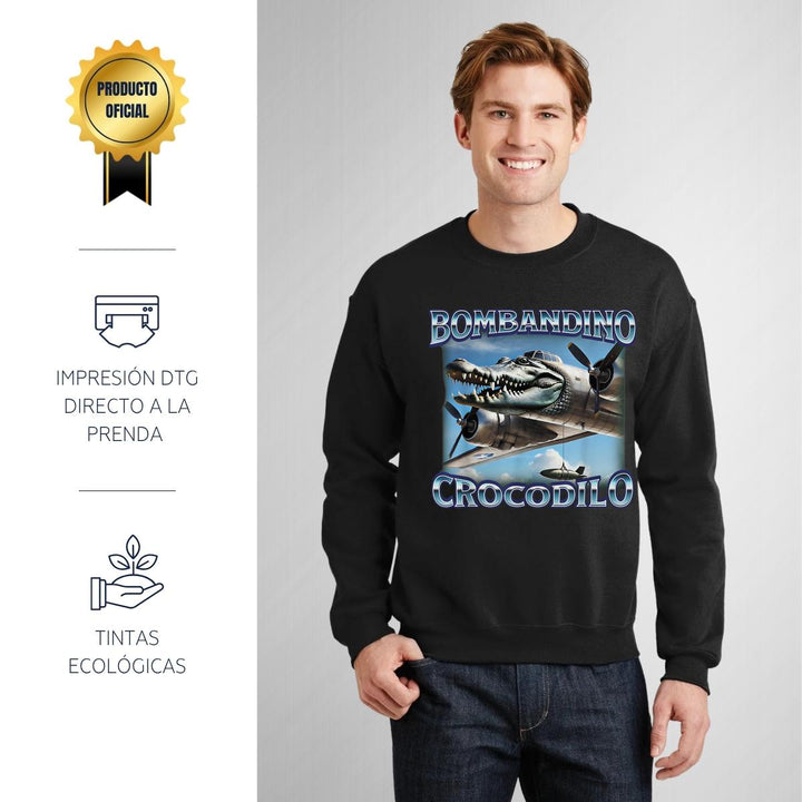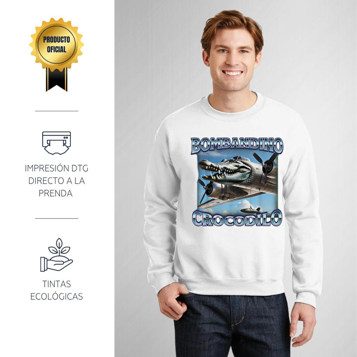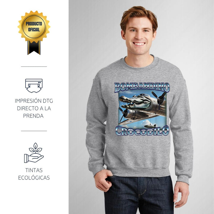 Sudadera de adulto cuello redondo sin gorro o capucha, para hombre nueva, diseño Brainrot Bombardino Cocodrilo original impreso con tecnología DTG (directo a la prenda) tacto cero, uso casual o deportiva, 50% algodón y 50% poliéster, estructura sin costura en los costados con ajuste clásico. Colores de sudadera: Negro, Blanco, Azul Marino, Gris.