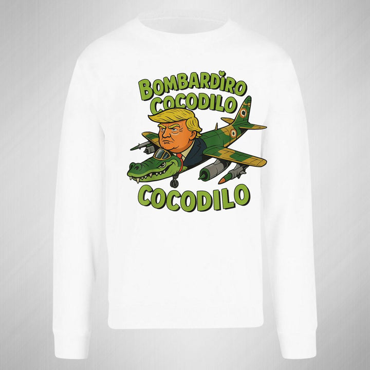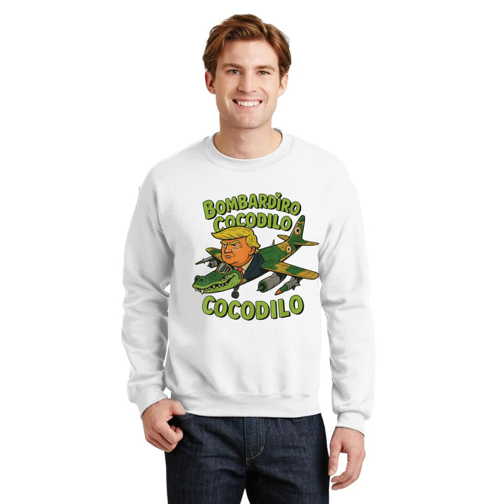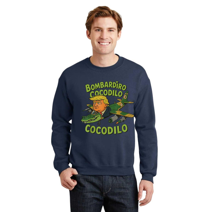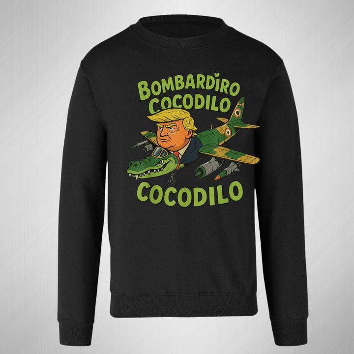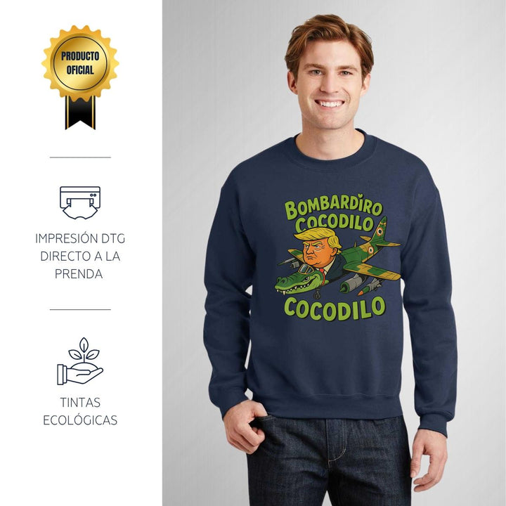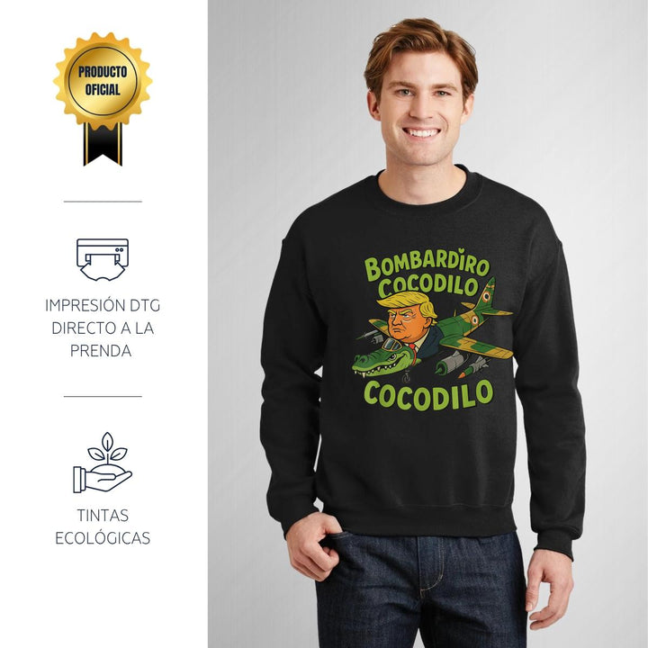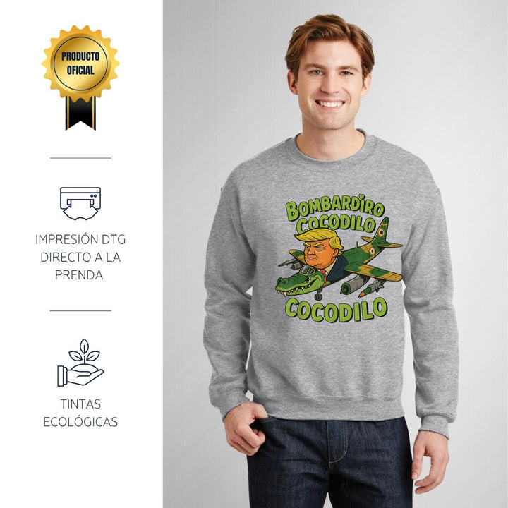 Sudadera de adulto cuello redondo sin gorro o capucha, para hombre nueva, diseño Brainrot Bombardiro Crocodilo original impreso con tecnología DTG (directo a la prenda) tacto cero, uso casual o deportiva, 50% algodón y 50% poliéster, estructura sin costura en los costados con ajuste clásico. Colores de sudadera: Negro, Blanco, Azul Marino, Gris.