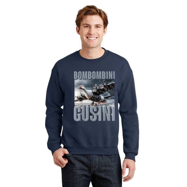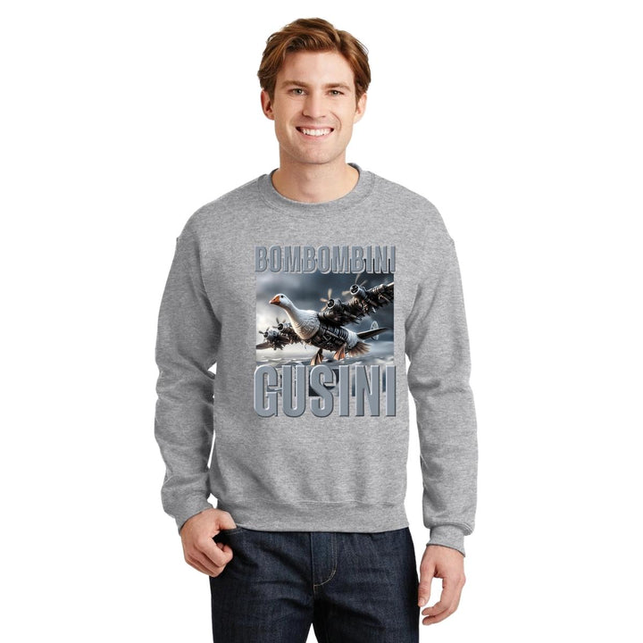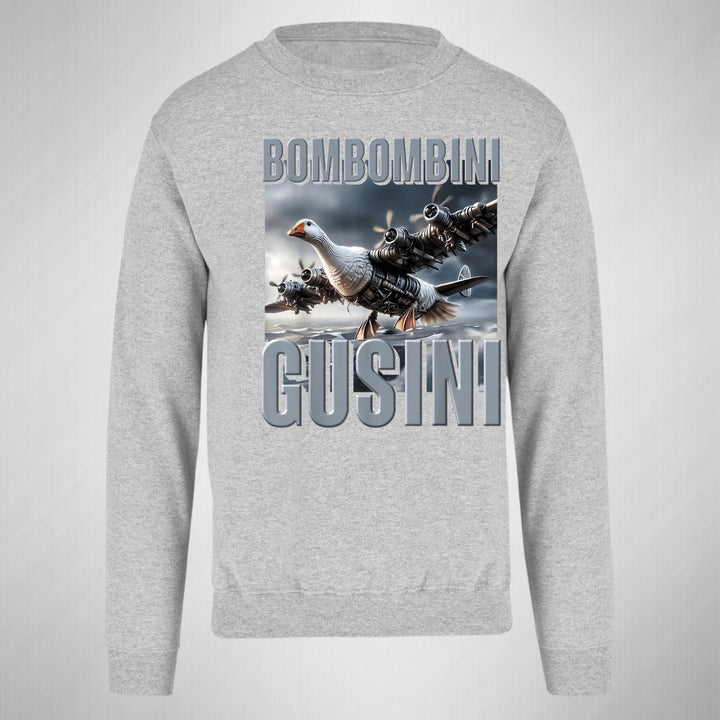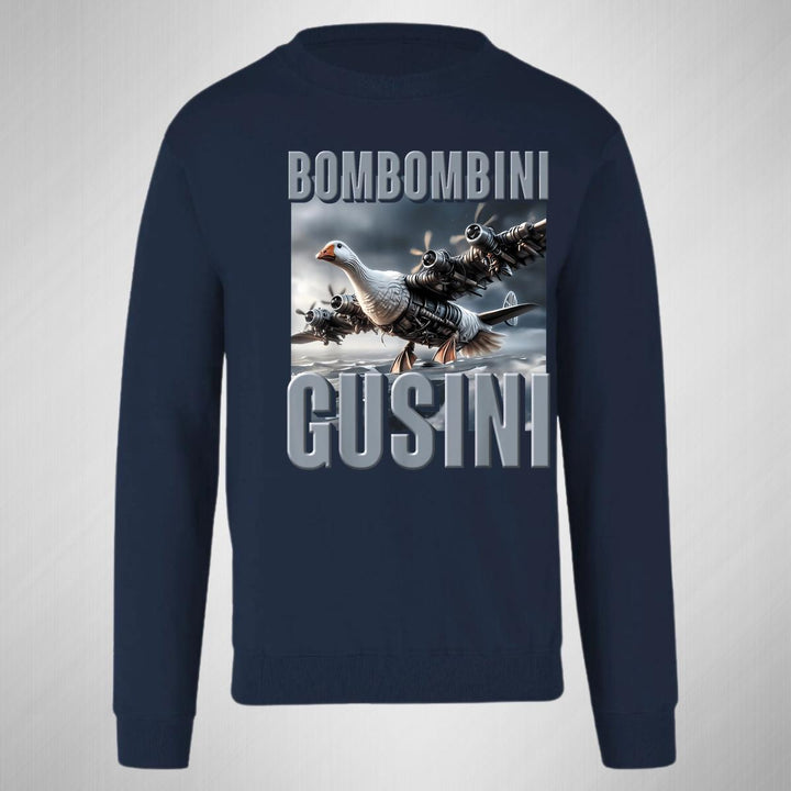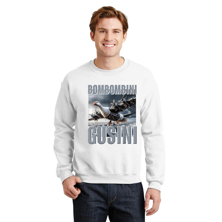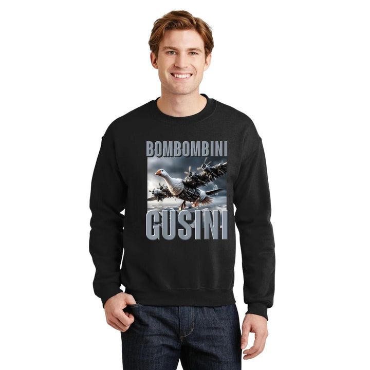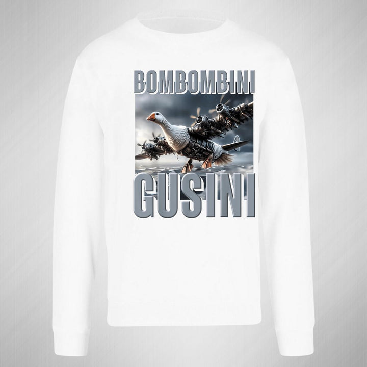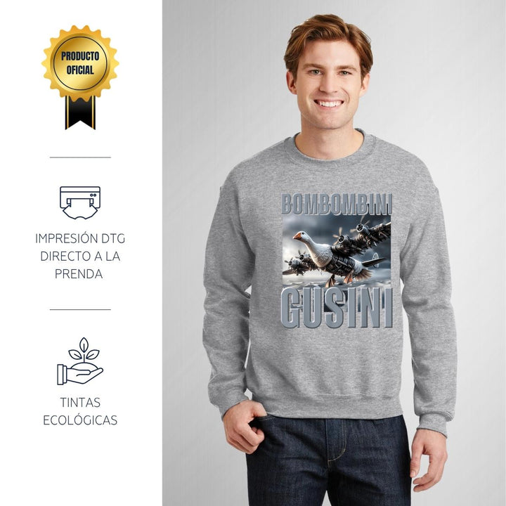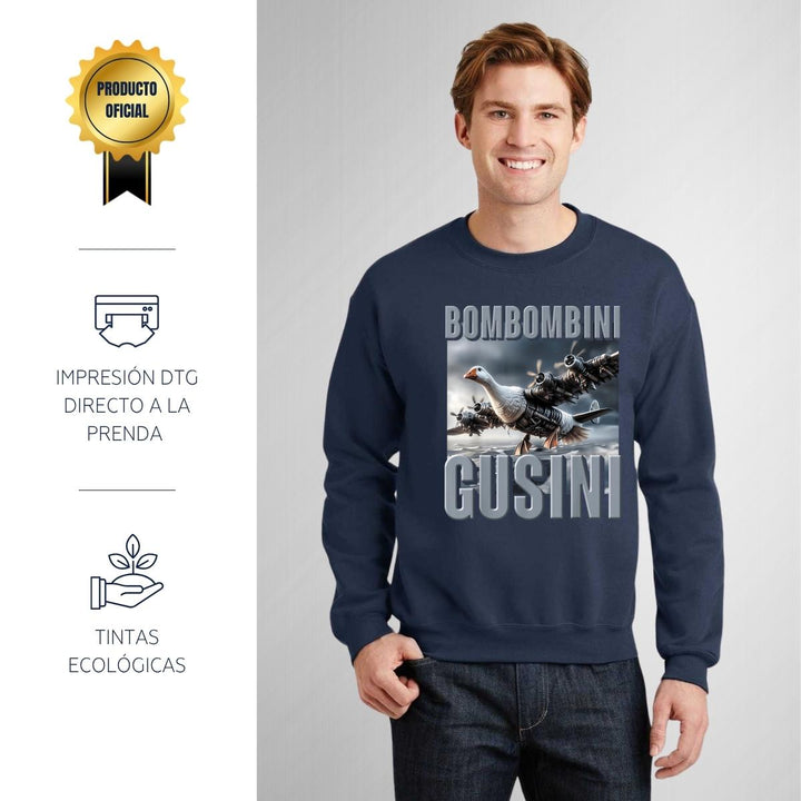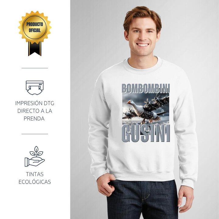 Sudadera de adulto cuello redondo sin gorro o capucha, para hombre nueva, diseño Brainrot Bombombini Gusini original impreso con tecnología DTG (directo a la prenda) tacto cero, uso casual o deportiva, 50% algodón y 50% poliéster, estructura sin costura en los costados con ajuste clásico. Colores de sudadera: Negro, Blanco, Azul Marino, Gris.