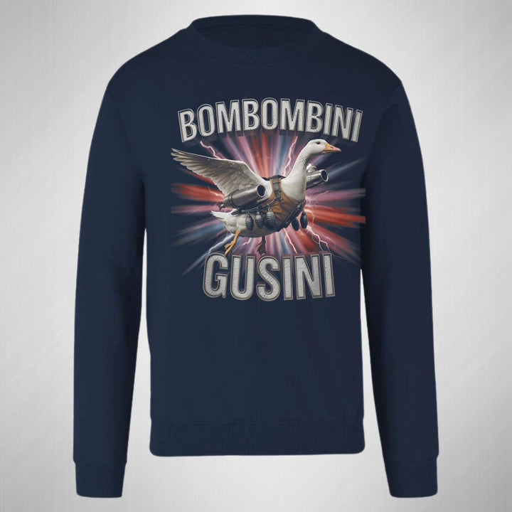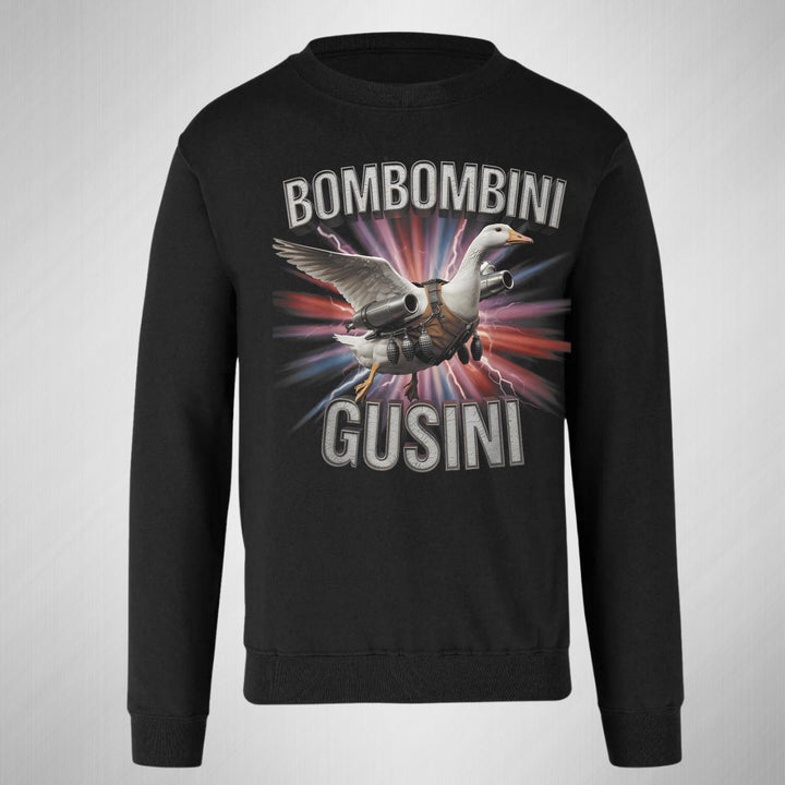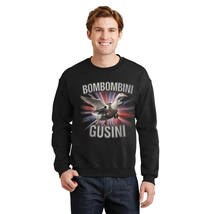 Sudadera de adulto cuello redondo sin gorro o capucha, para hombre nueva, diseño Brainrot Bombombini Gusini original impreso con tecnología DTG (directo a la prenda) tacto cero, uso casual o deportiva, 50% algodón y 50% poliéster, estructura sin costura en los costados con ajuste clásico. Colores de sudadera: Negro, Azul Marino.
