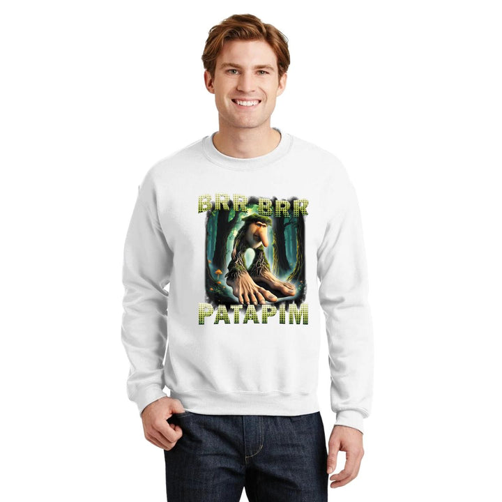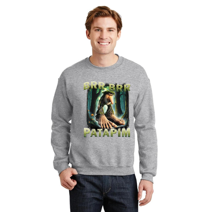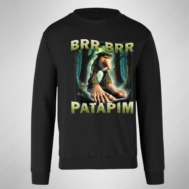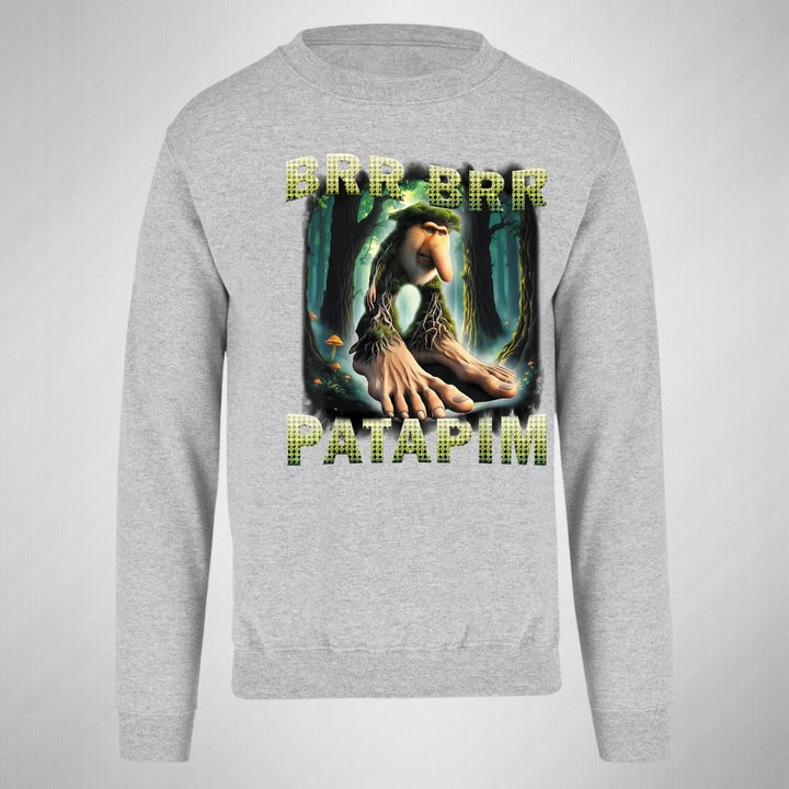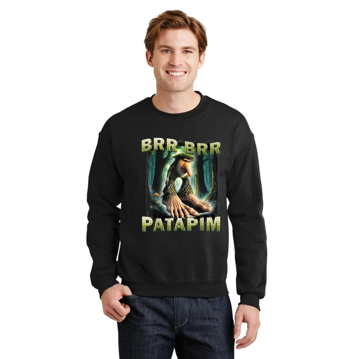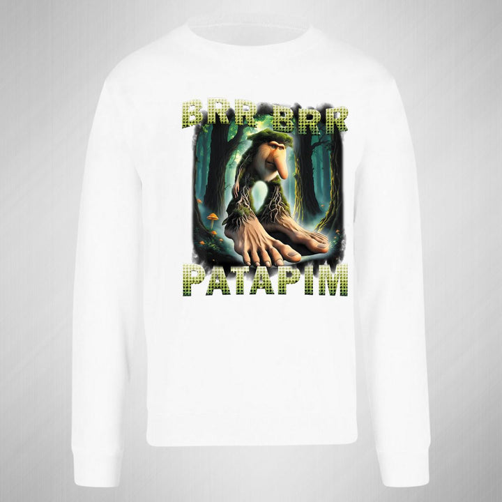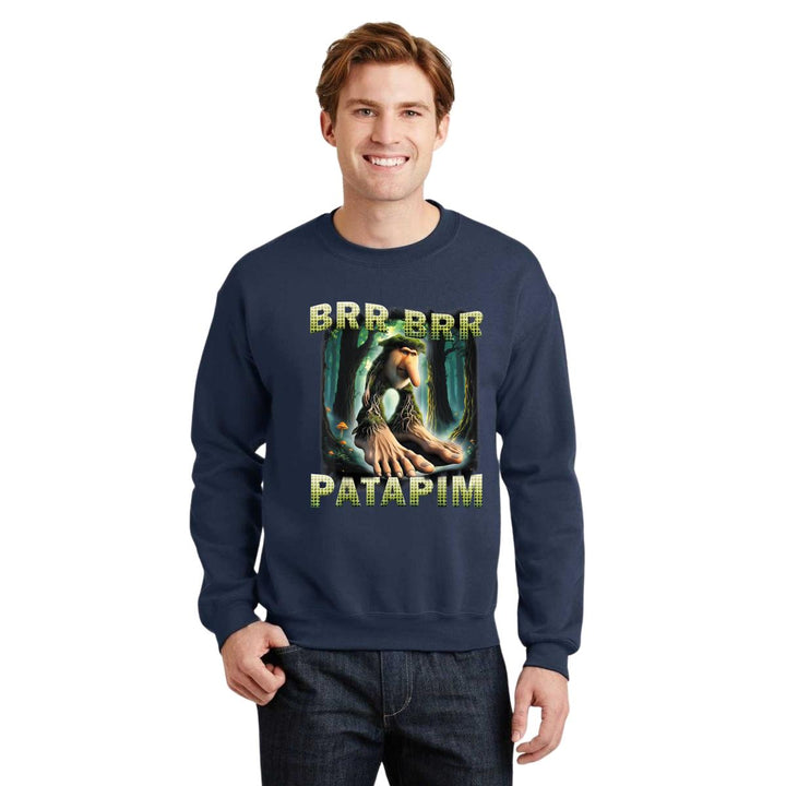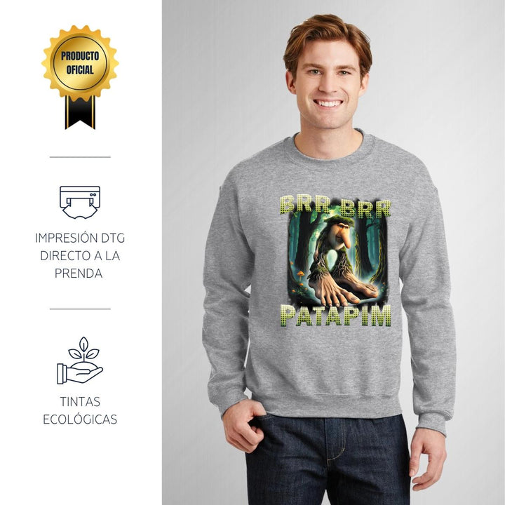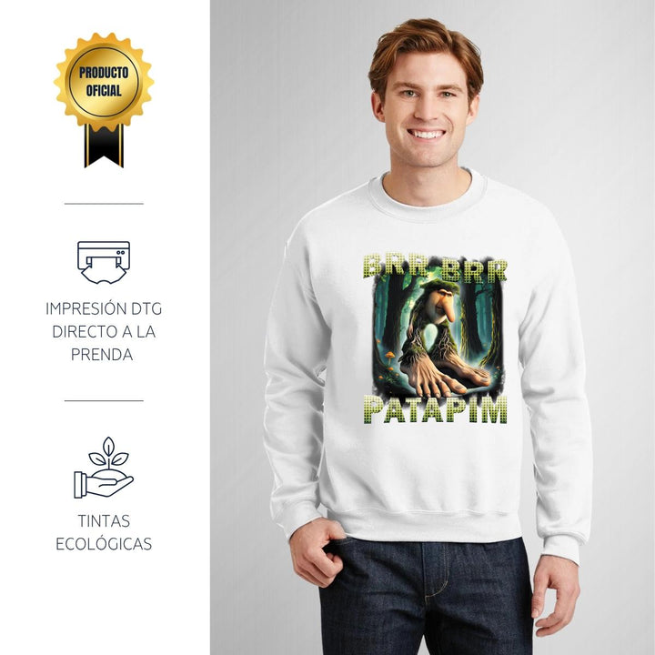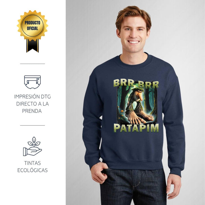 Sudadera de adulto cuello redondo sin gorro o capucha, para hombre nueva, diseño Brainrot Brr Brr Patapim original impreso con tecnología DTG (directo a la prenda) tacto cero, uso casual o deportiva, 50% algodón y 50% poliéster, estructura sin costura en los costados con ajuste clásico. Colores de sudadera: Negro, Blanco, Azul Marino, Gris.