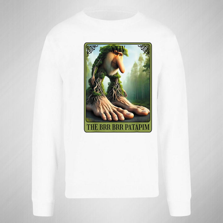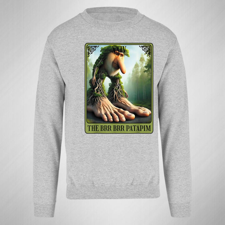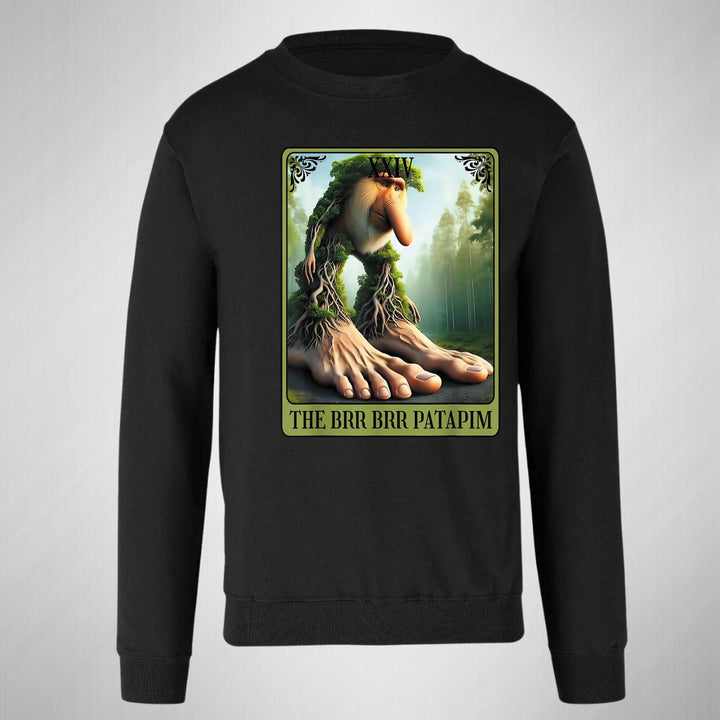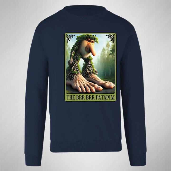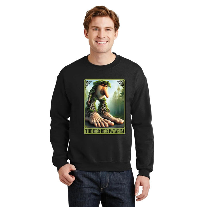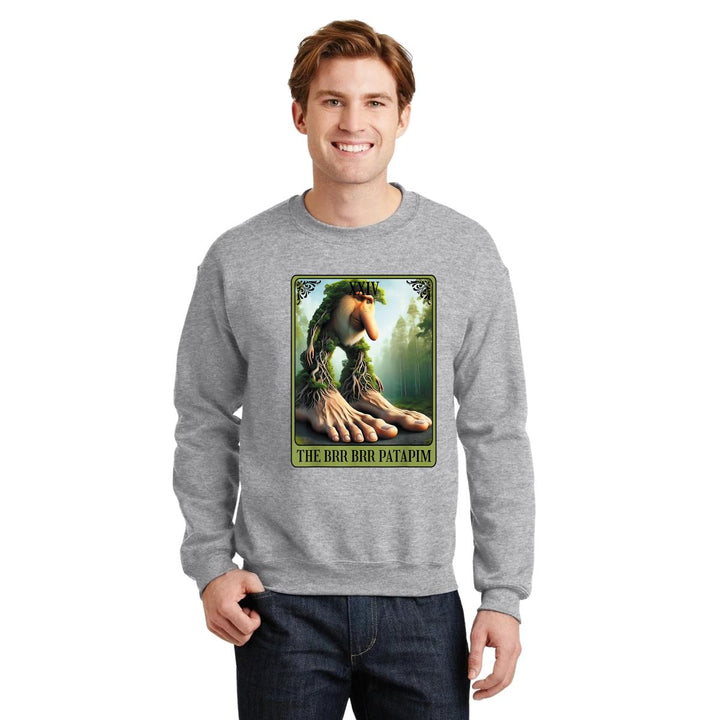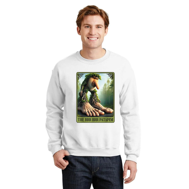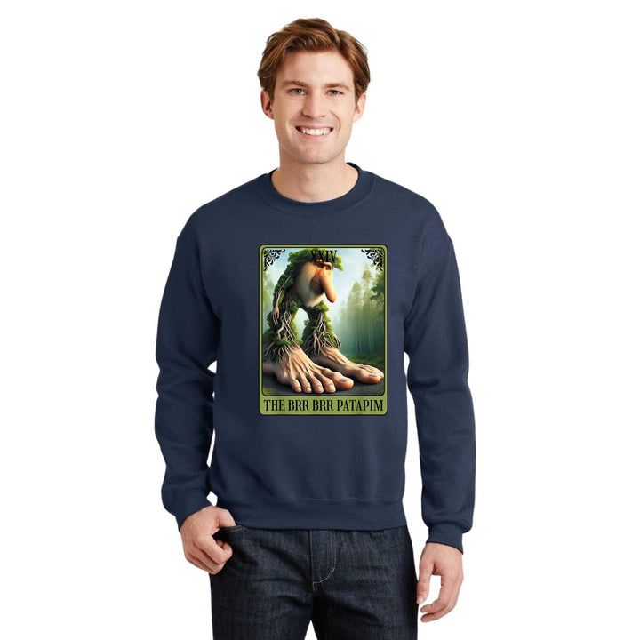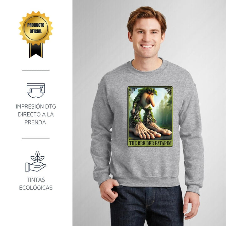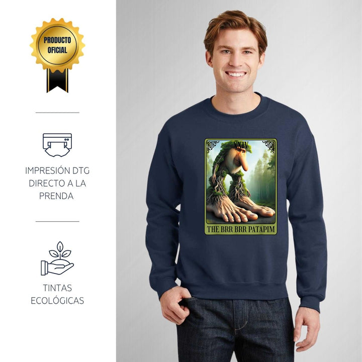 Sudadera de adulto cuello redondo sin gorro o capucha, para hombre nueva, diseño Brainrot Brr Brr Patapim original impreso con tecnología DTG (directo a la prenda) tacto cero, uso casual o deportiva, 50% algodón y 50% poliéster, estructura sin costura en los costados con ajuste clásico. Colores de sudadera: Negro, Blanco, Azul Marino, Gris.