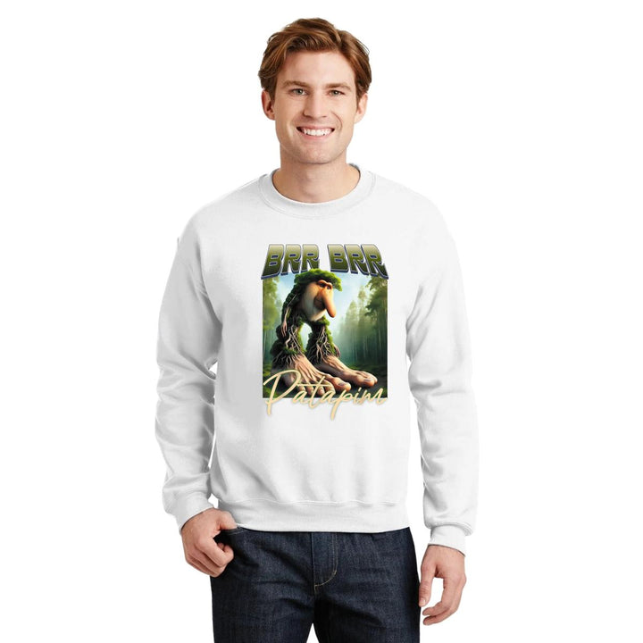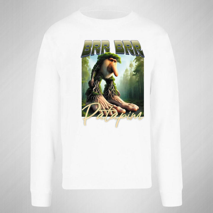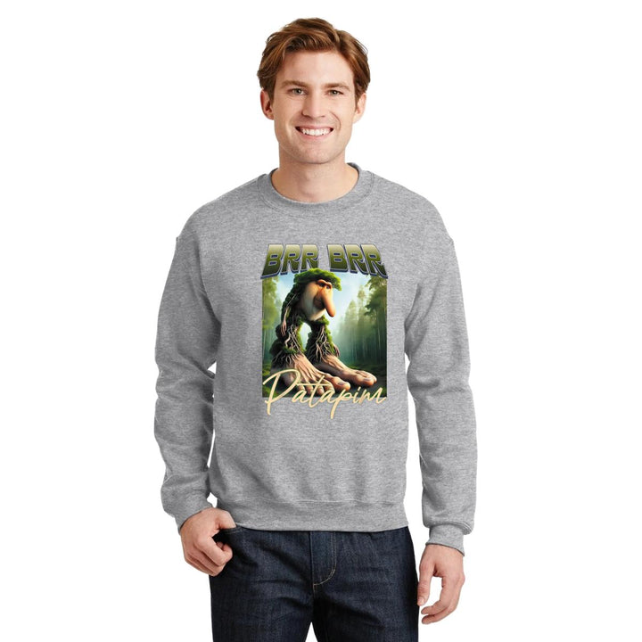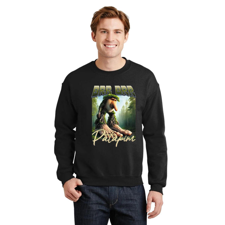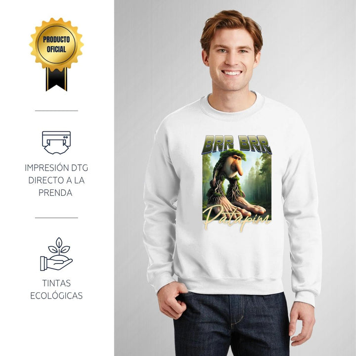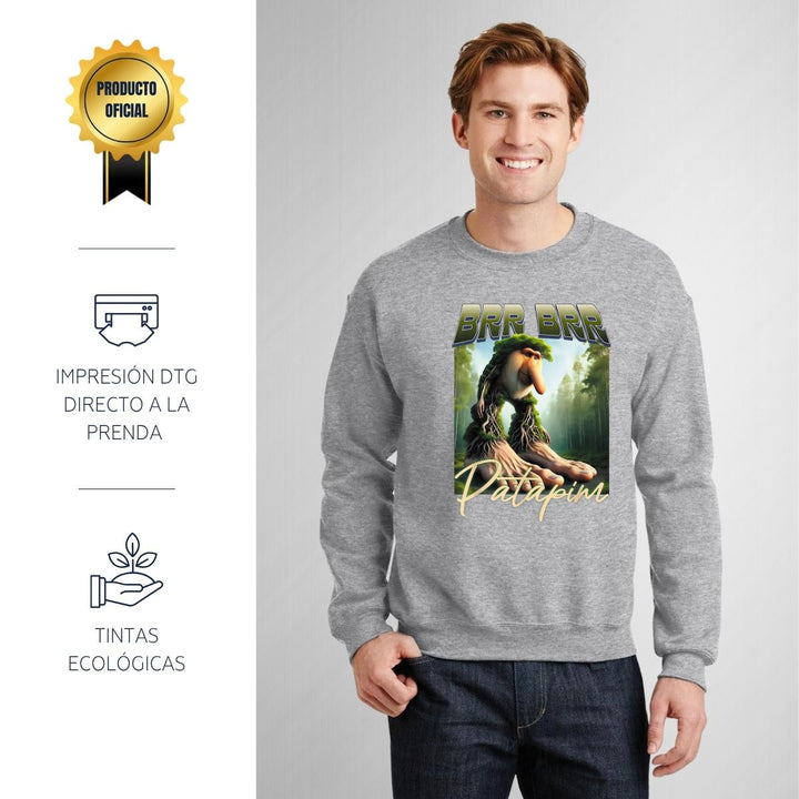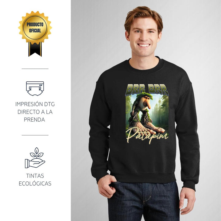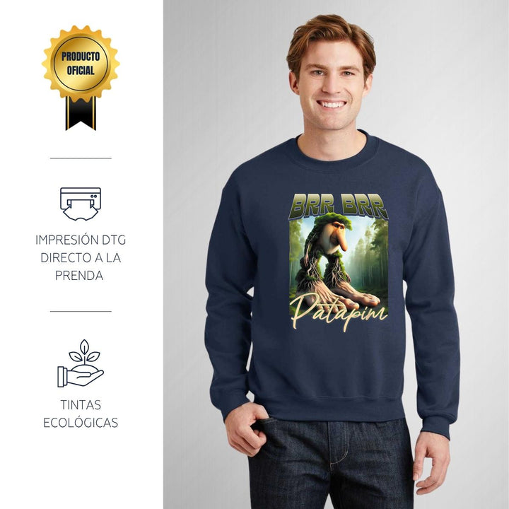 Sudadera de adulto cuello redondo sin gorro o capucha, para hombre nueva, diseño Brainrot Brr Brr Patapim original impreso con tecnología DTG (directo a la prenda) tacto cero, uso casual o deportiva, 50% algodón y 50% poliéster, estructura sin costura en los costados con ajuste clásico. Colores de sudadera: Negro, Blanco, Azul Marino, Gris.