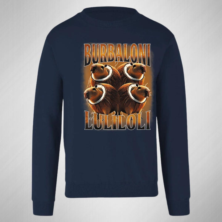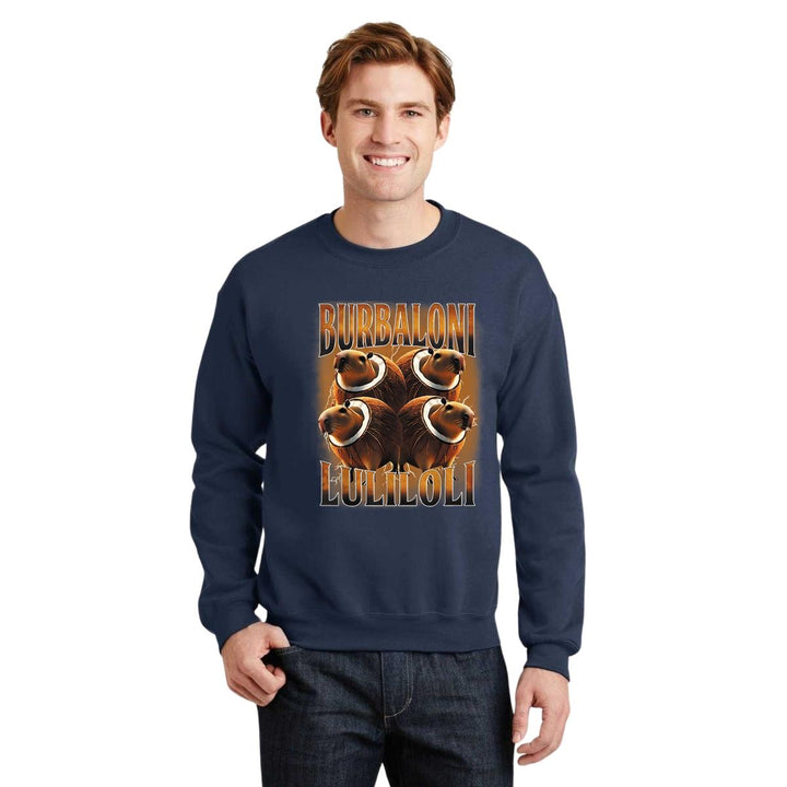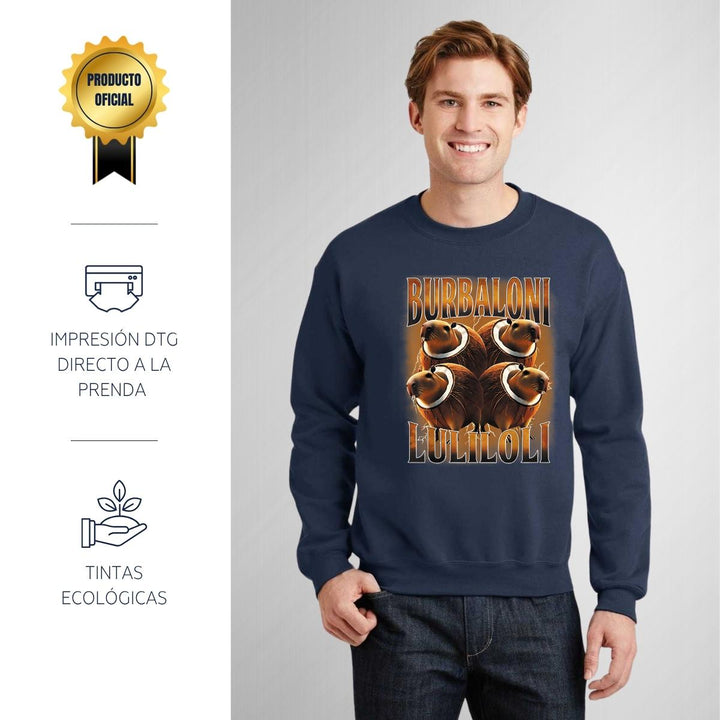 Sudadera de adulto cuello redondo sin gorro o capucha, para hombre nueva, diseño Brainrot Burbaloni Luliloli original impreso con tecnología DTG (directo a la prenda) tacto cero, uso casual o deportiva, 50% algodón y 50% poliéster, estructura sin costura en los costados con ajuste clásico. Colores de sudadera: Negro, Blanco, Azul Marino, Gris.