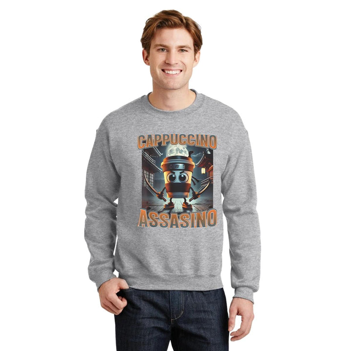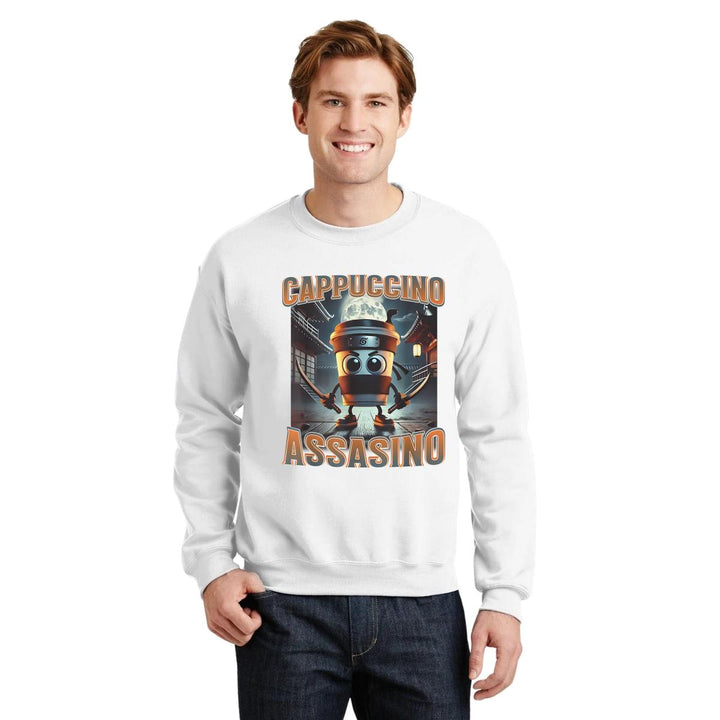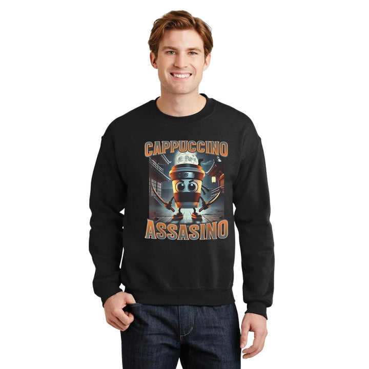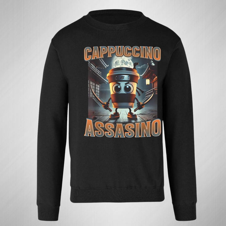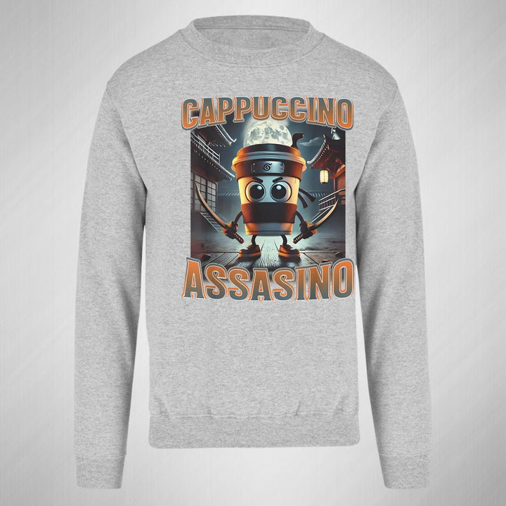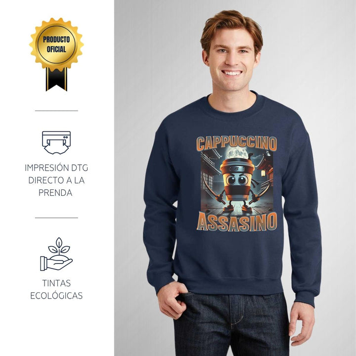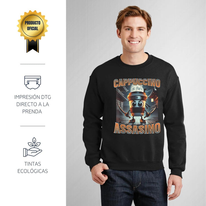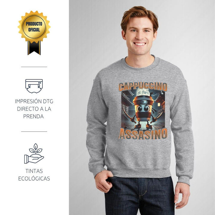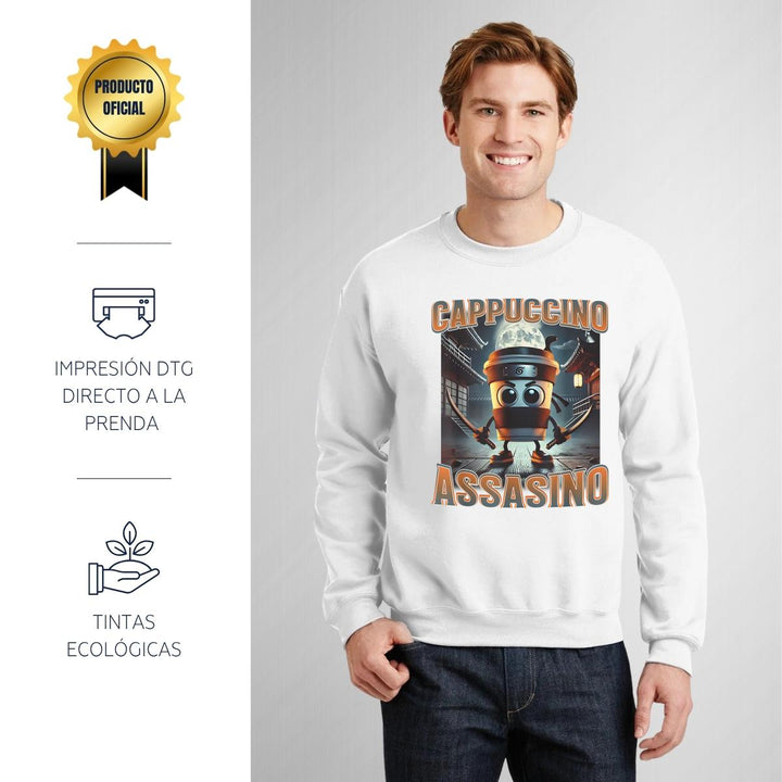 Sudadera de adulto cuello redondo sin gorro o capucha, para hombre nueva, diseño Brainrot Cappuccino Assassino original impreso con tecnología DTG (directo a la prenda) tacto cero, uso casual o deportiva, 50% algodón y 50% poliéster, estructura sin costura en los costados con ajuste clásico. Colores de sudadera: Negro, Blanco, Azul Marino, Gris.