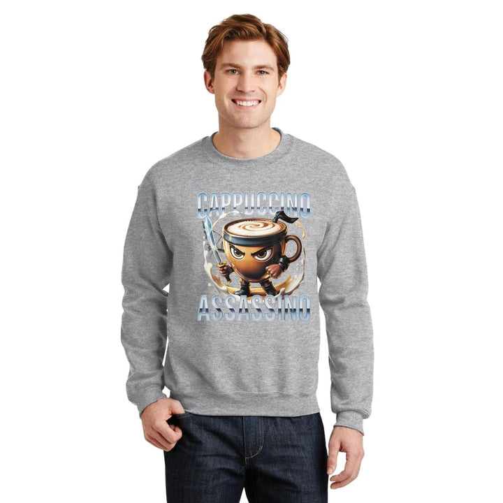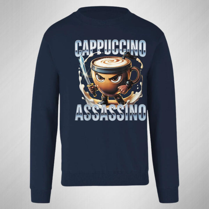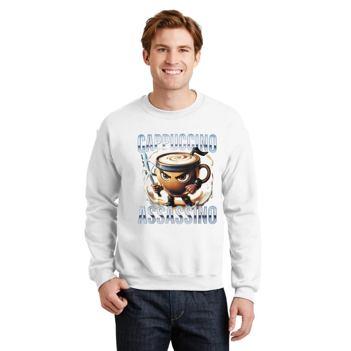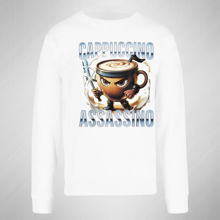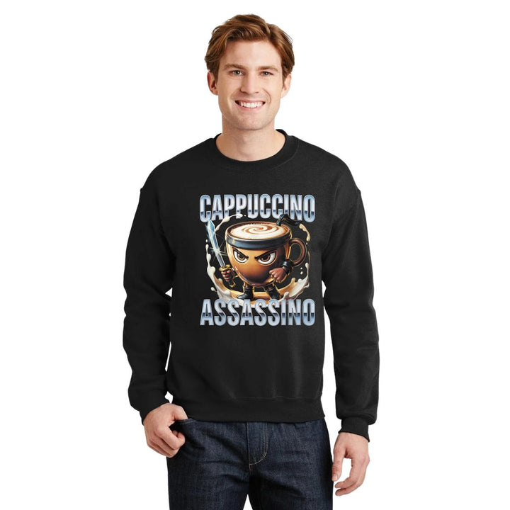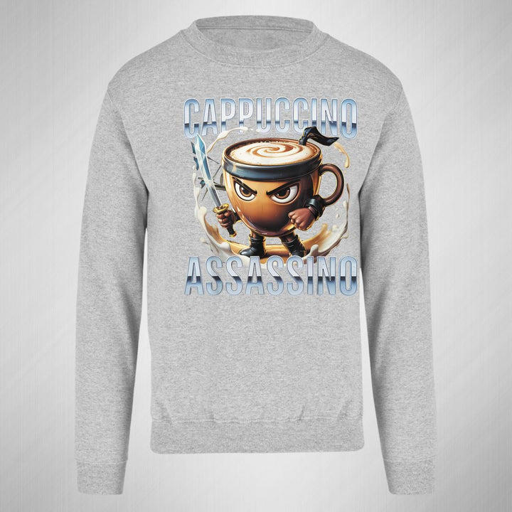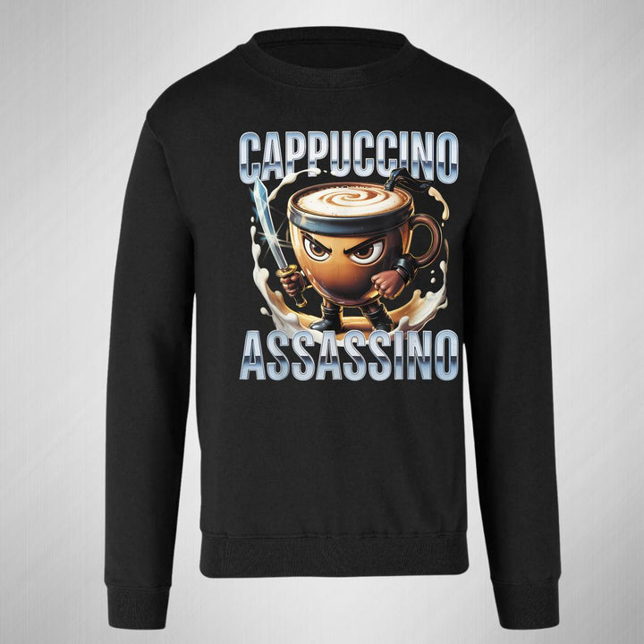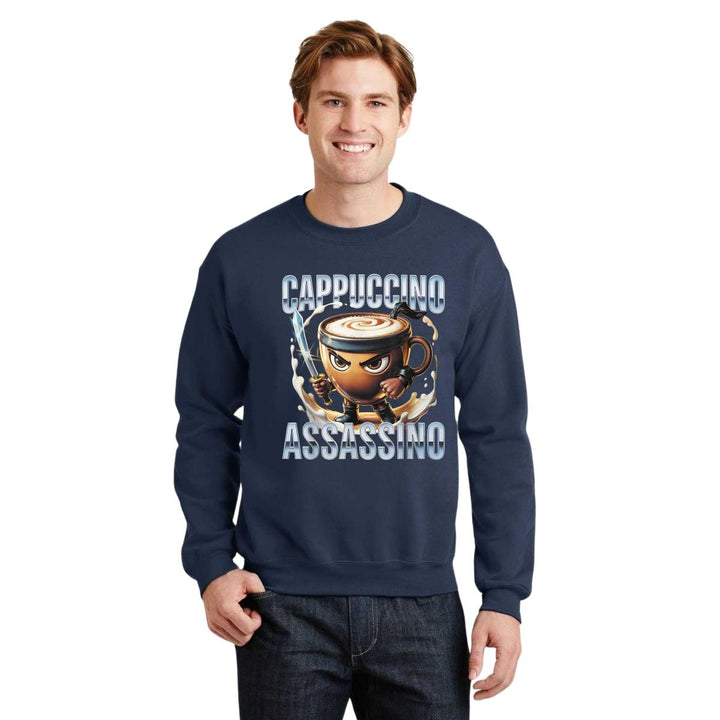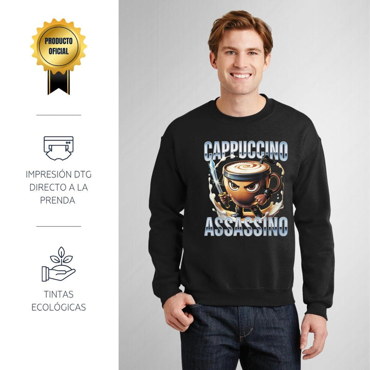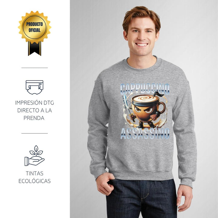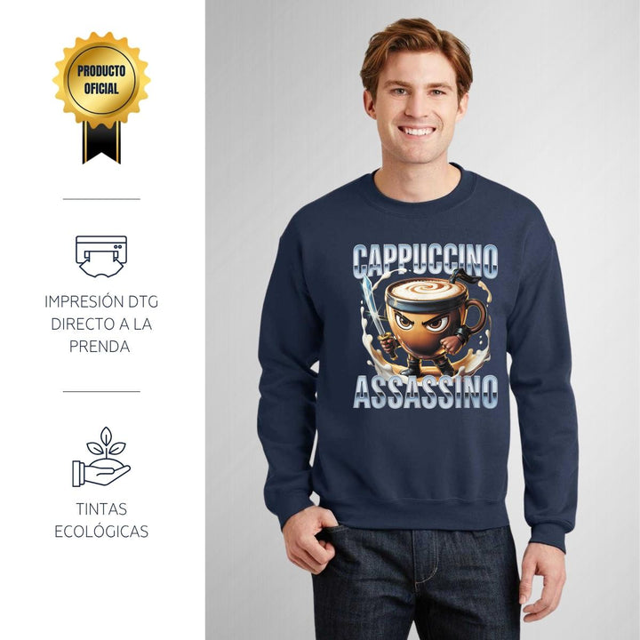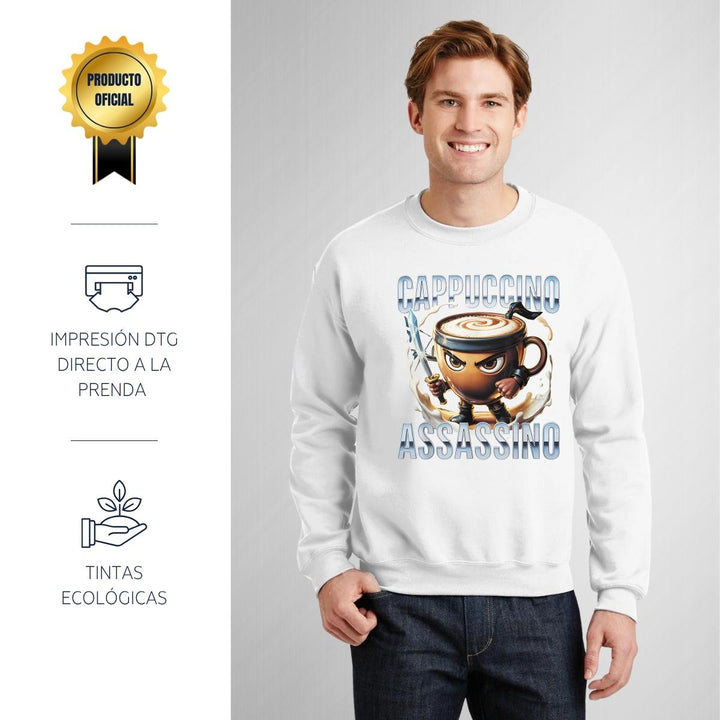 Sudadera de adulto cuello redondo sin gorro o capucha, para hombre nueva, diseño Brainrot Cappuccino Assassino original impreso con tecnología DTG (directo a la prenda) tacto cero, uso casual o deportiva, 50% algodón y 50% poliéster, estructura sin costura en los costados con ajuste clásico. Colores de sudadera: Negro, Blanco, Azul Marino, Gris.