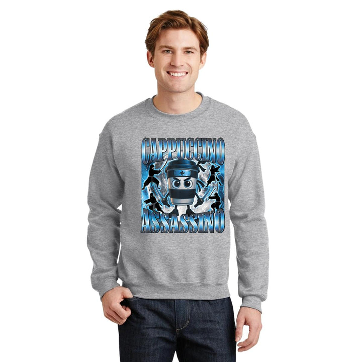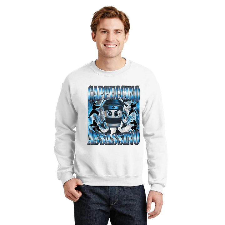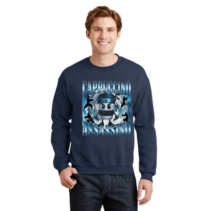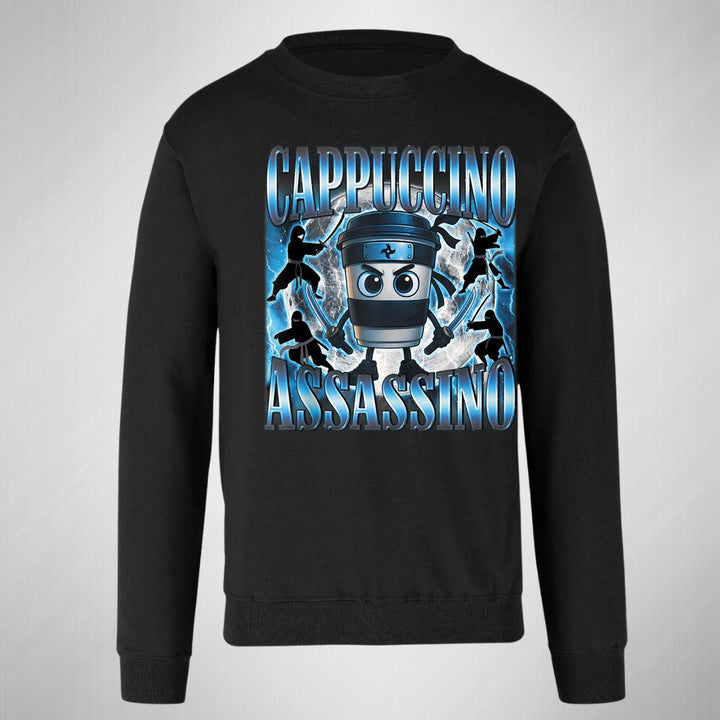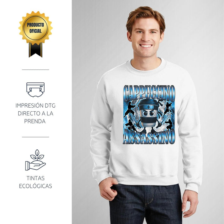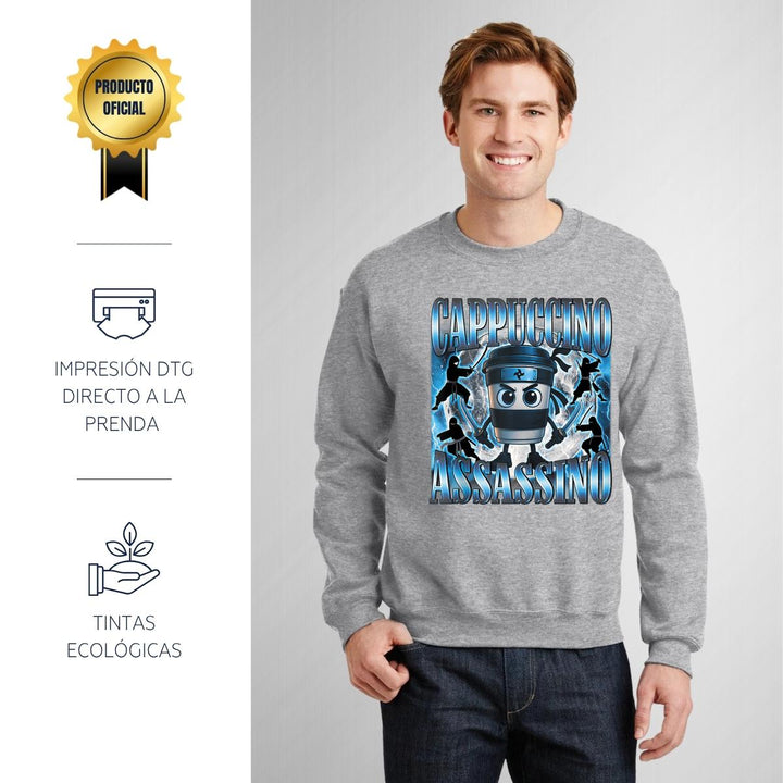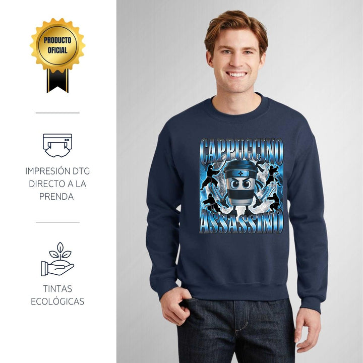 Sudadera de adulto cuello redondo sin gorro o capucha, para hombre nueva, diseño Brainrot Cappuccino Assassino original impreso con tecnología DTG (directo a la prenda) tacto cero, uso casual o deportiva, 50% algodón y 50% poliéster, estructura sin costura en los costados con ajuste clásico. Colores de sudadera: Negro, Blanco, Azul Marino, Gris.