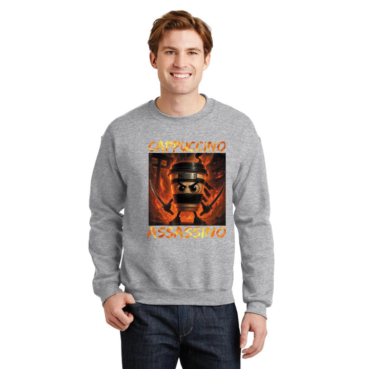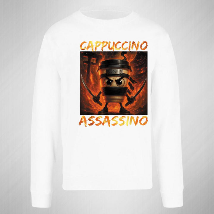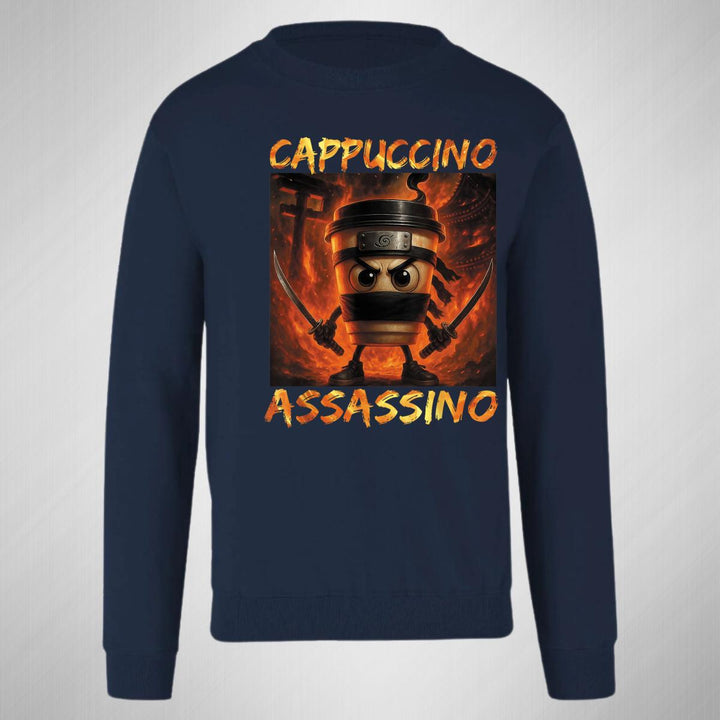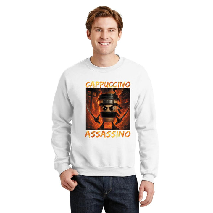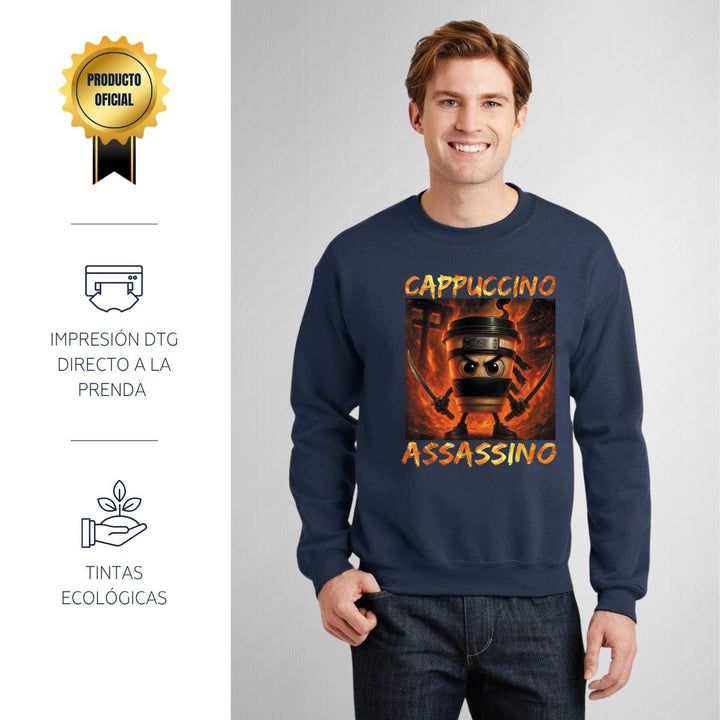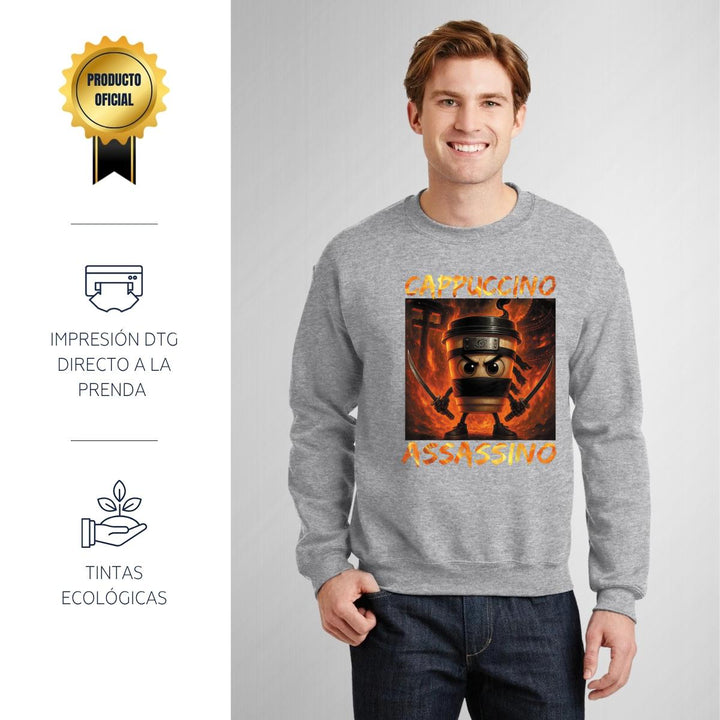 Sudadera de adulto cuello redondo sin gorro o capucha, para hombre nueva, diseño Brainrot Cappuccino Assassino original impreso con tecnología DTG (directo a la prenda) tacto cero, uso casual o deportiva, 50% algodón y 50% poliéster, estructura sin costura en los costados con ajuste clásico. Colores de sudadera: Negro, Blanco, Azul Marino, Gris.