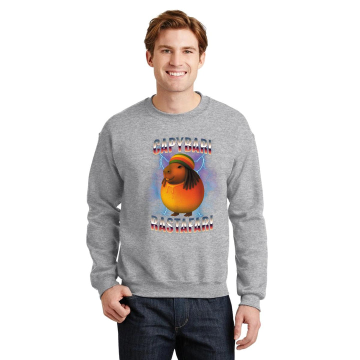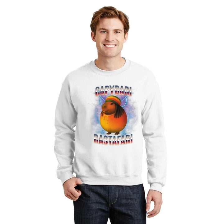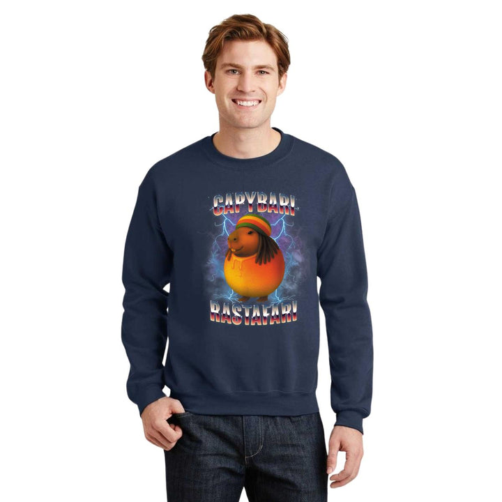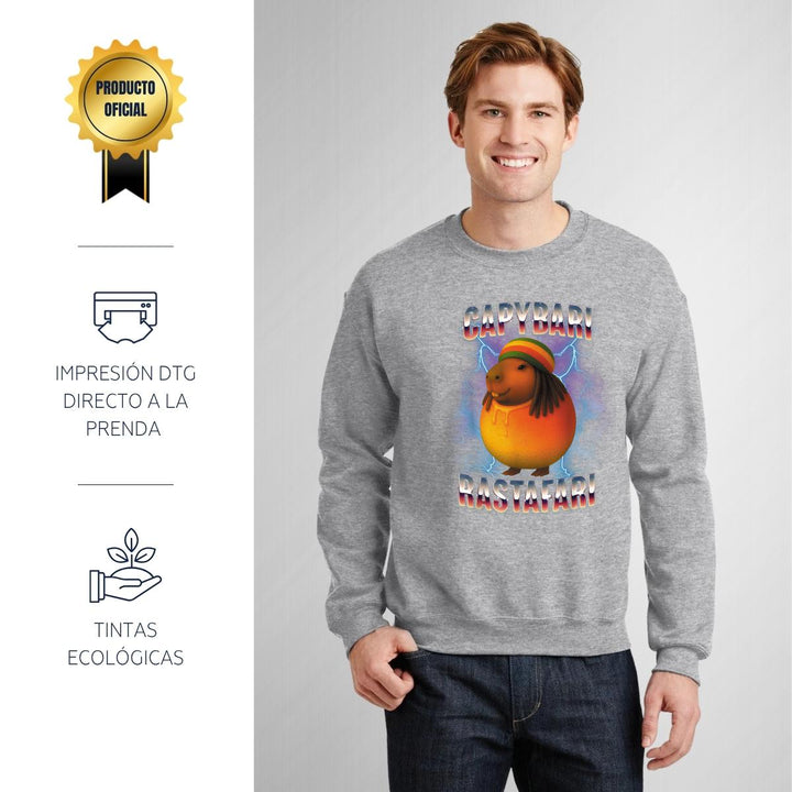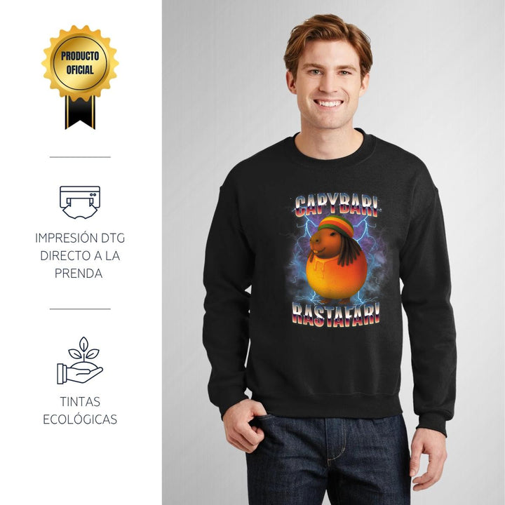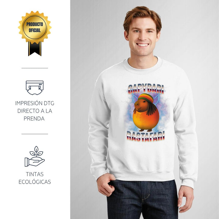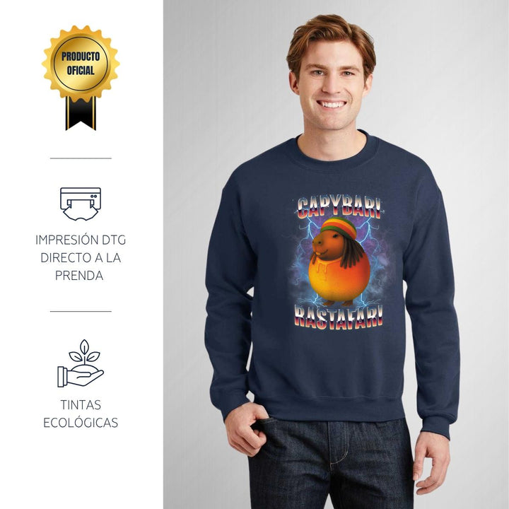 Sudadera de adulto cuello redondo sin gorro o capucha, para hombre nueva, diseño Brainrot Capybari Rastafari original impreso con tecnología DTG (directo a la prenda) tacto cero, uso casual o deportiva, 50% algodón y 50% poliéster, estructura sin costura en los costados con ajuste clásico. Colores de sudadera: Negro, Blanco, Azul Marino, Gris.