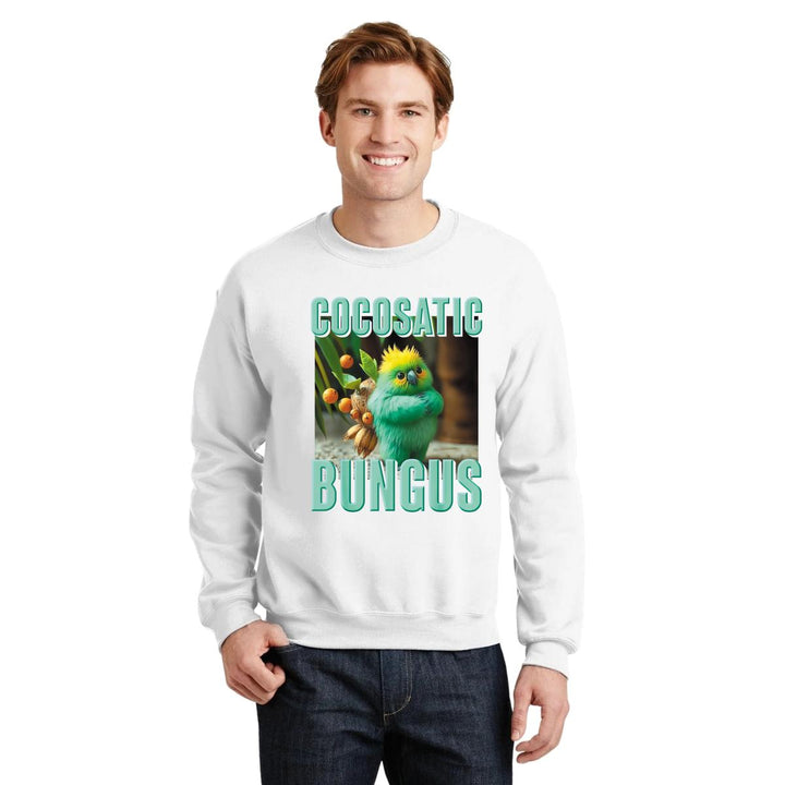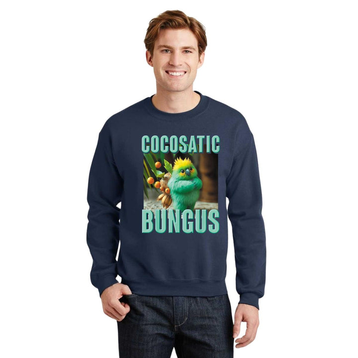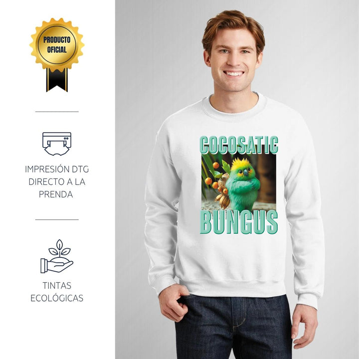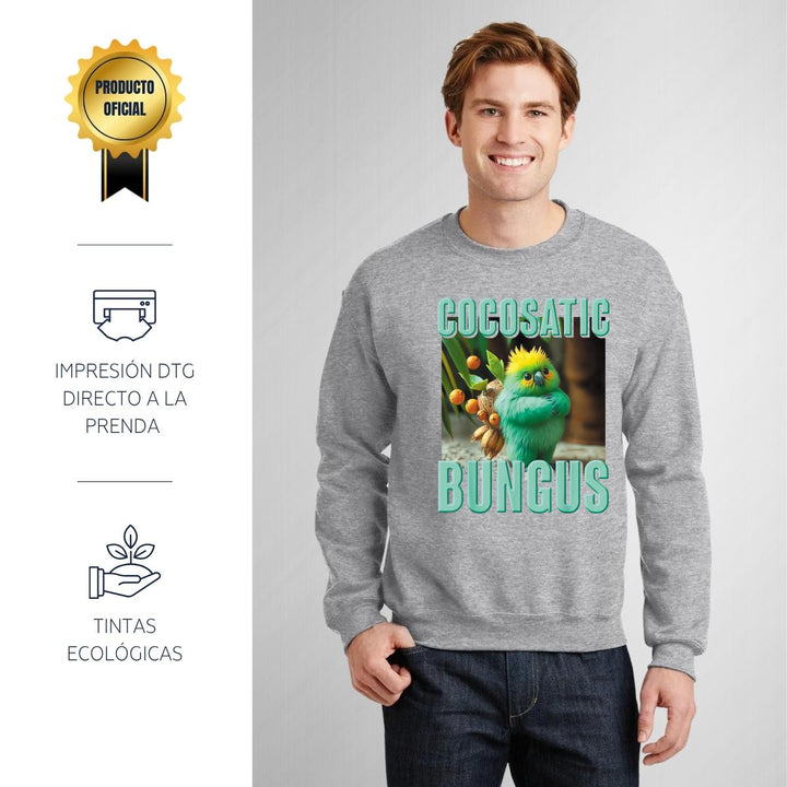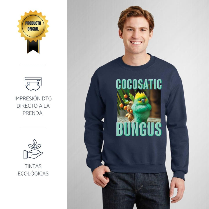 Sudadera de adulto cuello redondo sin gorro o capucha, para hombre nueva, diseño Brainrot Cocosatic Bungus original impreso con tecnología DTG (directo a la prenda) tacto cero, uso casual o deportiva, 50% algodón y 50% poliéster, estructura sin costura en los costados con ajuste clásico. Colores de sudadera: Negro, Blanco, Azul Marino, Gris.