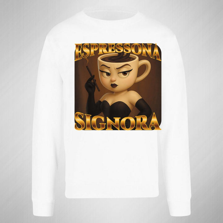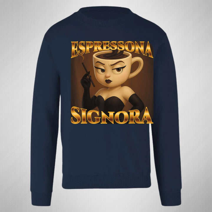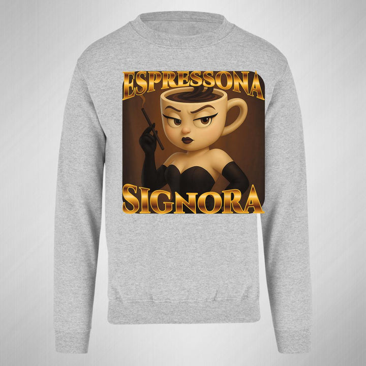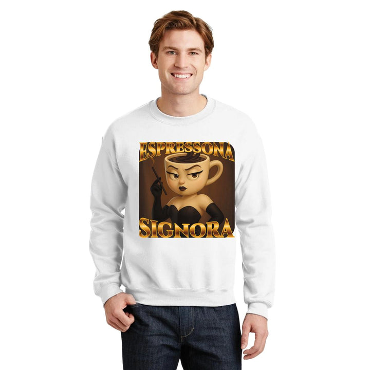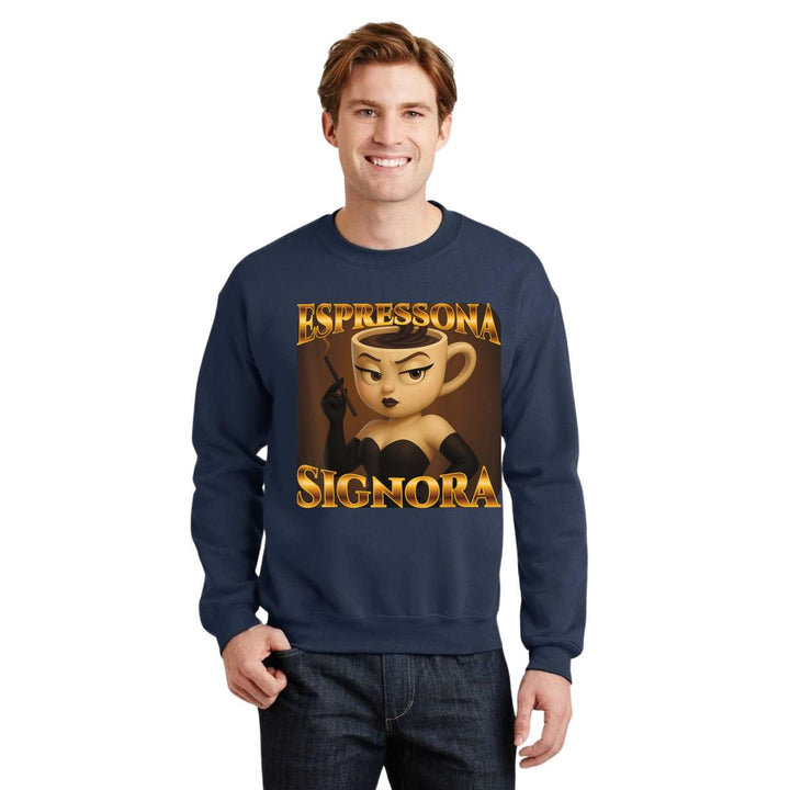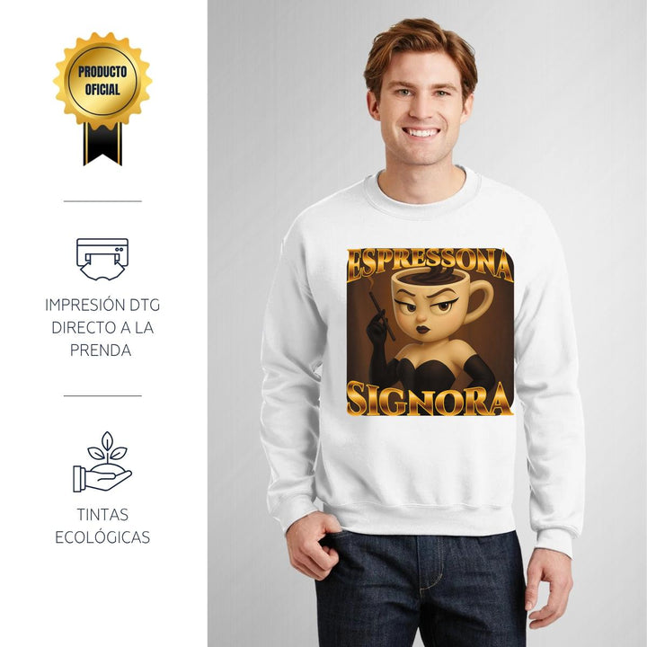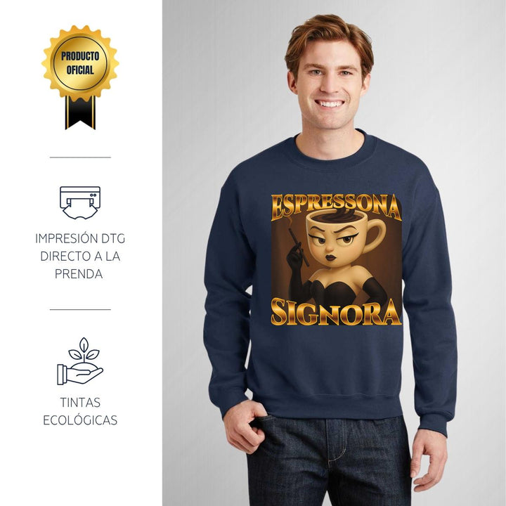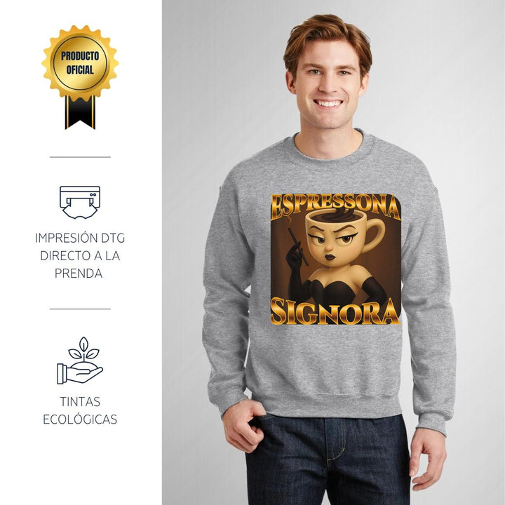 Sudadera de adulto cuello redondo sin gorro o capucha, para hombre nueva, diseño Brainrot Espressona Signora original impreso con tecnología DTG (directo a la prenda) tacto cero, uso casual o deportiva, 50% algodón y 50% poliéster, estructura sin costura en los costados con ajuste clásico. Colores de sudadera: Negro, Blanco, Azul Marino, Gris.