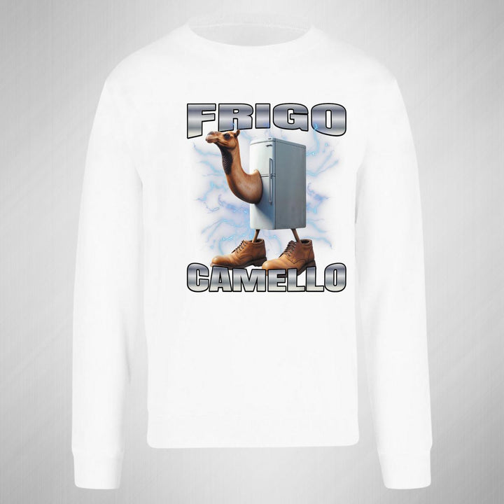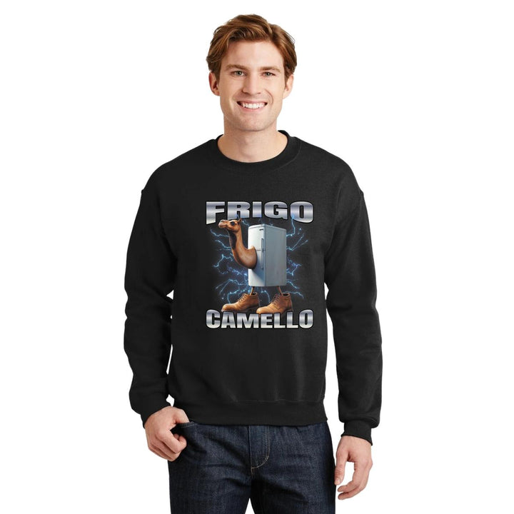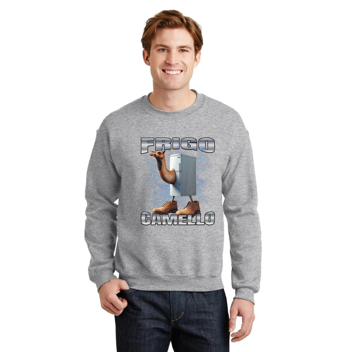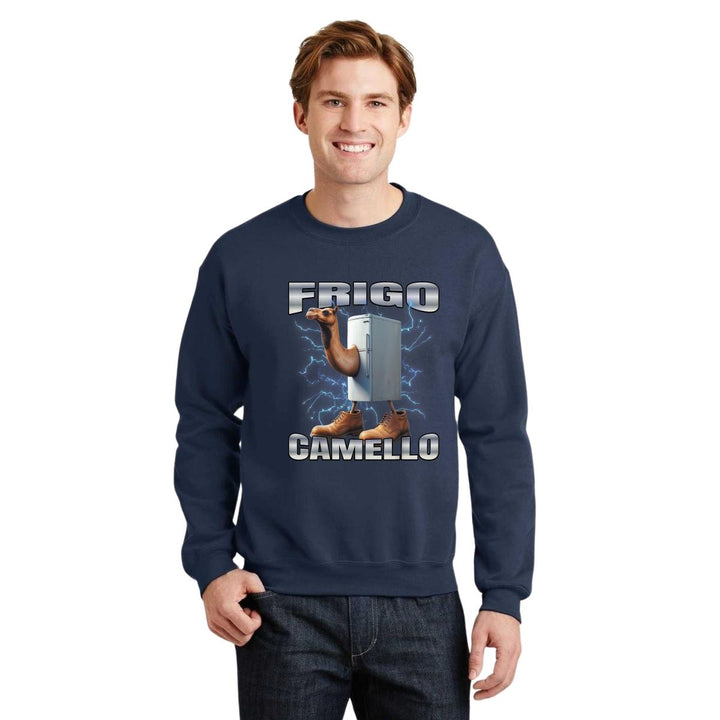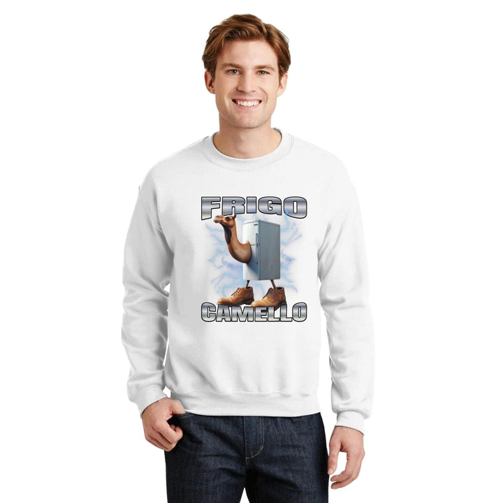 Sudadera de adulto cuello redondo sin gorro o capucha, para hombre nueva, diseño Brainrot Frigo Camello original impreso con tecnología DTG (directo a la prenda) tacto cero, uso casual o deportiva, 50% algodón y 50% poliéster, estructura sin costura en los costados con ajuste clásico. Colores de sudadera: Negro, Blanco, Azul Marino, Gris.