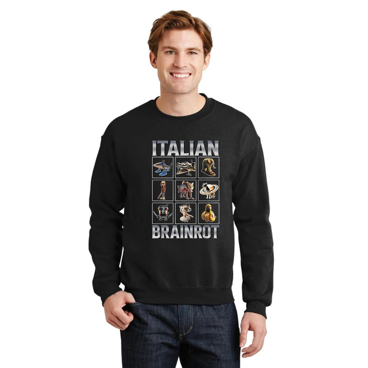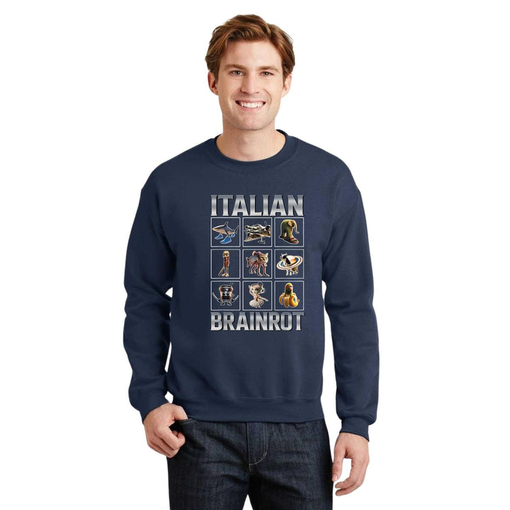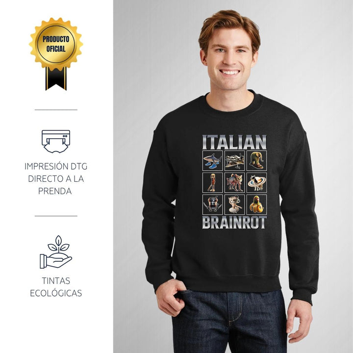 Sudadera de adulto cuello redondo sin gorro o capucha, para hombre nueva, diseño Brainrot Italianos original impreso con tecnología DTG (directo a la prenda) tacto cero, uso casual o deportiva, 50% algodón y 50% poliéster, estructura sin costura en los costados con ajuste clásico. Colores de sudadera: Negro, Azul Marino.