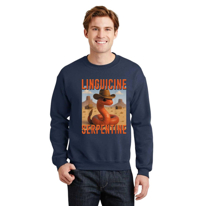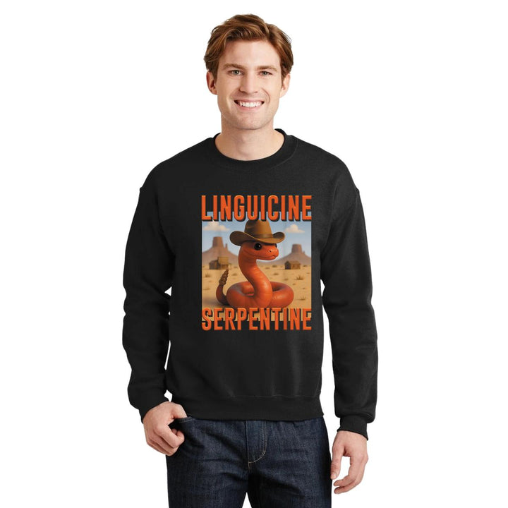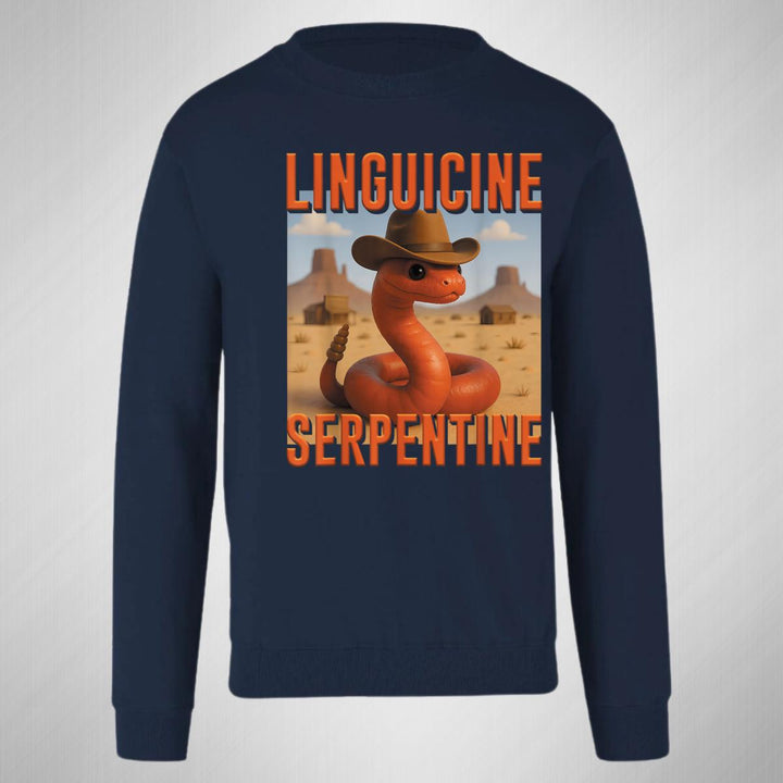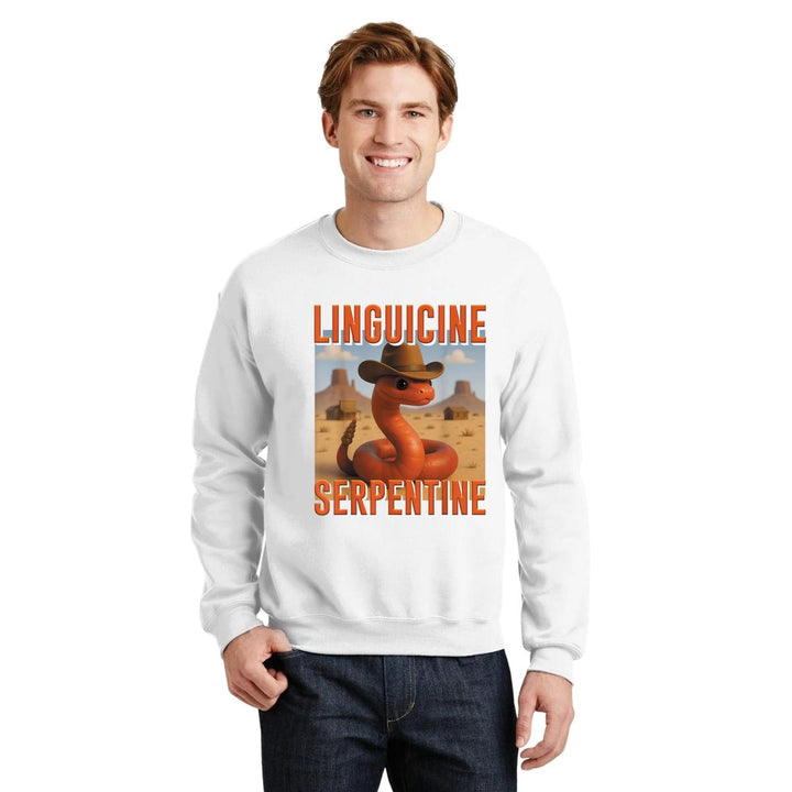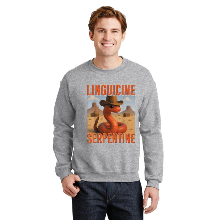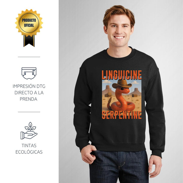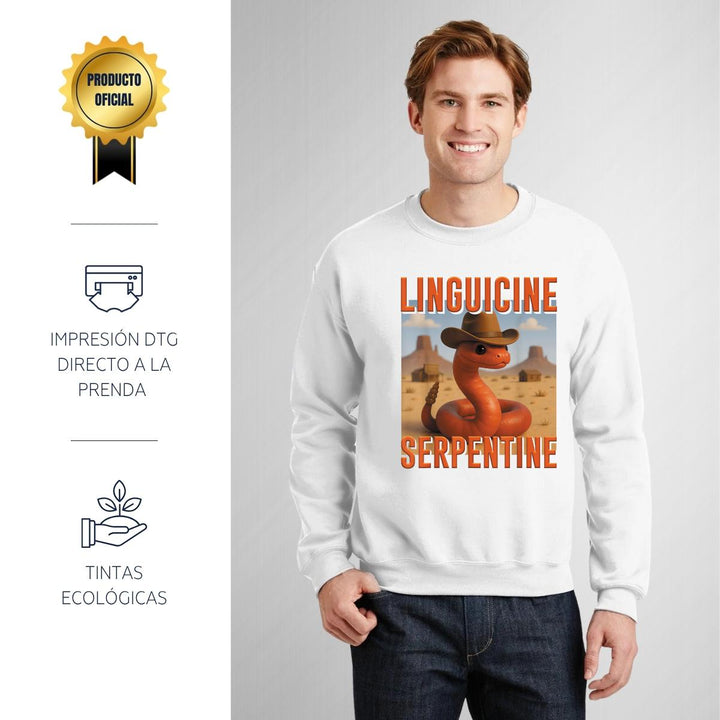 Sudadera de adulto cuello redondo sin gorro o capucha, para hombre nueva, diseño Brainrot Linguicine Serpentine original impreso con tecnología DTG (directo a la prenda) tacto cero, uso casual o deportiva, 50% algodón y 50% poliéster, estructura sin costura en los costados con ajuste clásico. Colores de sudadera: Negro, Blanco, Azul Marino, Gris.