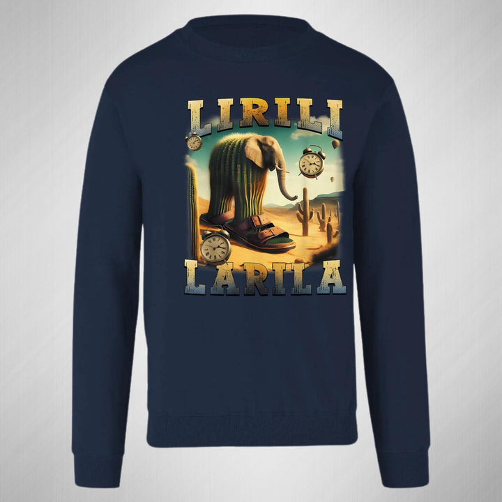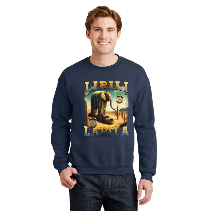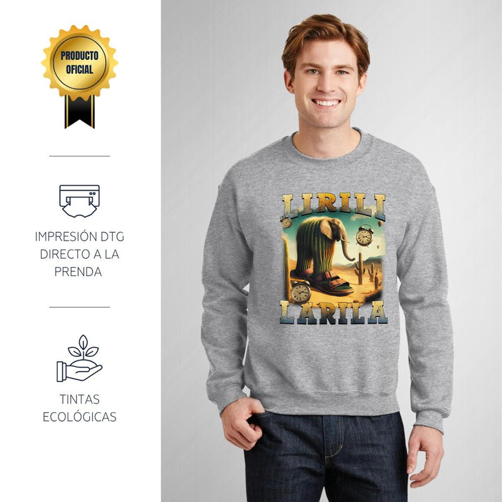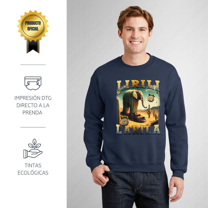 Sudadera de adulto cuello redondo sin gorro o capucha, para hombre nueva, diseño Brainrot Lirili Larila original impreso con tecnología DTG (directo a la prenda) tacto cero, uso casual o deportiva, 50% algodón y 50% poliéster, estructura sin costura en los costados con ajuste clásico. Colores de sudadera: Negro, Blanco, Azul Marino, Gris.