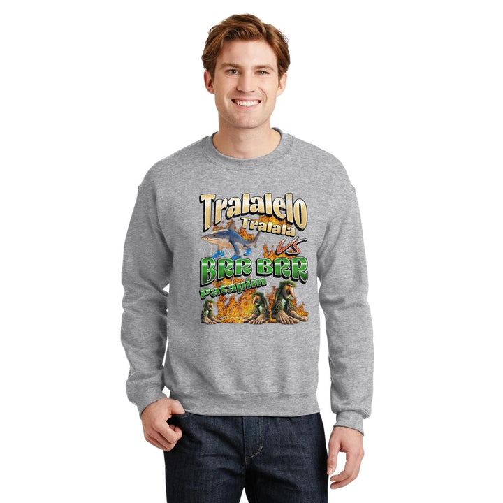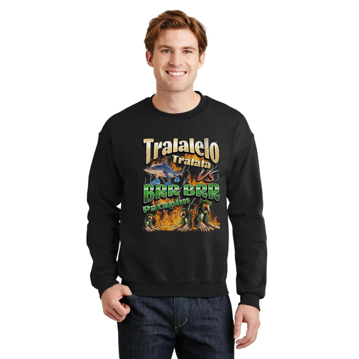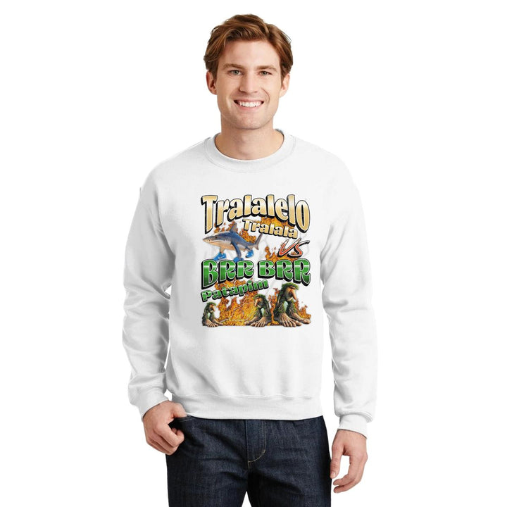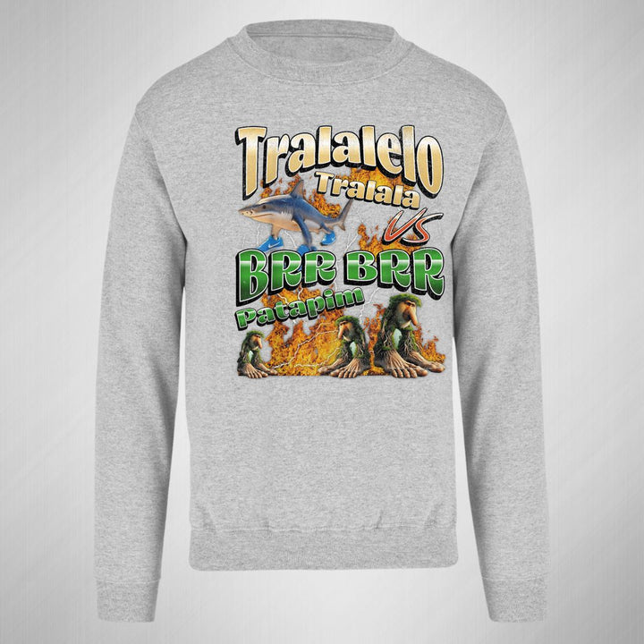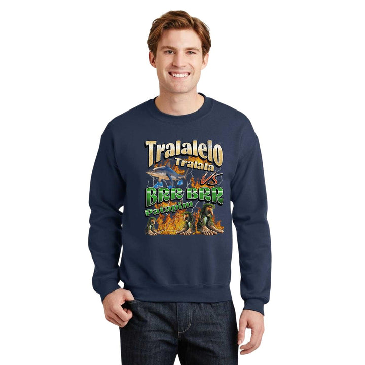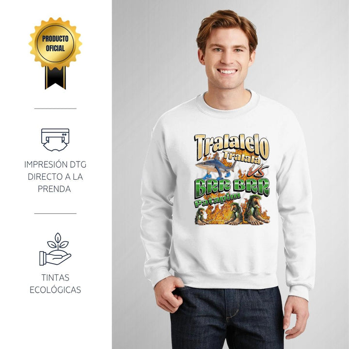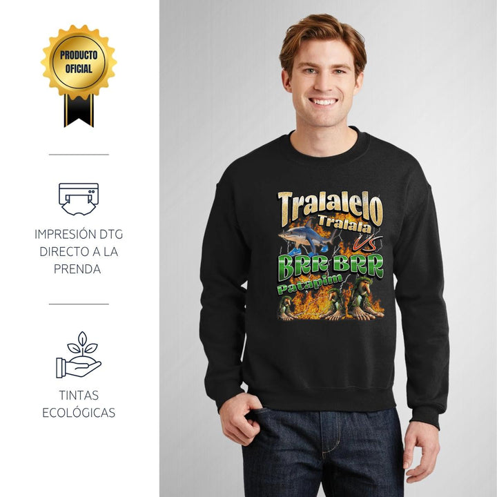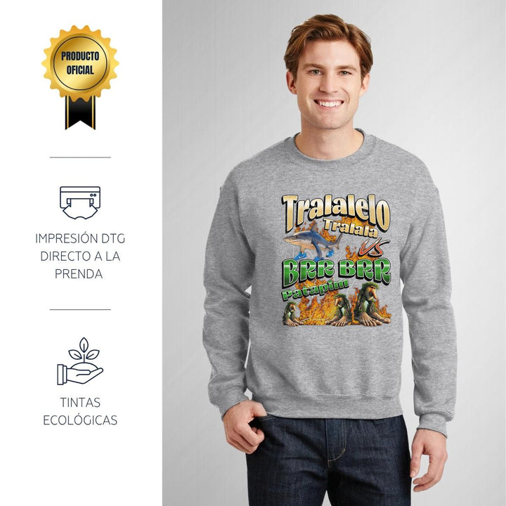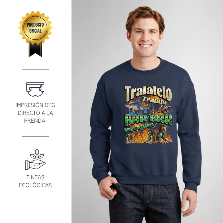 Sudadera de adulto cuello redondo sin gorro o capucha, para hombre nueva, diseño Brainrot Tralalero Brr Brr original impreso con tecnología DTG (directo a la prenda) tacto cero, uso casual o deportiva, 50% algodón y 50% poliéster, estructura sin costura en los costados con ajuste clásico. Colores de sudadera: Negro, Blanco, Azul Marino, Gris.