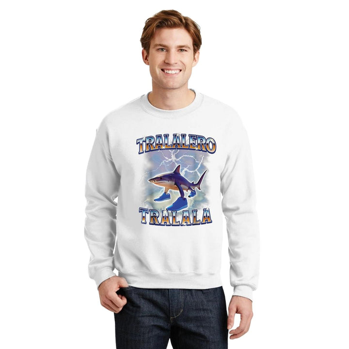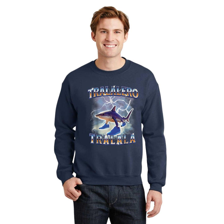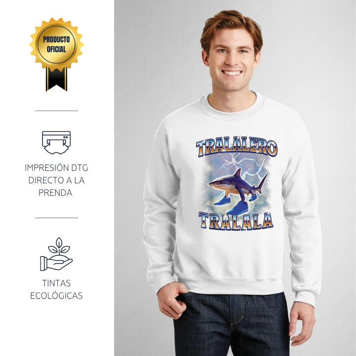 Sudadera de adulto cuello redondo sin gorro o capucha, para hombre nueva, diseño Brainrot Tralalero Tralala original impreso con tecnología DTG (directo a la prenda) tacto cero, uso casual o deportiva, 50% algodón y 50% poliéster, estructura sin costura en los costados con ajuste clásico. Colores de sudadera: Negro, Blanco, Azul Marino, Gris.