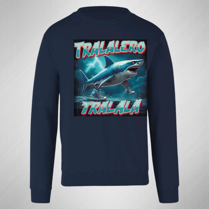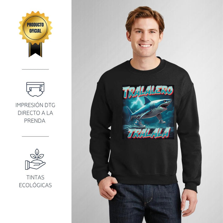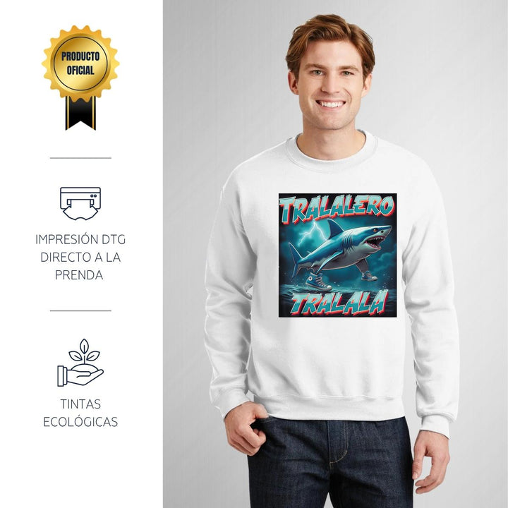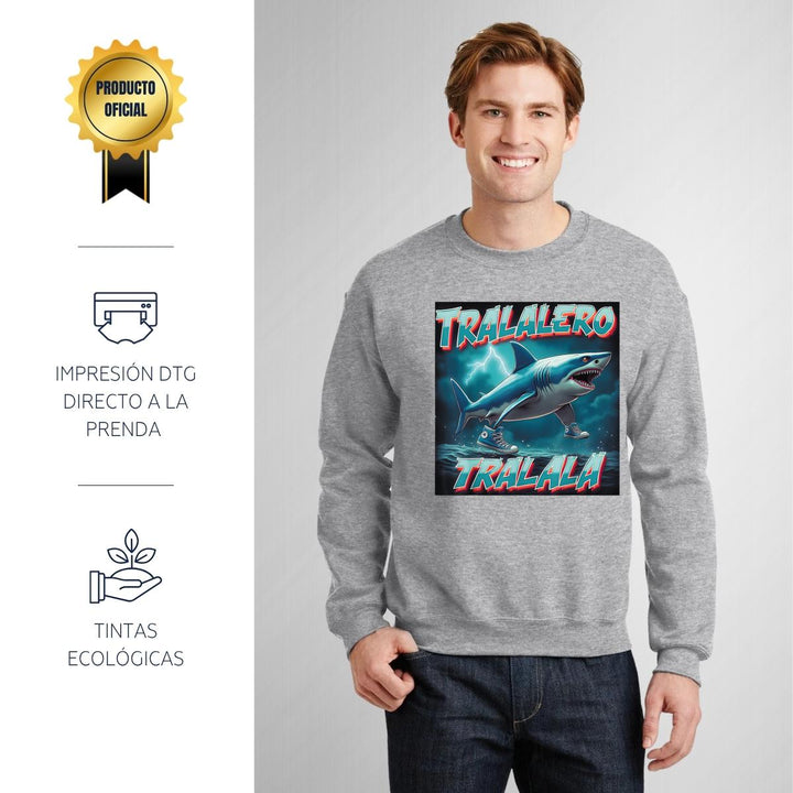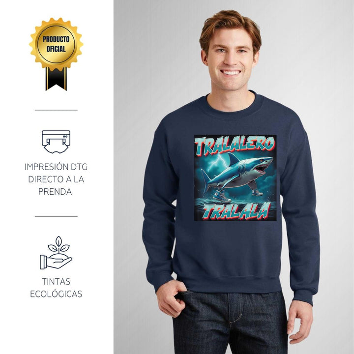 Sudadera de adulto cuello redondo sin gorro o capucha, para hombre nueva, diseño Brainrot Tralalero Tralala original impreso con tecnología DTG (directo a la prenda) tacto cero, uso casual o deportiva, 50% algodón y 50% poliéster, estructura sin costura en los costados con ajuste clásico. Colores de sudadera: Negro, Blanco, Azul Marino, Gris.