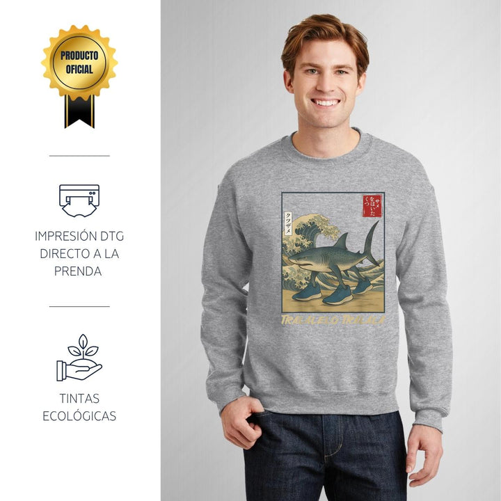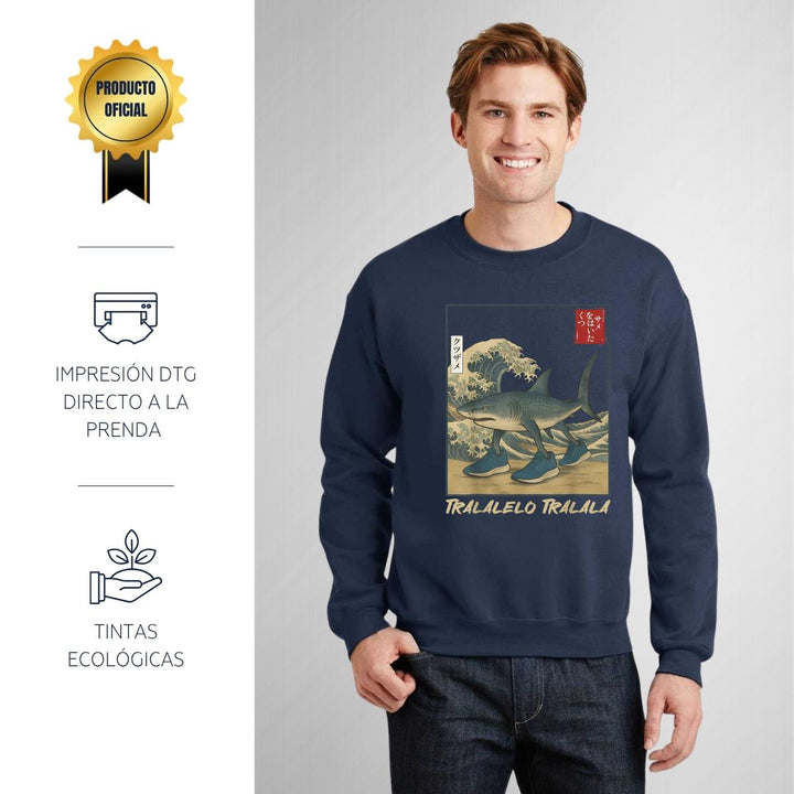 Sudadera de adulto cuello redondo sin gorro o capucha, para hombre nueva, diseño Brainrot Tralalero Tralala original impreso con tecnología DTG (directo a la prenda) tacto cero, uso casual o deportiva, 50% algodón y 50% poliéster, estructura sin costura en los costados con ajuste clásico. Colores de sudadera: Negro, Blanco, Azul Marino, Gris.
