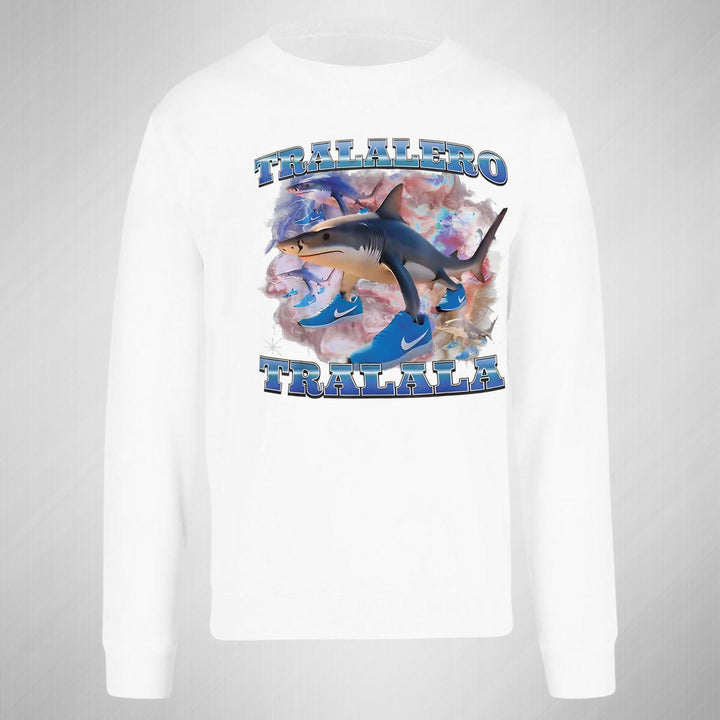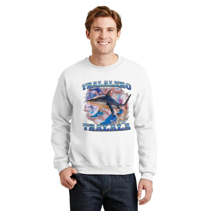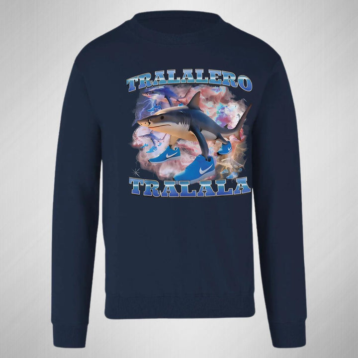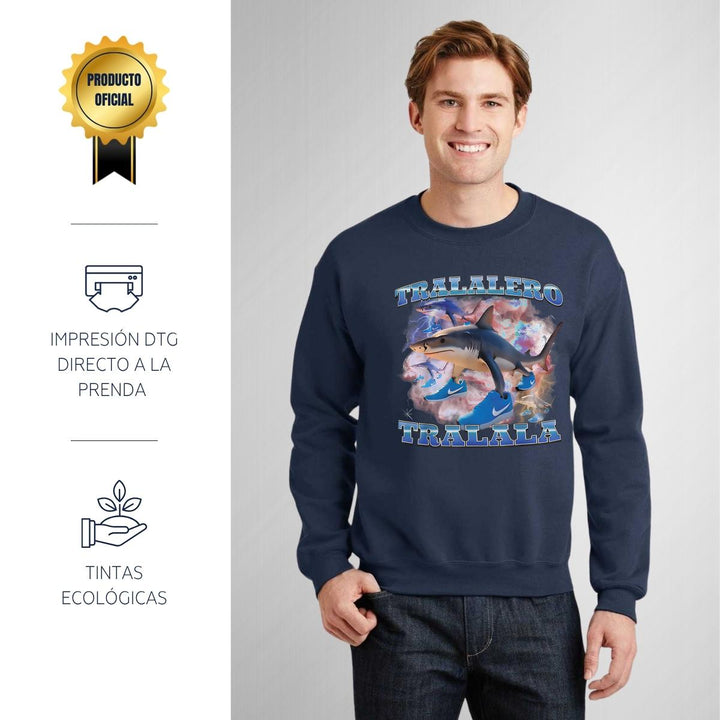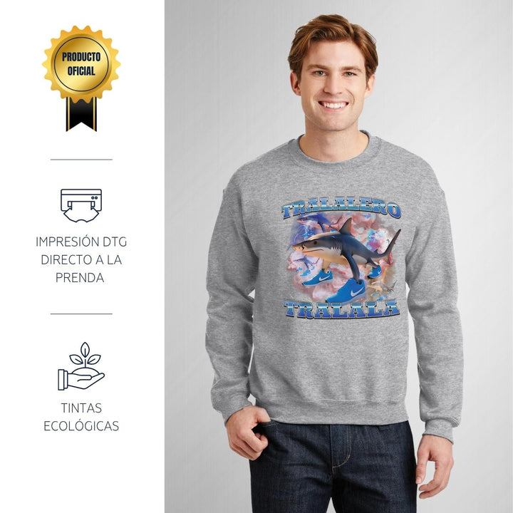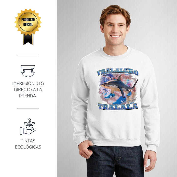 Sudadera de adulto cuello redondo sin gorro o capucha, para hombre nueva, diseño Brainrot Tralalero Tralala original impreso con tecnología DTG (directo a la prenda) tacto cero, uso casual o deportiva, 50% algodón y 50% poliéster, estructura sin costura en los costados con ajuste clásico. Colores de sudadera: Negro, Blanco, Azul Marino, Gris.