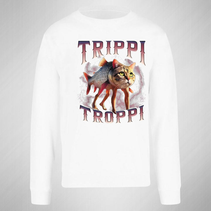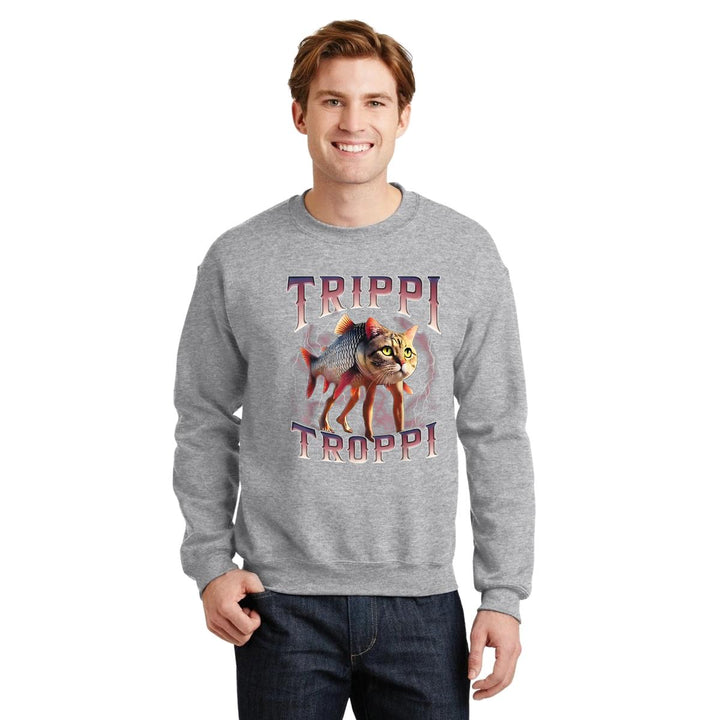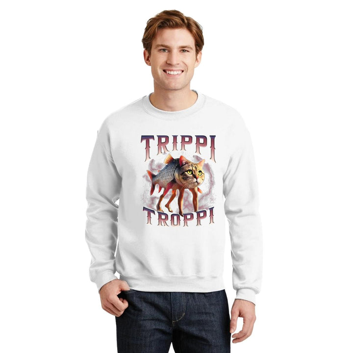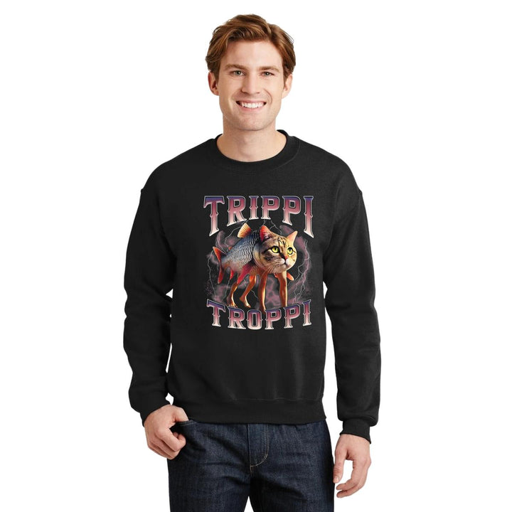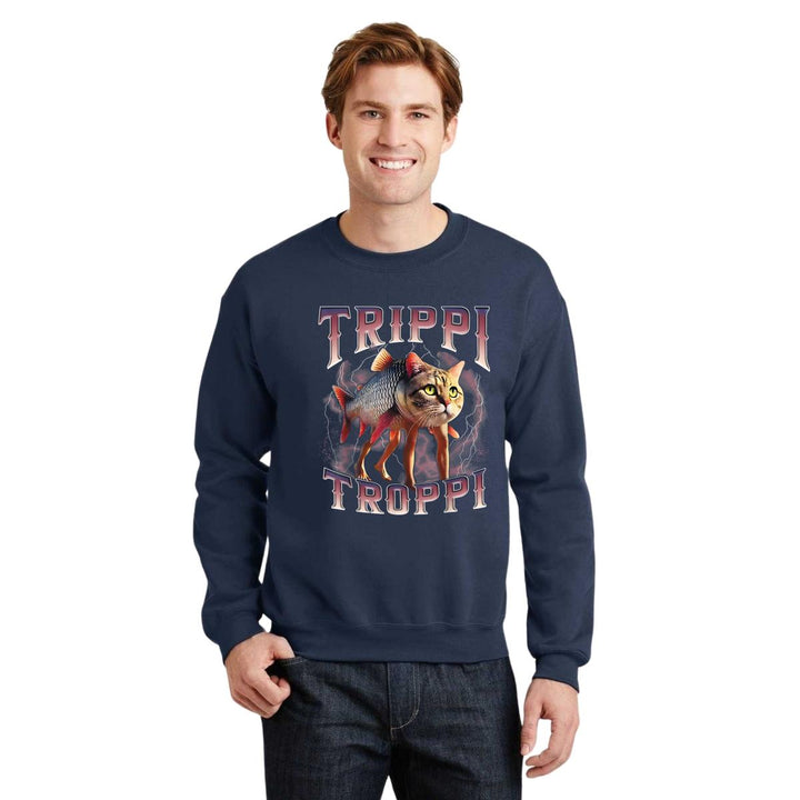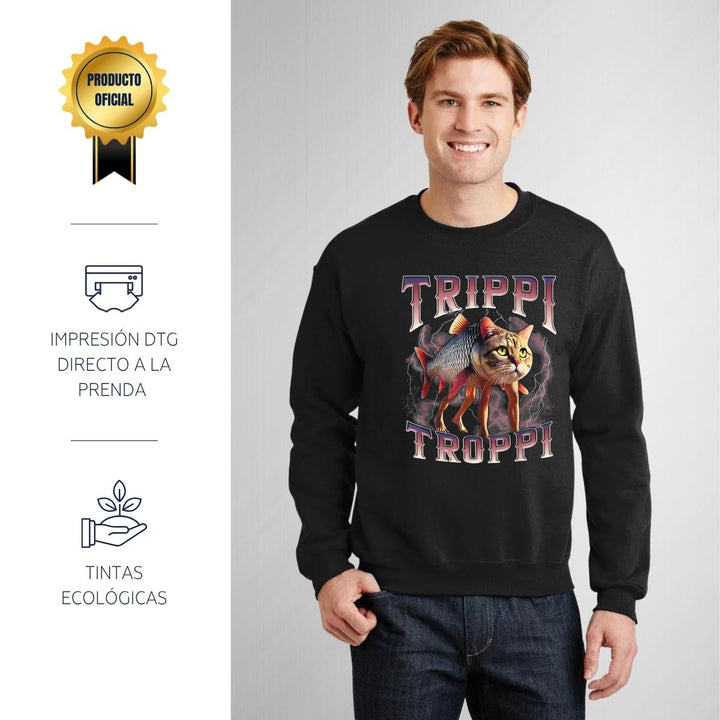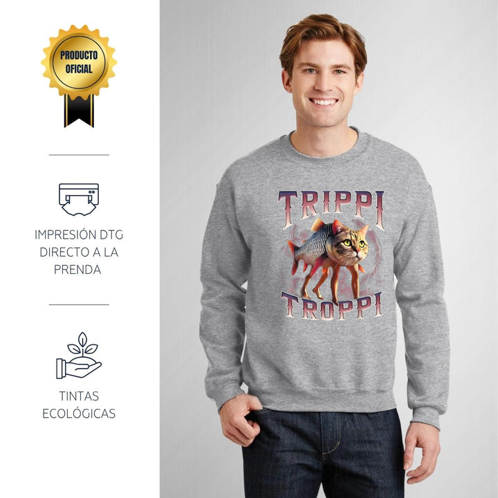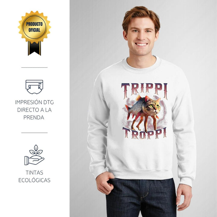 Sudadera de adulto cuello redondo sin gorro o capucha, para hombre nueva, diseño Brainrot Trippi Troppi original impreso con tecnología DTG (directo a la prenda) tacto cero, uso casual o deportiva, 50% algodón y 50% poliéster, estructura sin costura en los costados con ajuste clásico. Colores de sudadera: Negro, Blanco, Azul Marino, Gris.
