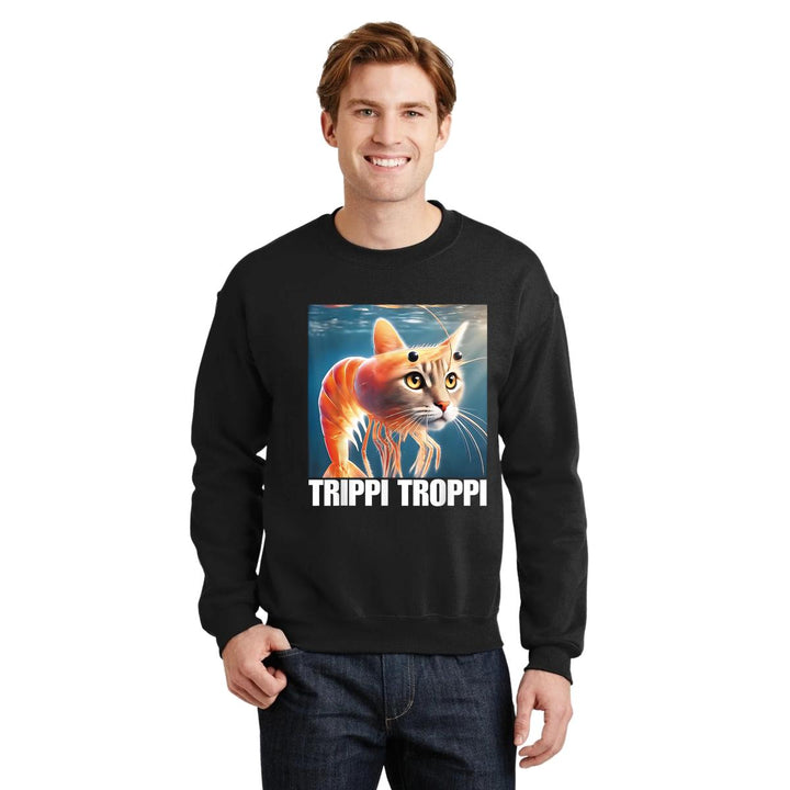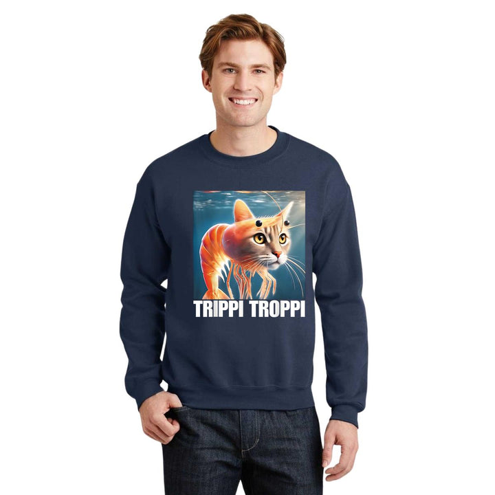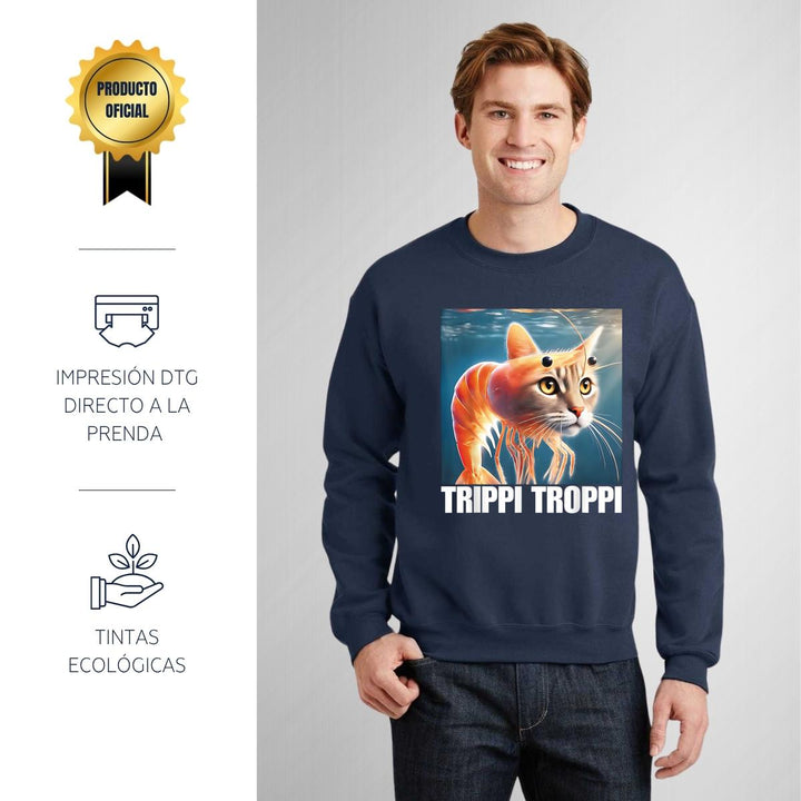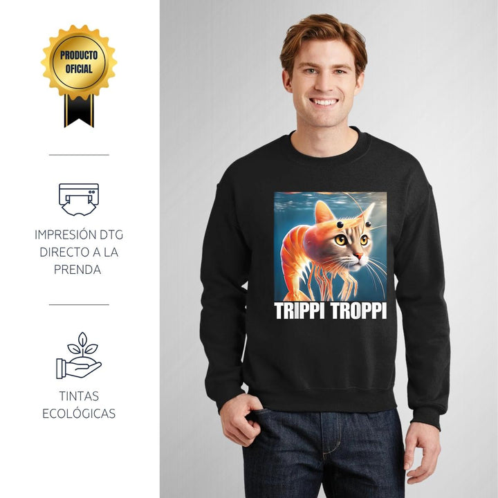 Sudadera de adulto cuello redondo sin gorro o capucha, para hombre nueva, diseño Brainrot Trippi Troppi original impreso con tecnología DTG (directo a la prenda) tacto cero, uso casual o deportiva, 50% algodón y 50% poliéster, estructura sin costura en los costados con ajuste clásico. Colores de sudadera: Negro, Azul Marino.