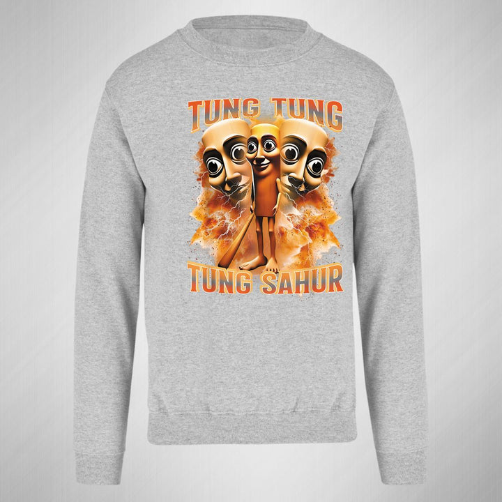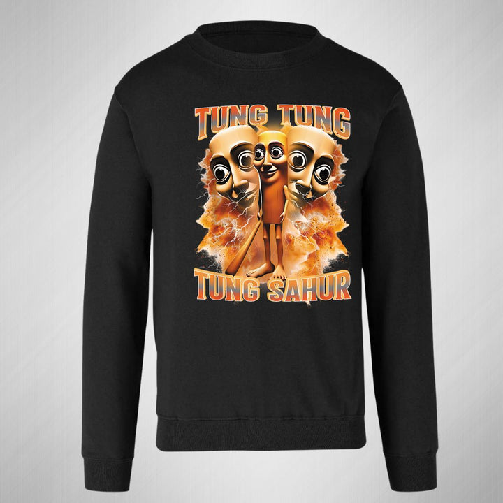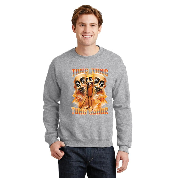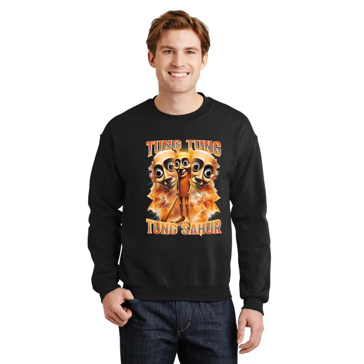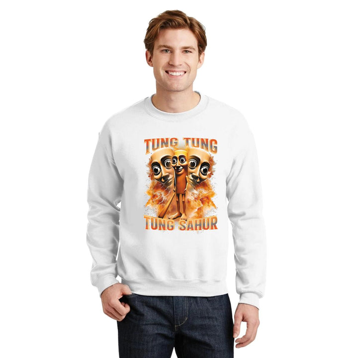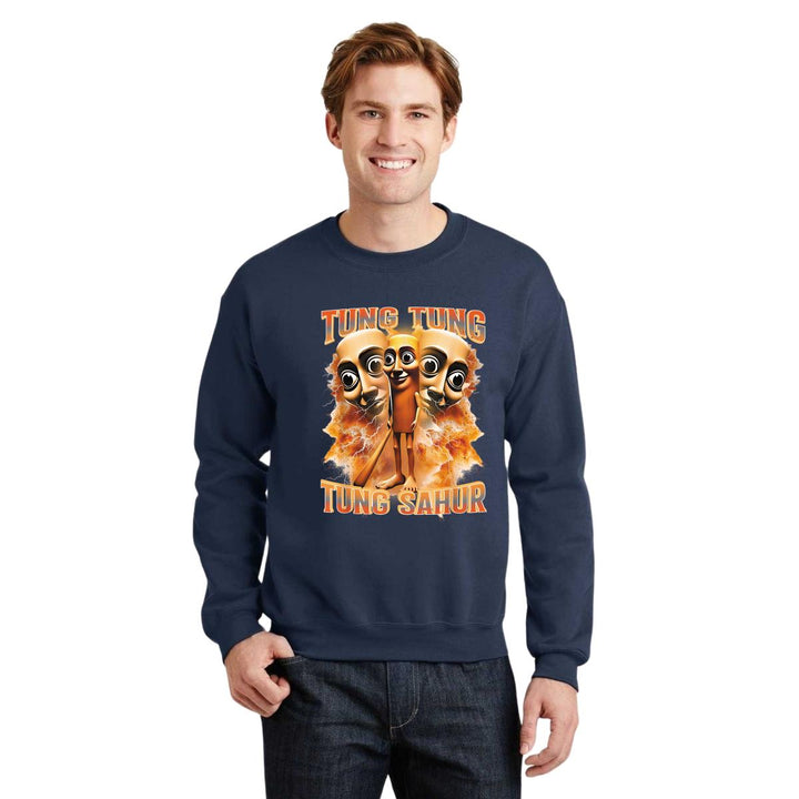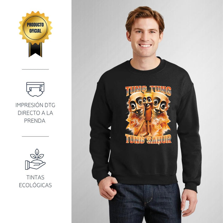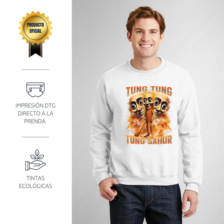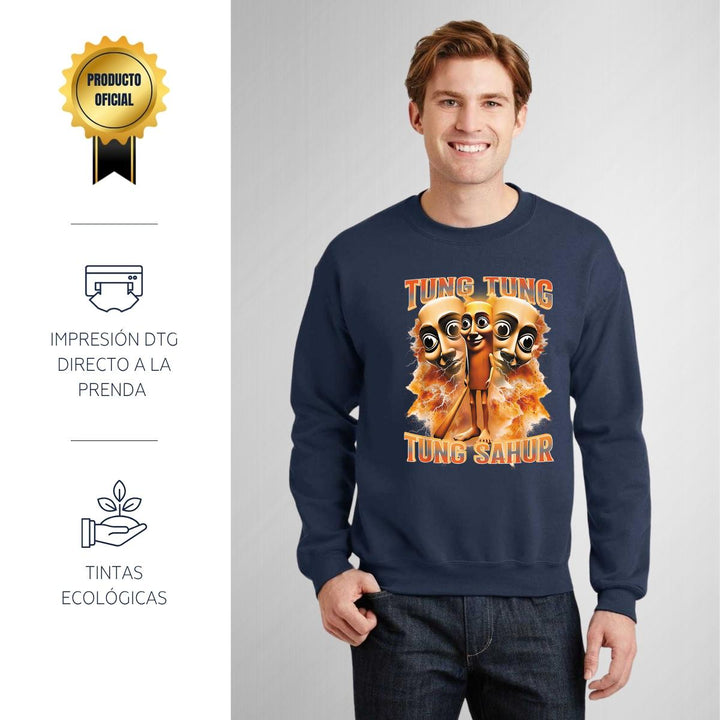 Sudadera de adulto cuello redondo sin gorro o capucha, para hombre nueva, diseño Brainrot Tung Tung Tung Sahur original impreso con tecnología DTG (directo a la prenda) tacto cero, uso casual o deportiva, 50% algodón y 50% poliéster, estructura sin costura en los costados con ajuste clásico. Colores de sudadera: Negro, Blanco, Azul Marino, Gris.