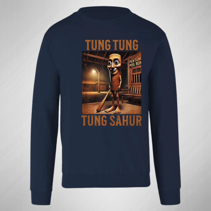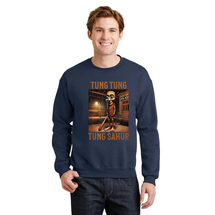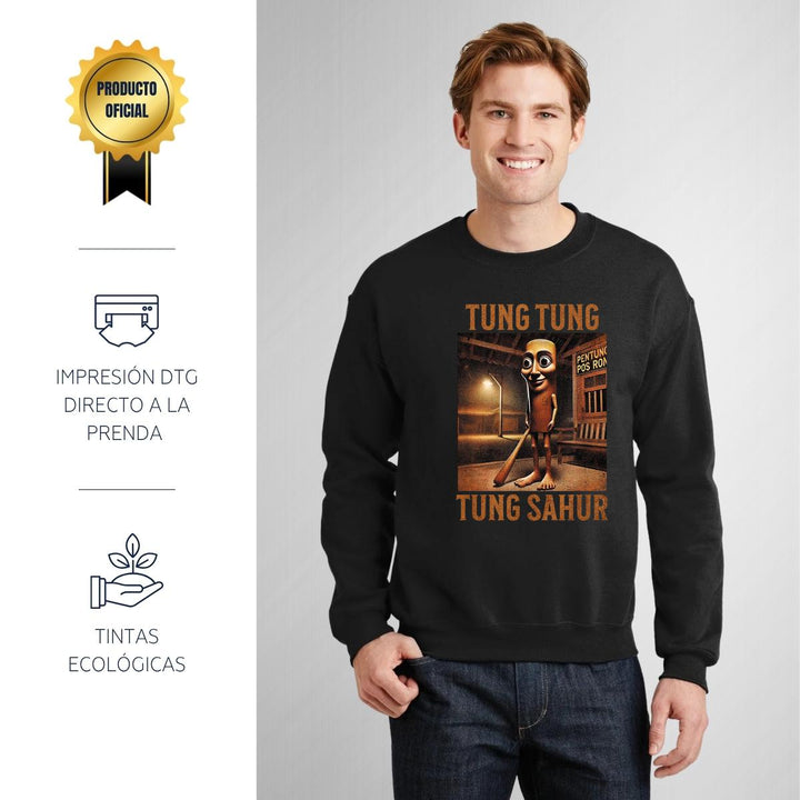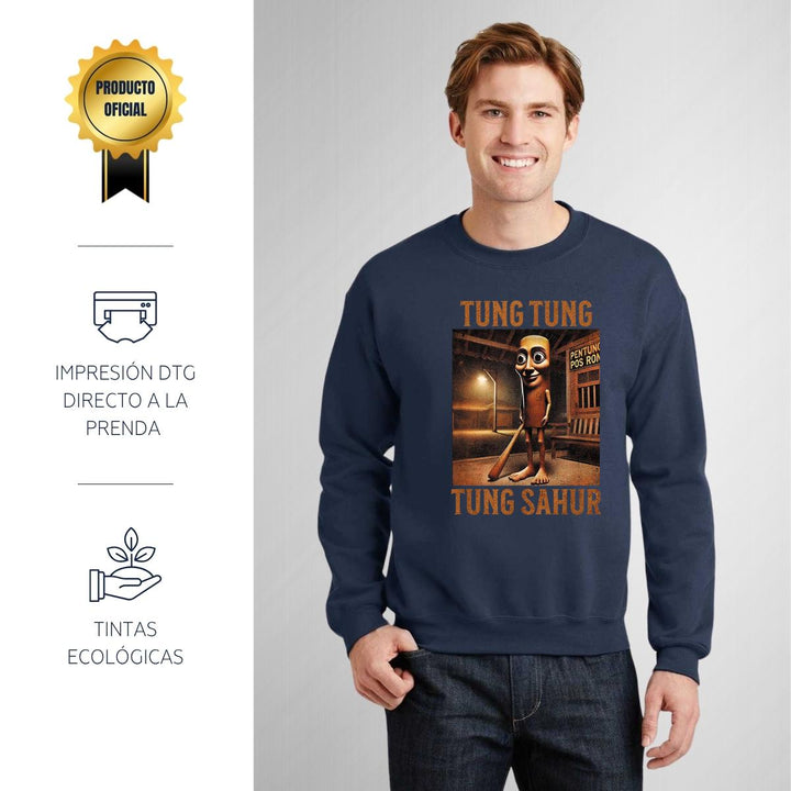 Sudadera de adulto cuello redondo sin gorro o capucha, para hombre nueva, diseño Brainrot Tung Tung Tung Sahur original impreso con tecnología DTG (directo a la prenda) tacto cero, uso casual o deportiva, 50% algodón y 50% poliéster, estructura sin costura en los costados con ajuste clásico. Colores de sudadera: Negro, Blanco, Azul Marino, Gris.