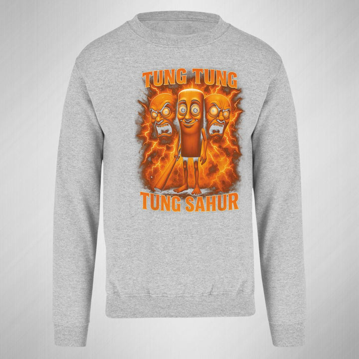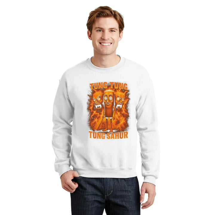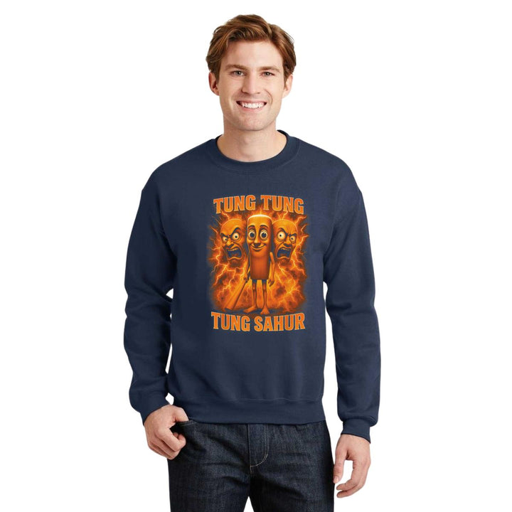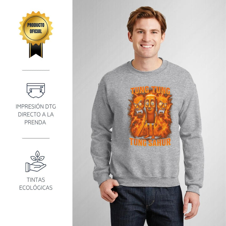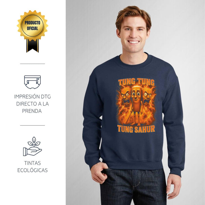 Sudadera de adulto cuello redondo sin gorro o capucha, para hombre nueva, diseño Brainrot Tung Tung Tung Sahur original impreso con tecnología DTG (directo a la prenda) tacto cero, uso casual o deportiva, 50% algodón y 50% poliéster, estructura sin costura en los costados con ajuste clásico. Colores de sudadera: Negro, Blanco, Azul Marino, Gris.