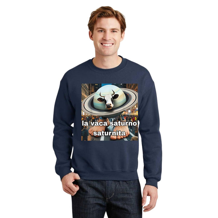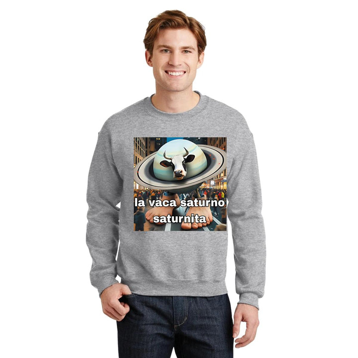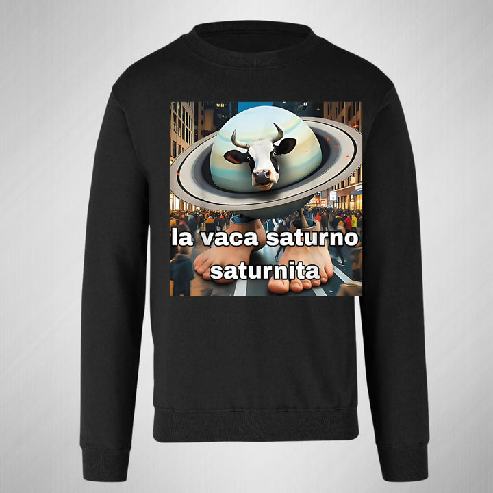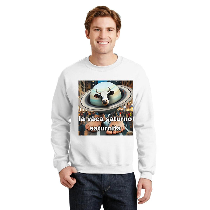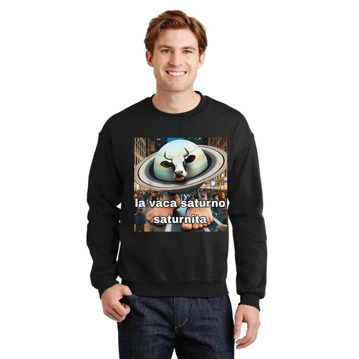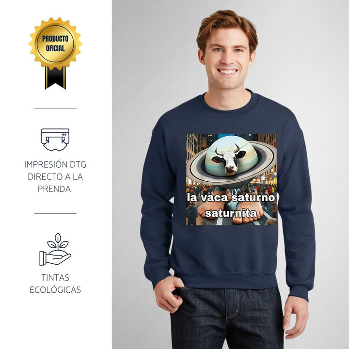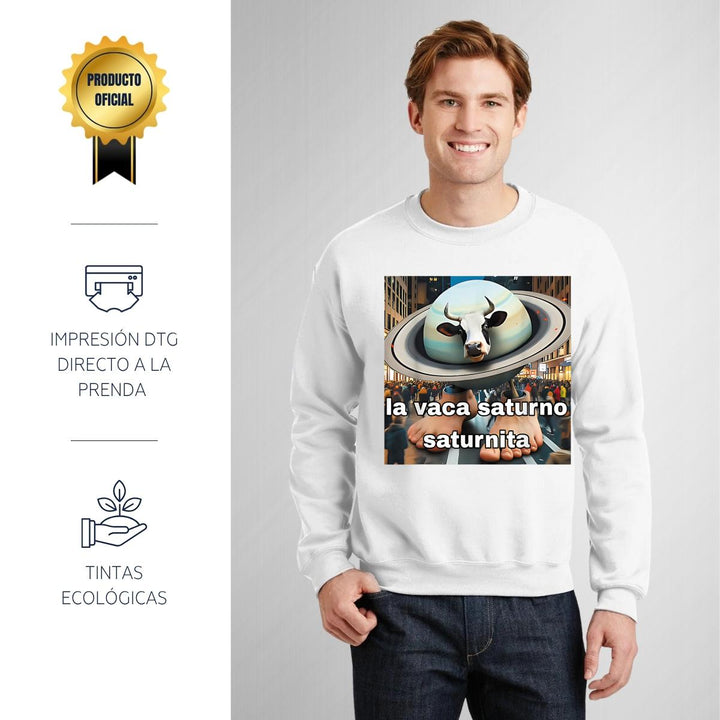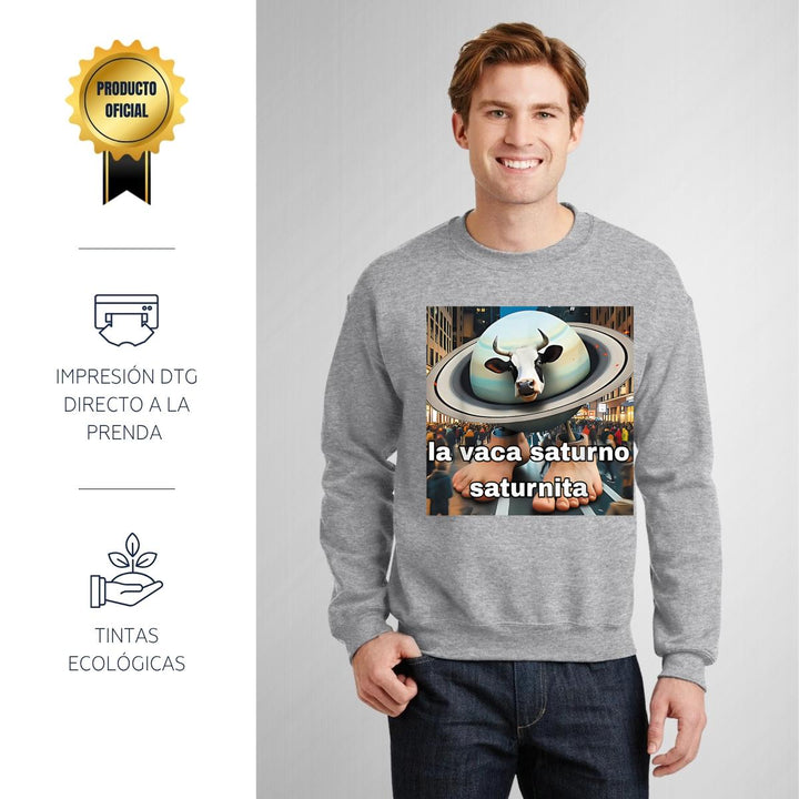 Sudadera de adulto cuello redondo sin gorro o capucha, para hombre nueva, diseño Brainrot Vaca Saturno Saturnita original impreso con tecnología DTG (directo a la prenda) tacto cero, uso casual o deportiva, 50% algodón y 50% poliéster, estructura sin costura en los costados con ajuste clásico. Colores de sudadera: Negro, Blanco, Azul Marino, Gris.