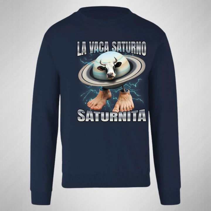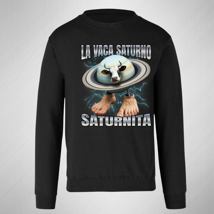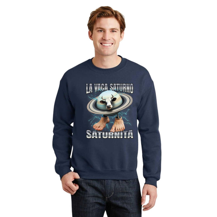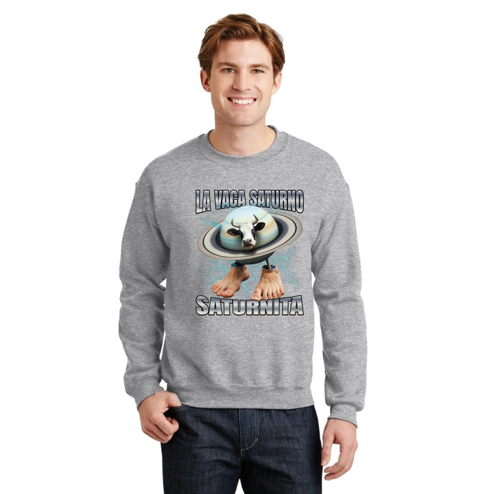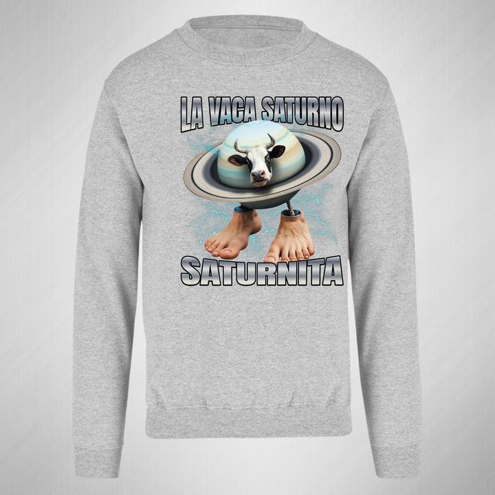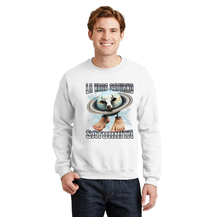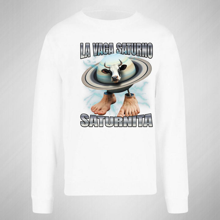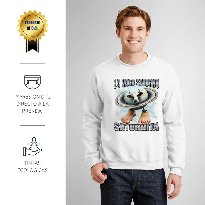Sudadera de adulto cuello redondo sin gorro o capucha, para hombre nueva, diseño Brainrot Vaca Saturno Saturnita original impreso con tecnología DTG (directo a la prenda) tacto cero, uso casual o deportiva, 50% algodón y 50% poliéster, estructura sin costura en los costados con ajuste clásico. Colores de sudadera: Negro, Blanco, Azul Marino, Gris.