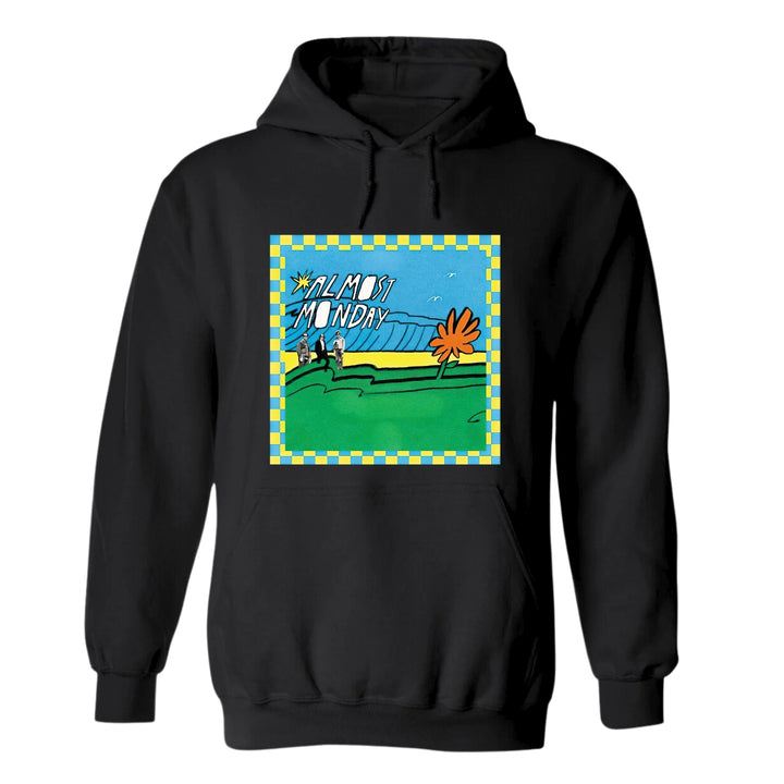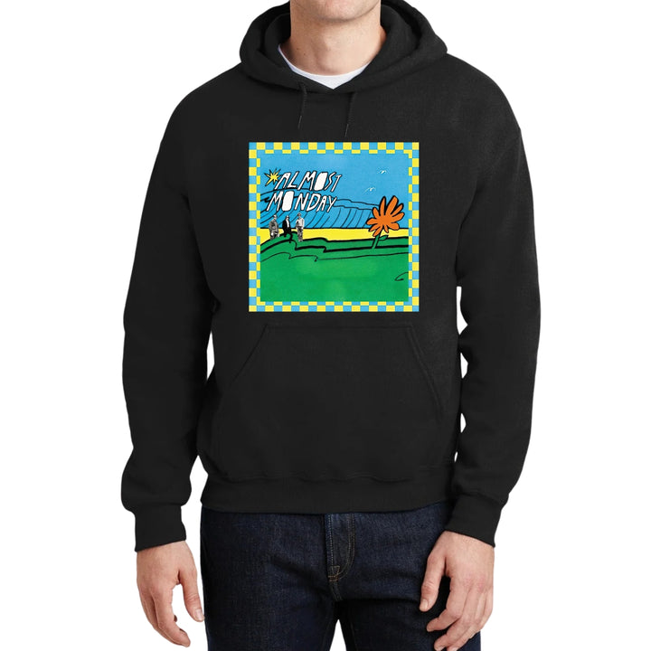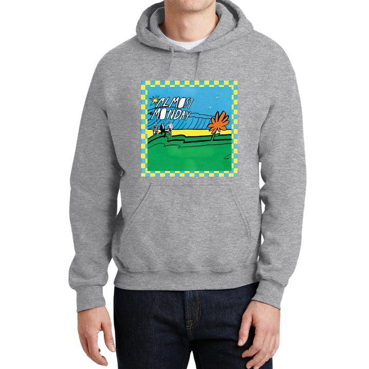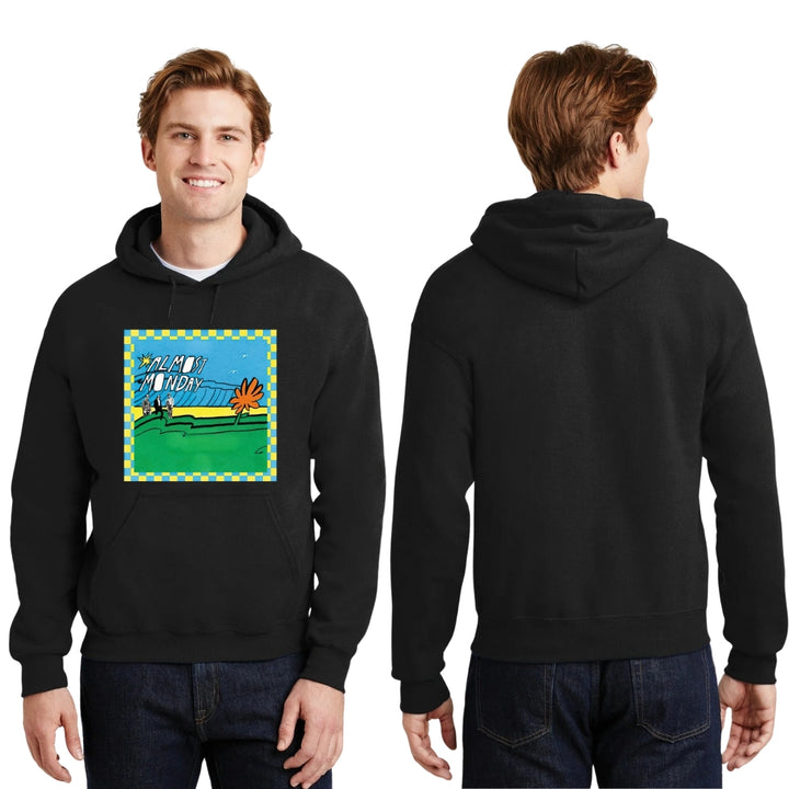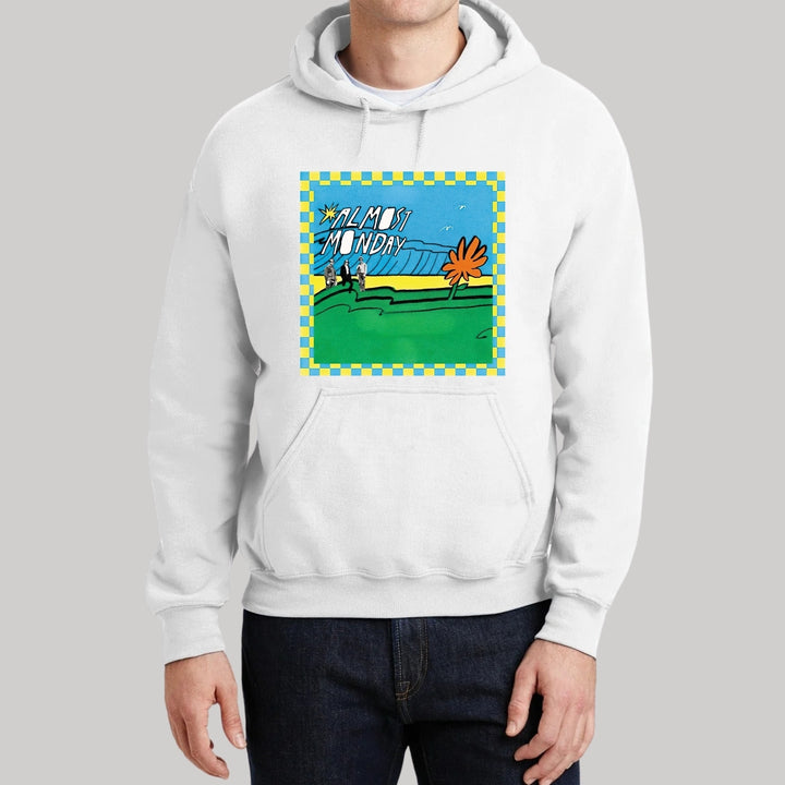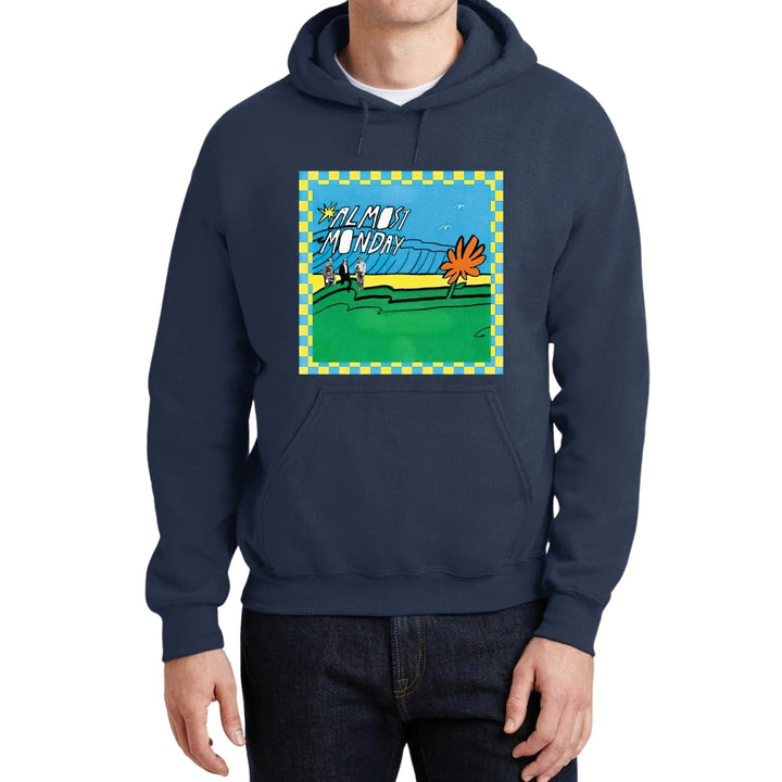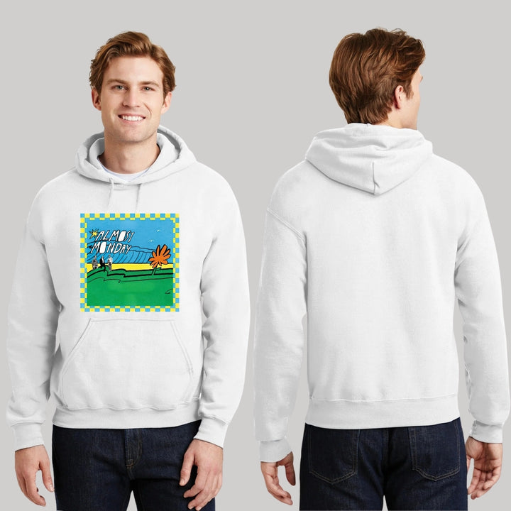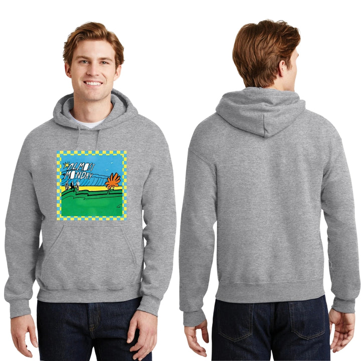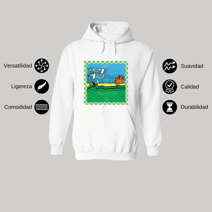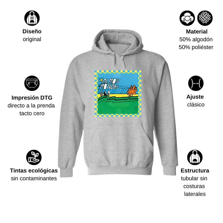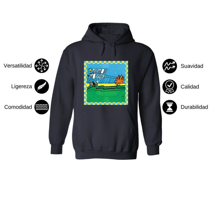 Sudadera hoodie de adulto con gorro o capucha y bolsillo frontal canguro, para hombre nueva, diseño Almost Monday Tour original impreso con tecnología DTG (directo a la prenda) tacto cero, uso casual o deportiva, 50% algodón y 50% poliéster fleece pre encogido, estructura tubular con ajuste clásico. Colores de sudadera: Negro, Blanco, Azul Marino, Gris.
