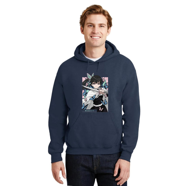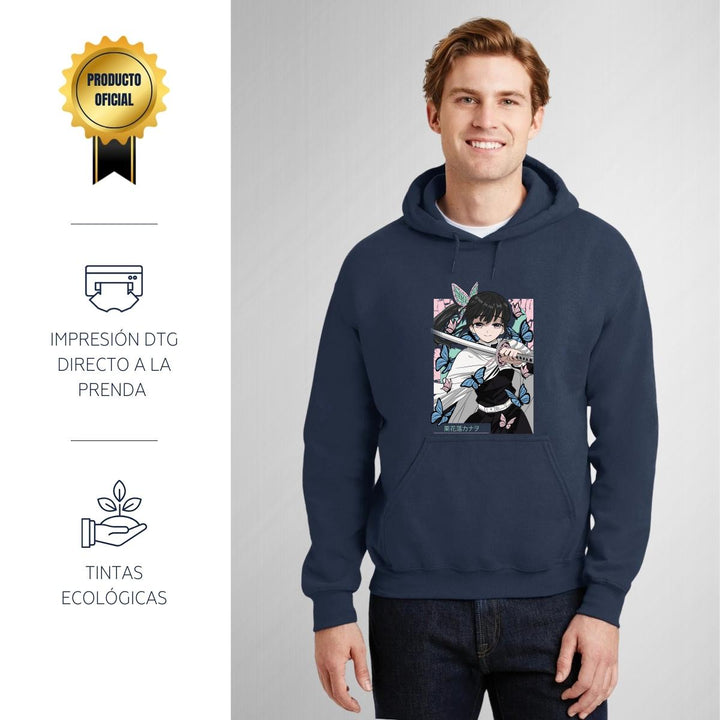 Sudadera hoodie de adulto con gorro o capucha y bolsillo frontal canguro, para hombre nueva, diseño Anime Demon Slayer Kanao Tsuyuri original impreso con tecnología DTG (directo a la prenda) tacto cero, uso casual o deportiva, 50% algodón y 50% poliéster fleece pre encogido, estructura tubular con ajuste clásico. Colores de sudadera: Negro, Blanco, Azul Marino, Gris.