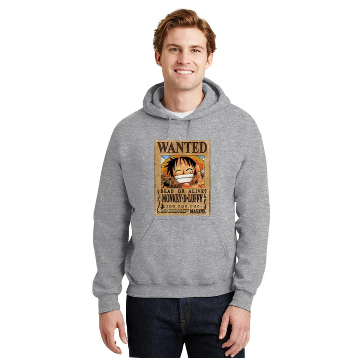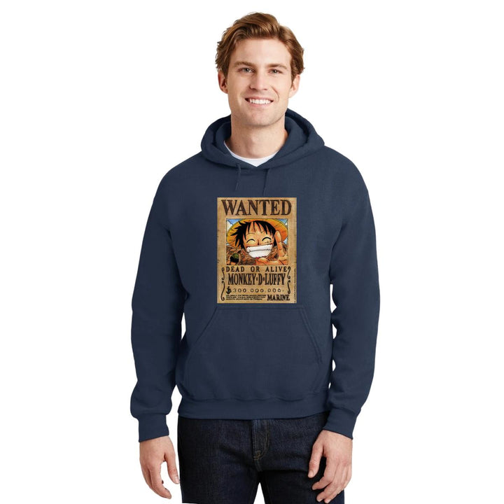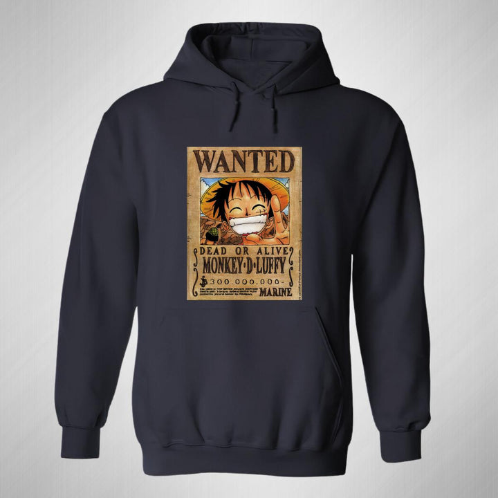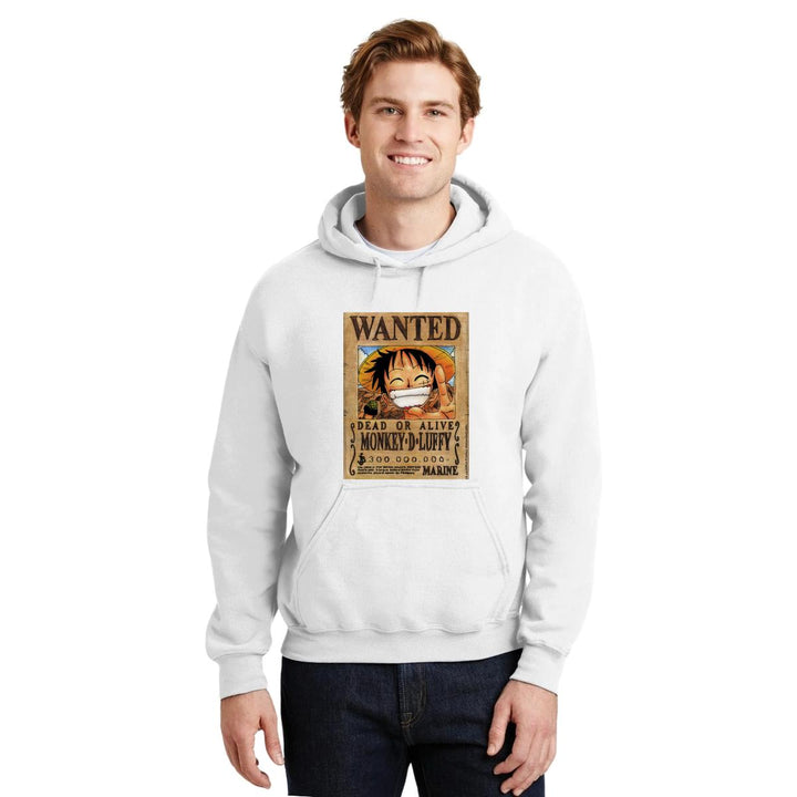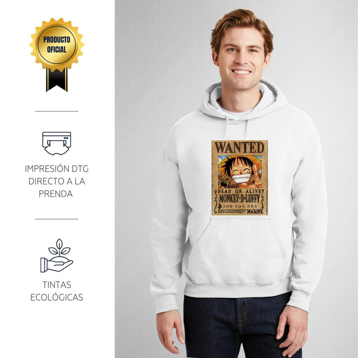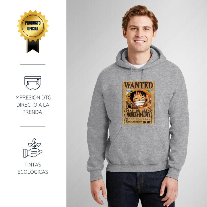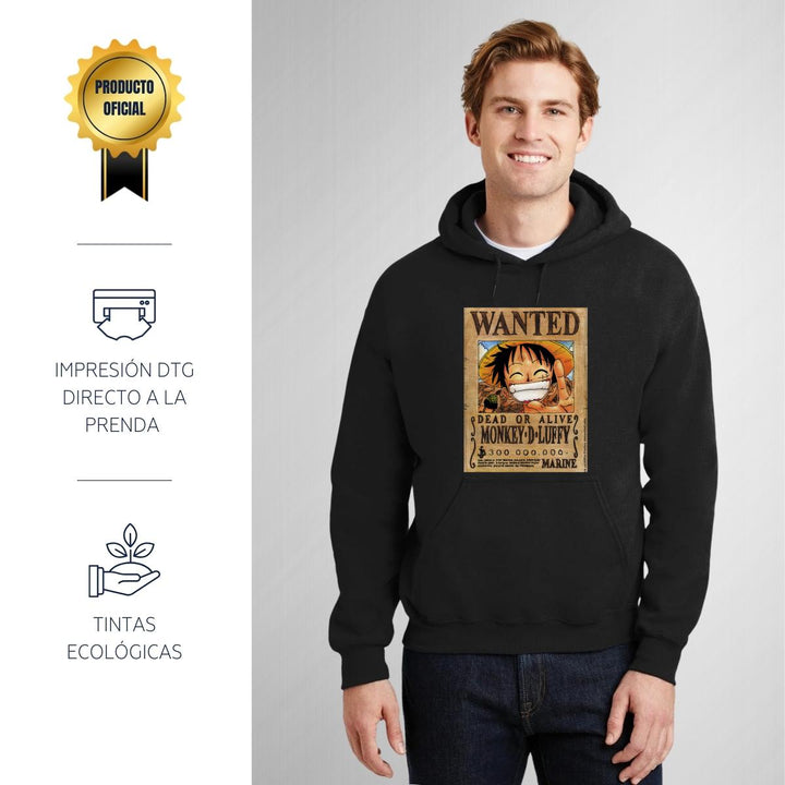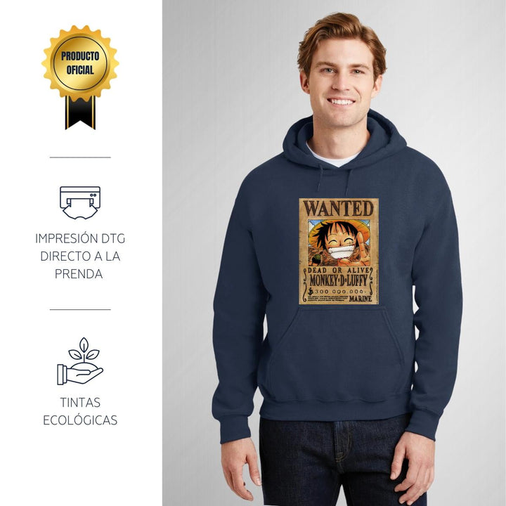 Sudadera hoodie de adulto con gorro o capucha y bolsillo frontal canguro, para hombre nueva, diseño Anime One piece Wanted Luffy original impreso con tecnología DTG (directo a la prenda) tacto cero, uso casual o deportiva, 50% algodón y 50% poliéster fleece pre encogido, estructura tubular con ajuste clásico. Colores de sudadera: Negro, Blanco, Azul Marino, Gris.