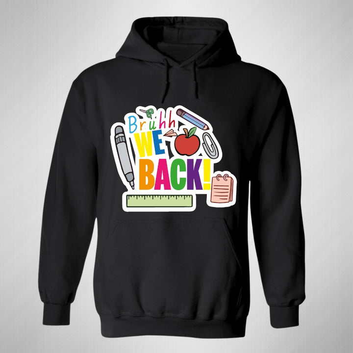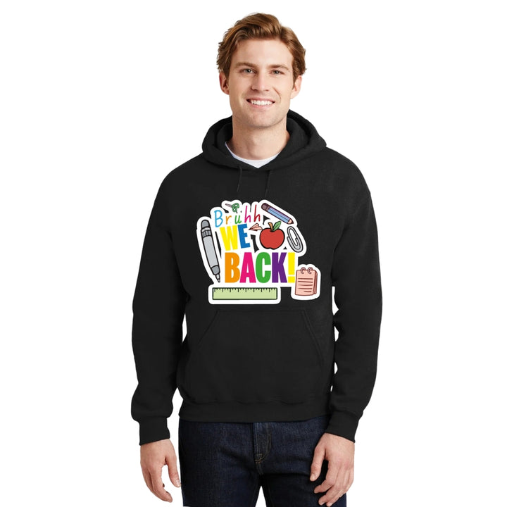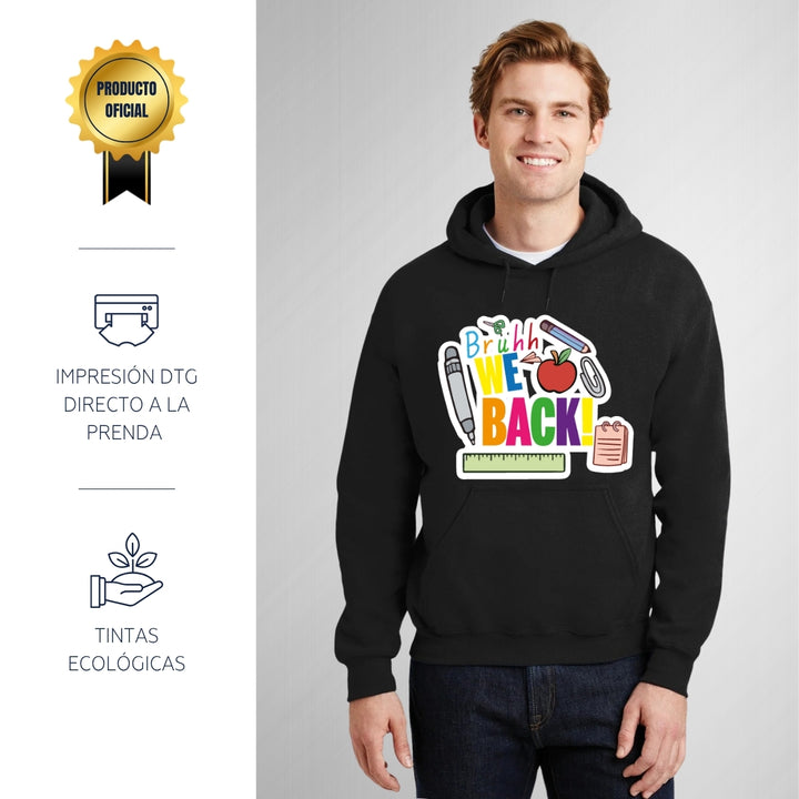 Sudadera hoodie de adulto con gorro o capucha y bolsillo frontal canguro, para hombre nueva, diseño Back to school original impreso con tecnología DTG (directo a la prenda) tacto cero, uso casual o deportiva, 50% algodón y 50% poliéster fleece pre encogido, estructura tubular con ajuste clásico. Colores de sudadera: Negro, Blanco, Azul Marino, Gris.