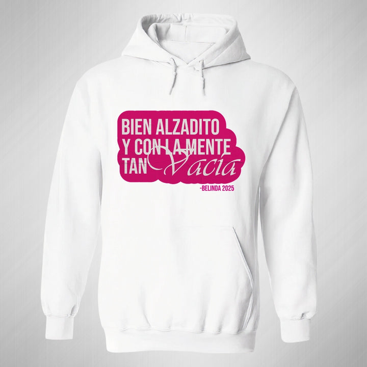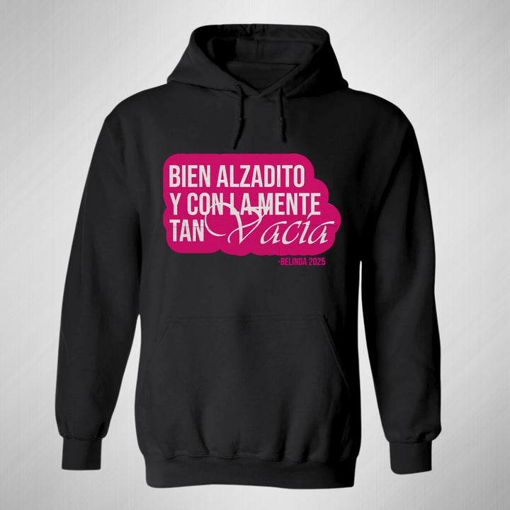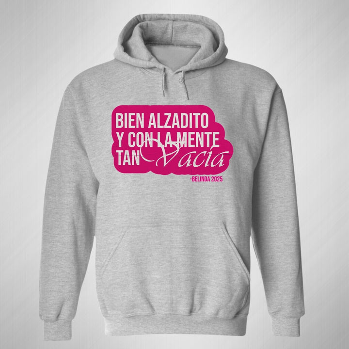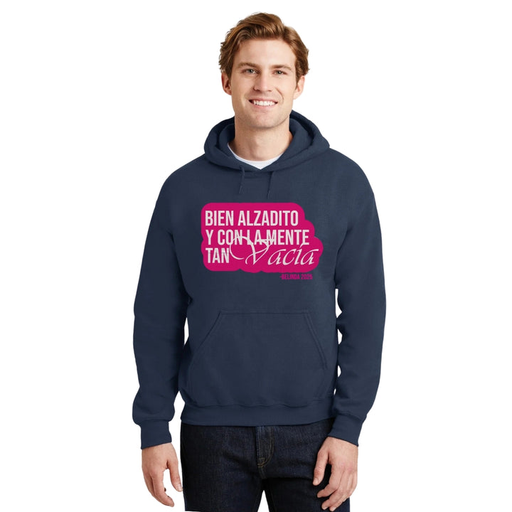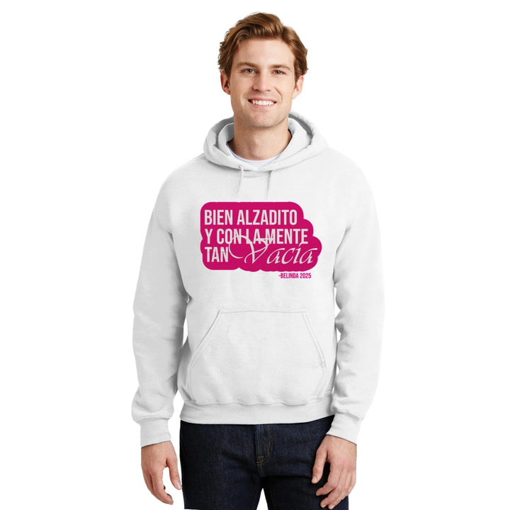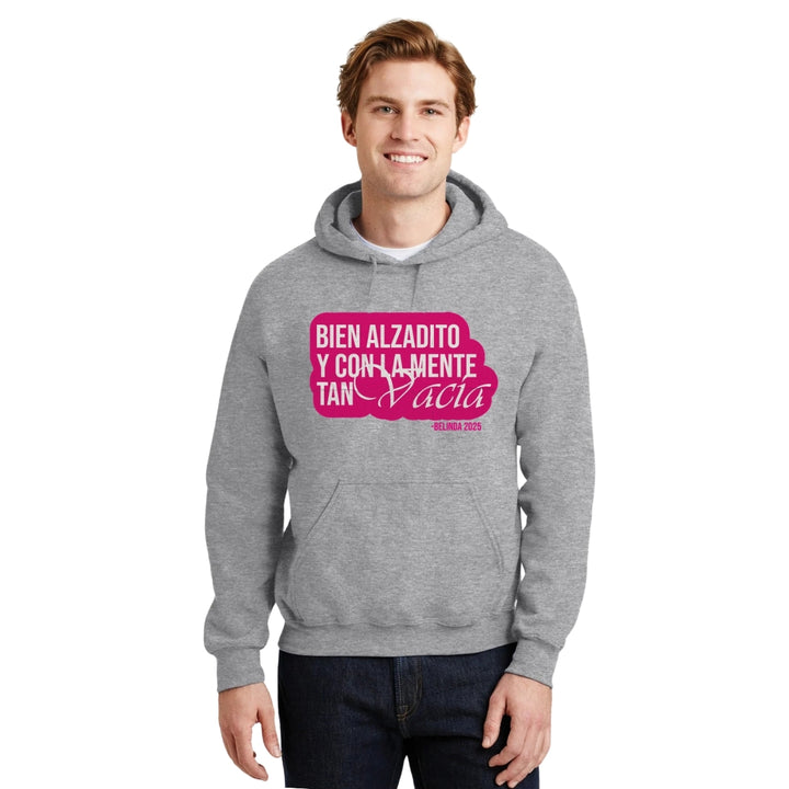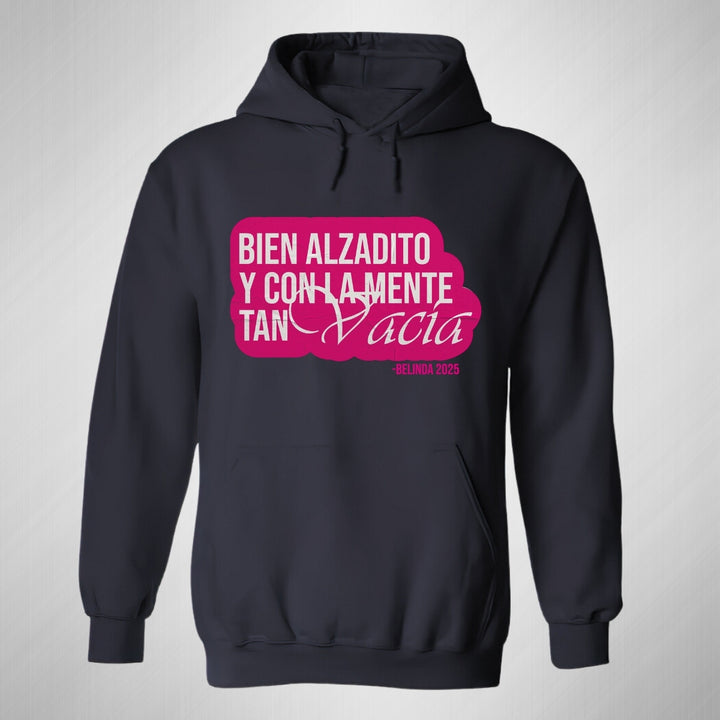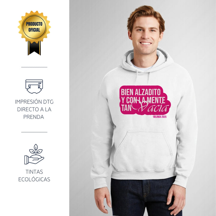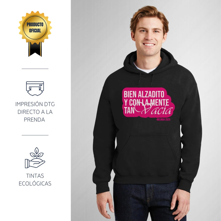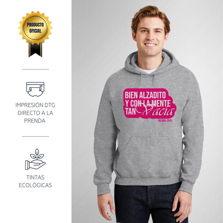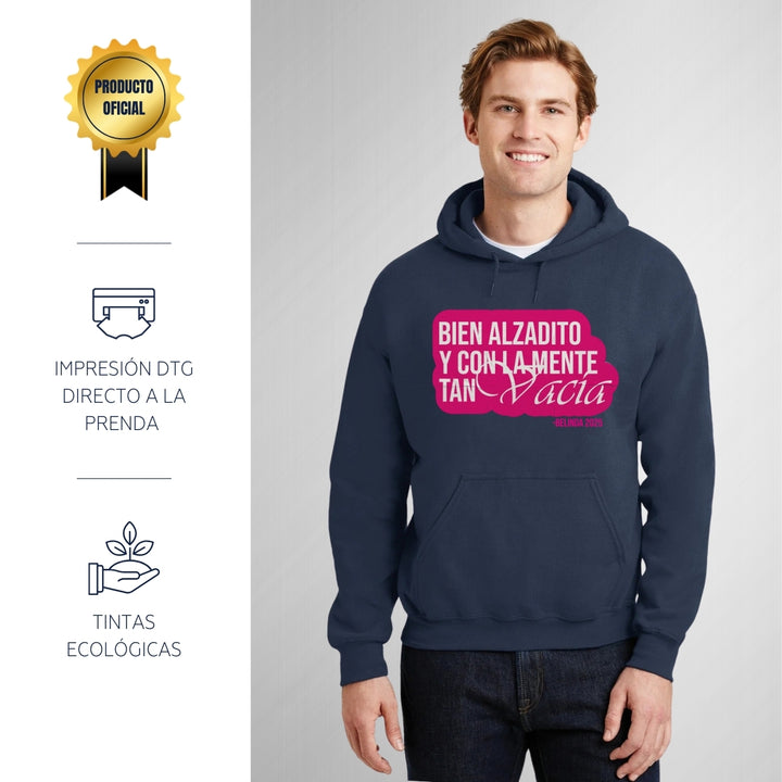 Sudadera hoodie de adulto con gorro o capucha y bolsillo frontal canguro, para hombre nueva, diseño Belinda Bien Alzadito original impreso con tecnología DTG (directo a la prenda) tacto cero, uso casual o deportiva, 50% algodón y 50% poliéster fleece pre encogido, estructura tubular con ajuste clásico. Colores de sudadera: Negro, Blanco, Azul Marino, Gris.