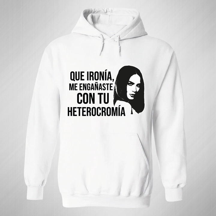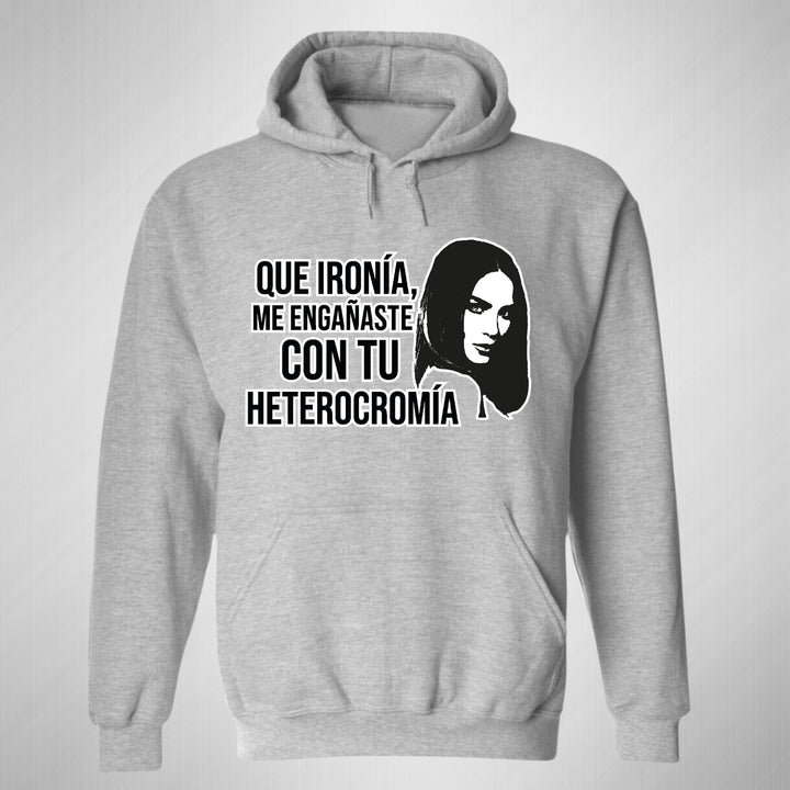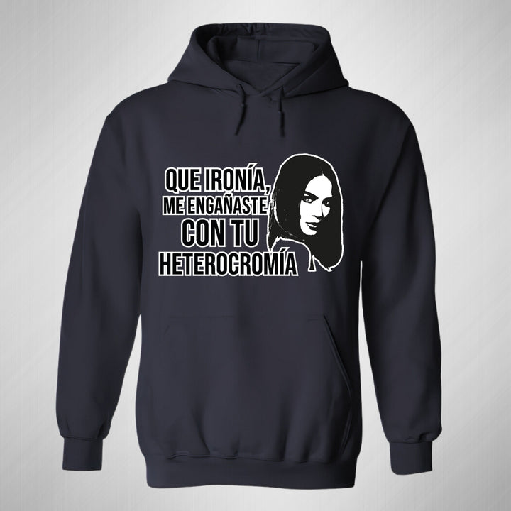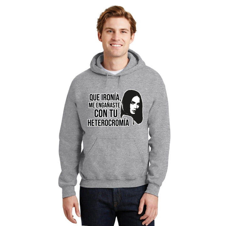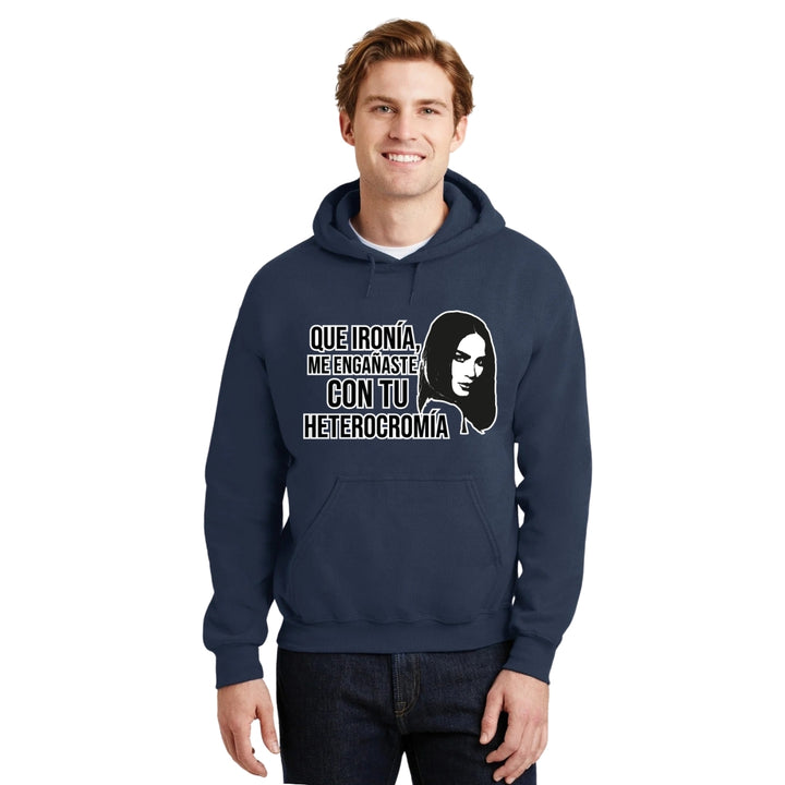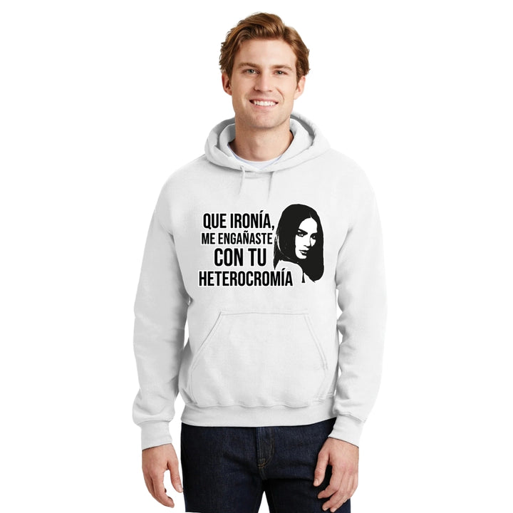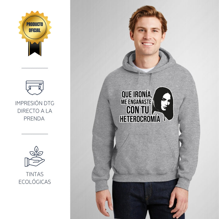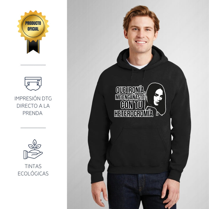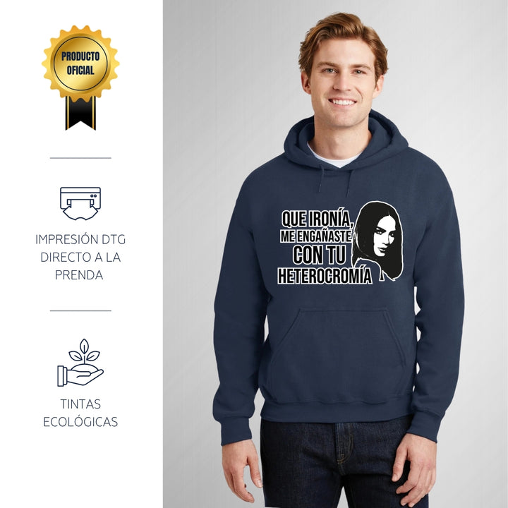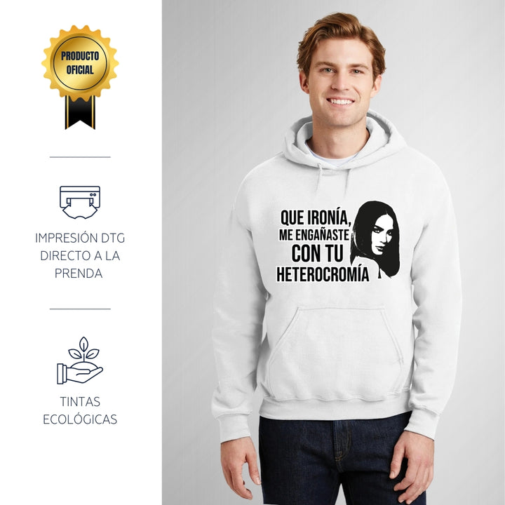 Sudadera hoodie de adulto con gorro o capucha y bolsillo frontal canguro, para hombre nueva, diseño Belinda Heterocromía original impreso con tecnología DTG (directo a la prenda) tacto cero, uso casual o deportiva, 50% algodón y 50% poliéster fleece pre encogido, estructura tubular con ajuste clásico. Colores de sudadera: Negro, Blanco, Azul Marino, Gris.