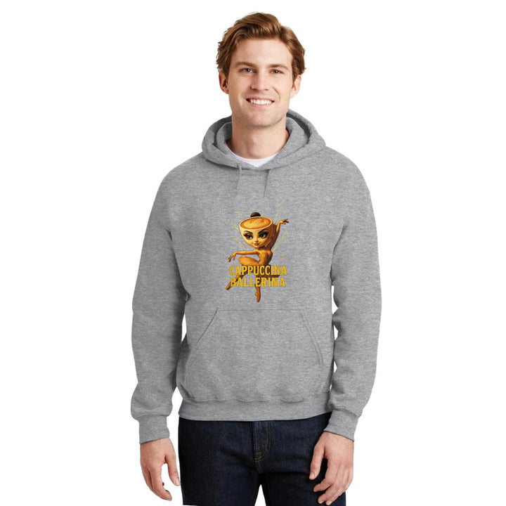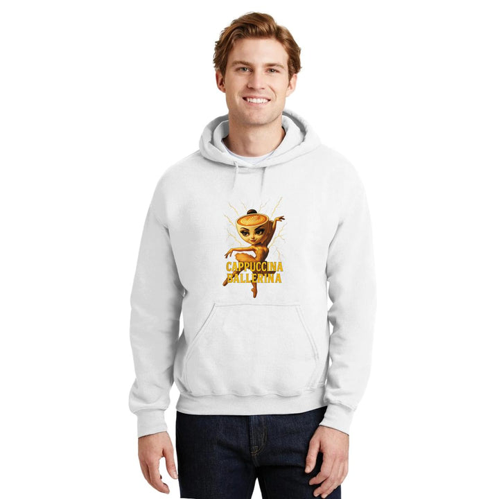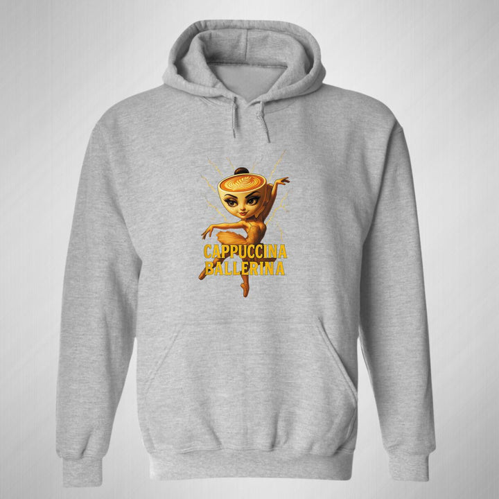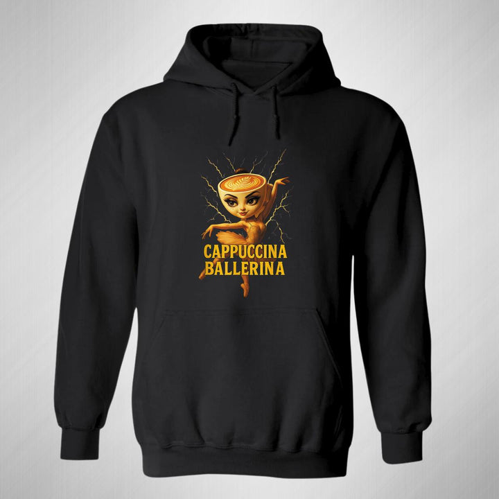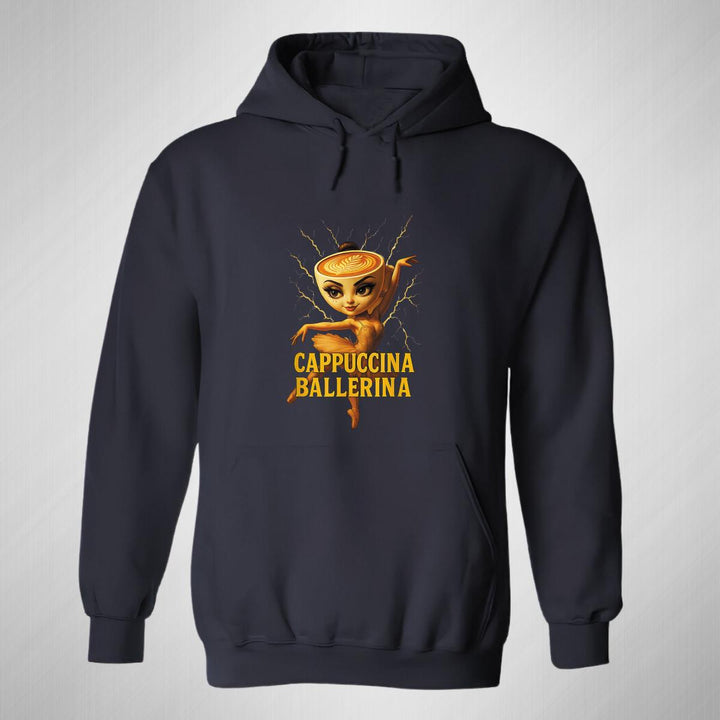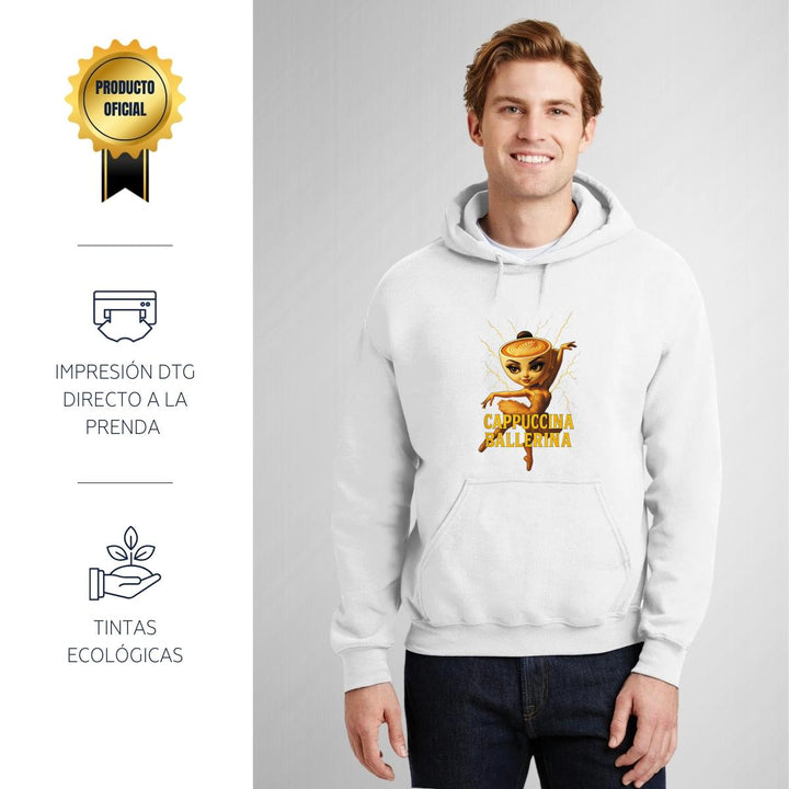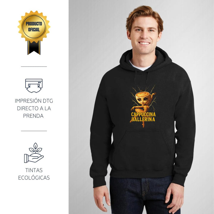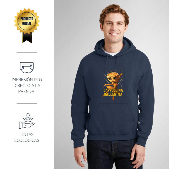 Sudadera hoodie de adulto con gorro o capucha y bolsillo frontal canguro, para hombre nueva, diseño Brainrot Ballerina Capuchina original impreso con tecnología DTG (directo a la prenda) tacto cero, uso casual o deportiva, 50% algodón y 50% poliéster fleece pre encogido, estructura tubular con ajuste clásico. Colores de sudadera: Negro, Blanco, Azul Marino, Gris.