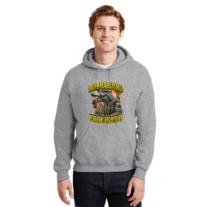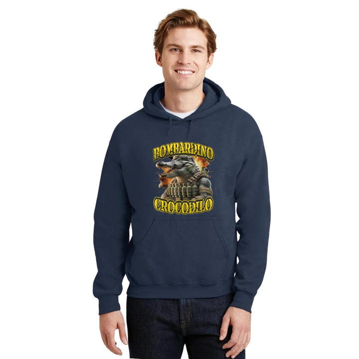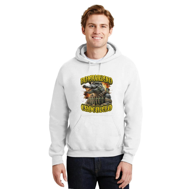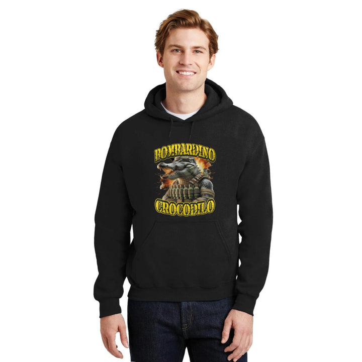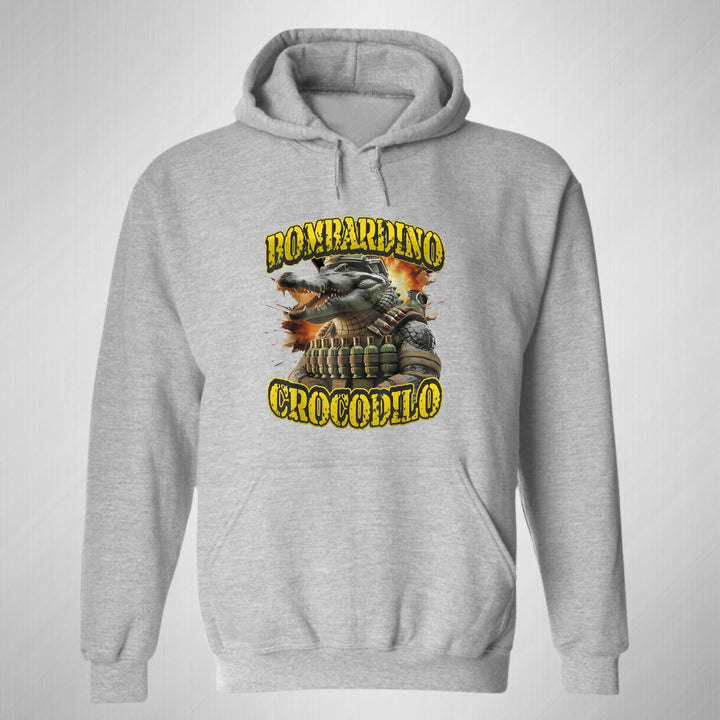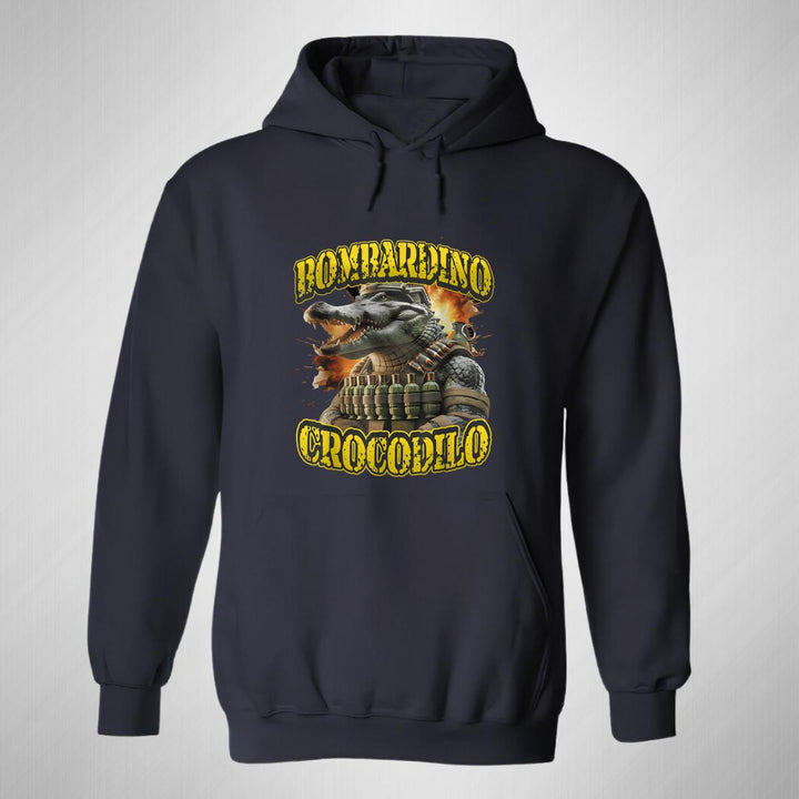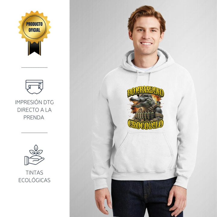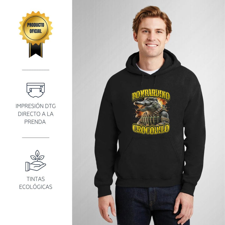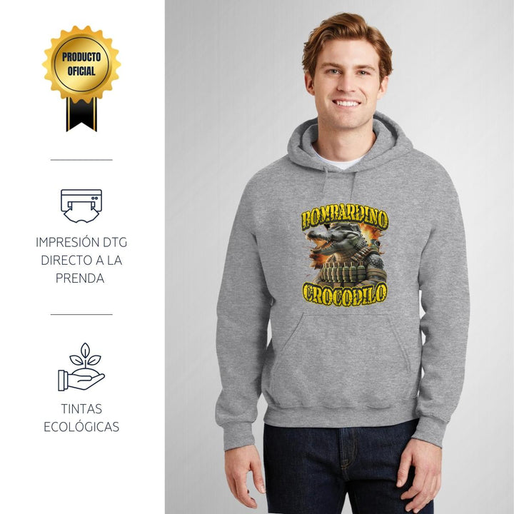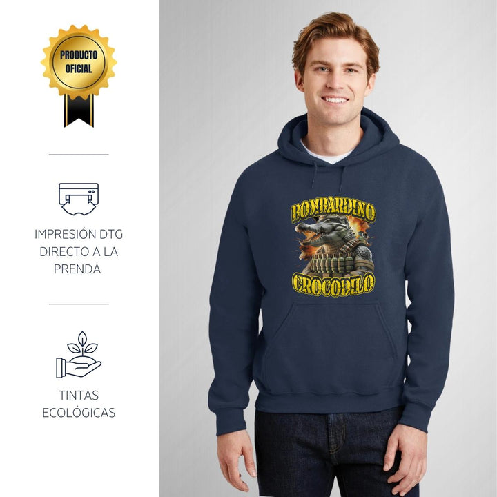 Sudadera hoodie de adulto con gorro o capucha y bolsillo frontal canguro, para hombre nueva, diseño Brainrot Bombardino Cocodrilo original impreso con tecnología DTG (directo a la prenda) tacto cero, uso casual o deportiva, 50% algodón y 50% poliéster fleece pre encogido, estructura tubular con ajuste clásico. Colores de sudadera: Negro, Blanco, Azul Marino, Gris.
