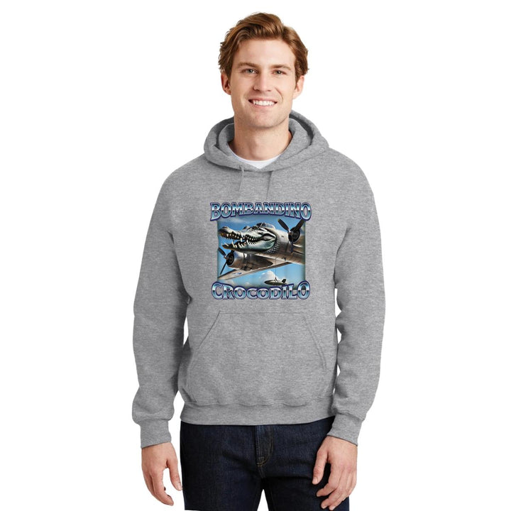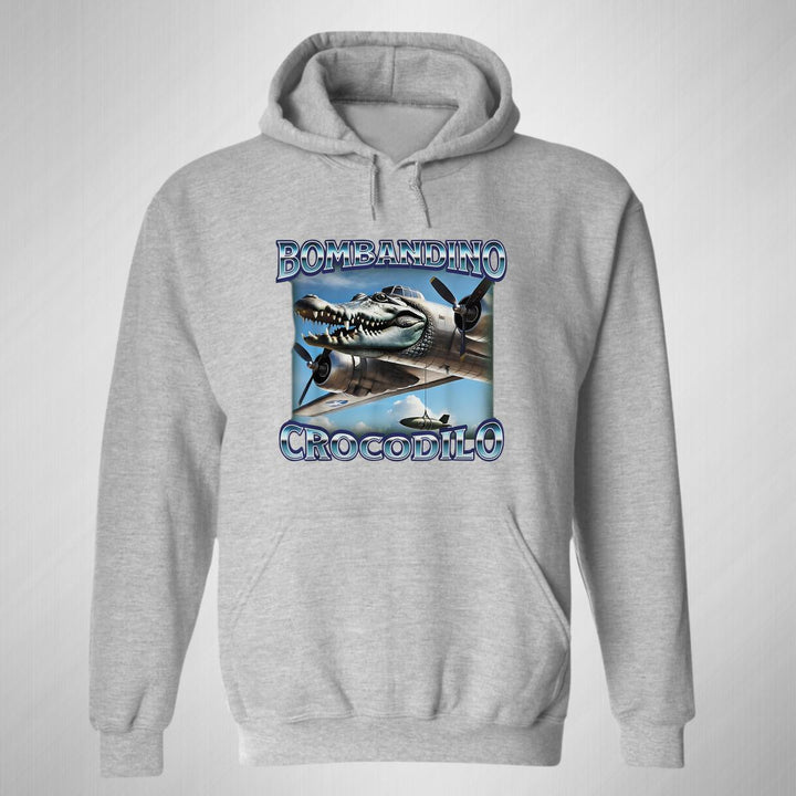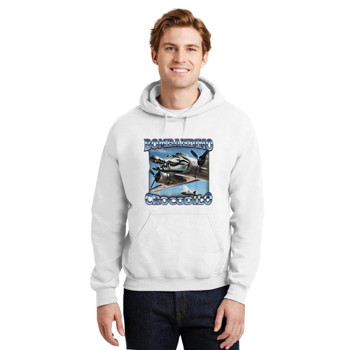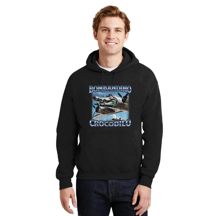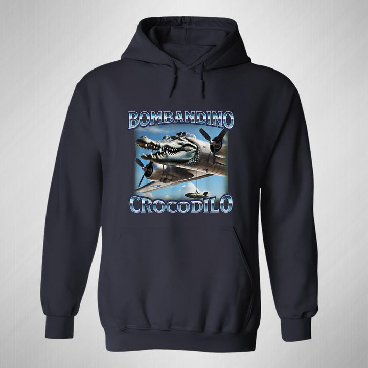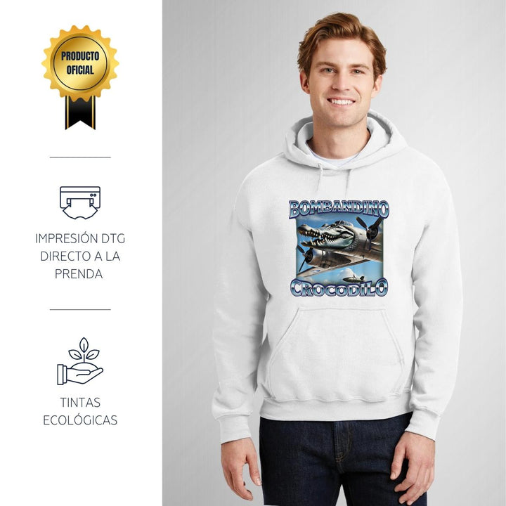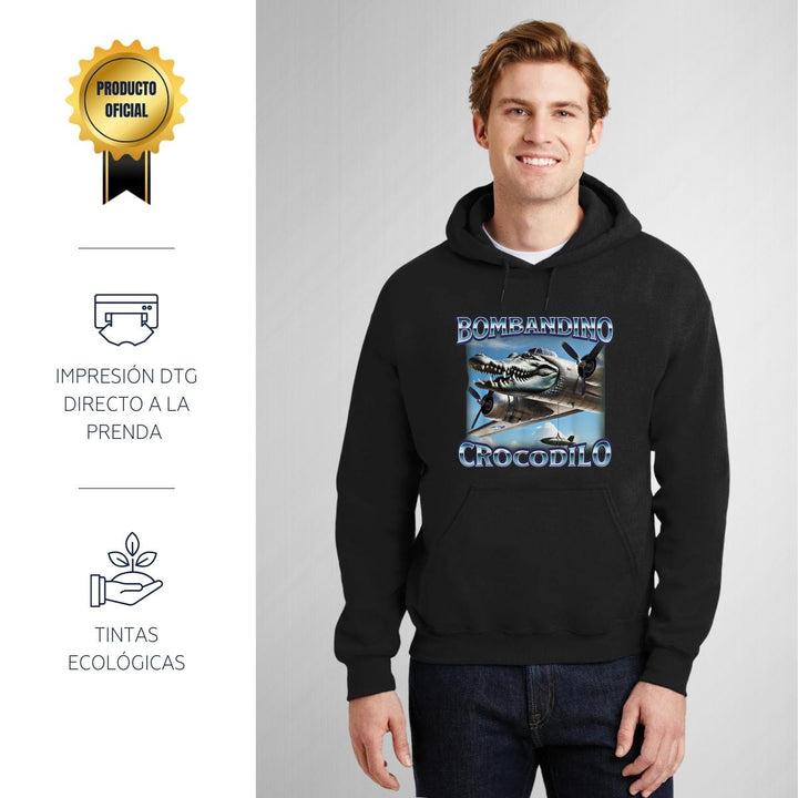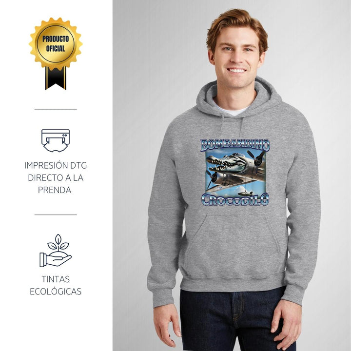 Sudadera hoodie de adulto con gorro o capucha y bolsillo frontal canguro, para hombre nueva, diseño Brainrot Bombardino Cocodrilo original impreso con tecnología DTG (directo a la prenda) tacto cero, uso casual o deportiva, 50% algodón y 50% poliéster fleece pre encogido, estructura tubular con ajuste clásico. Colores de sudadera: Negro, Blanco, Azul Marino, Gris.