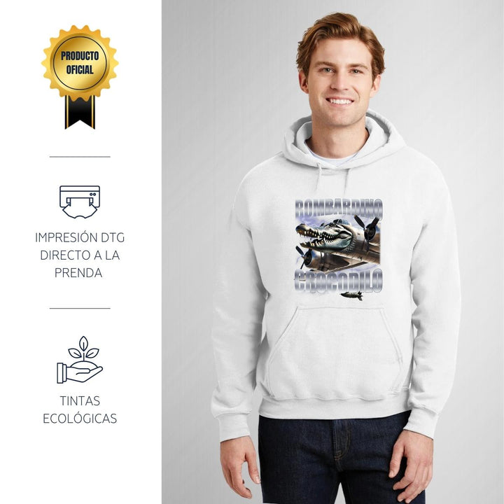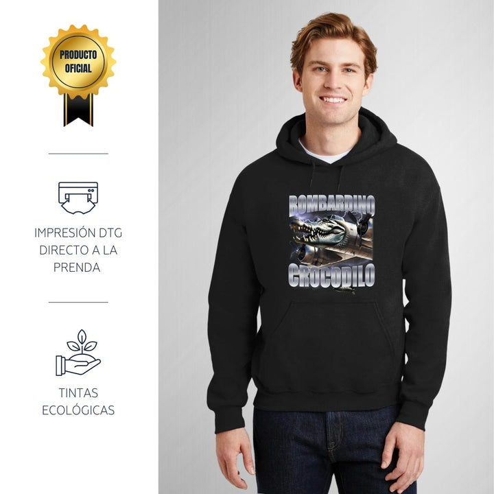 Sudadera hoodie de adulto con gorro o capucha y bolsillo frontal canguro, para hombre nueva, diseño Brainrot Bombardino Cocodrilo original impreso con tecnología DTG (directo a la prenda) tacto cero, uso casual o deportiva, 50% algodón y 50% poliéster fleece pre encogido, estructura tubular con ajuste clásico. Colores de sudadera: Negro, Blanco, Azul Marino, Gris.