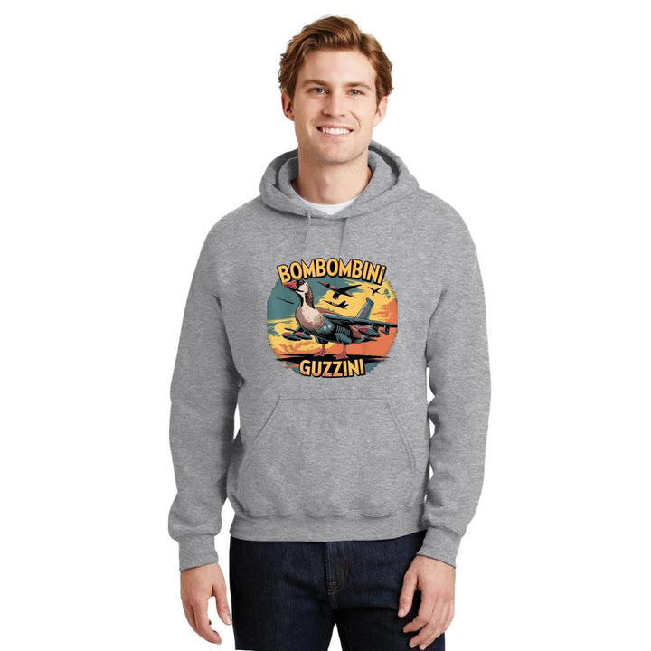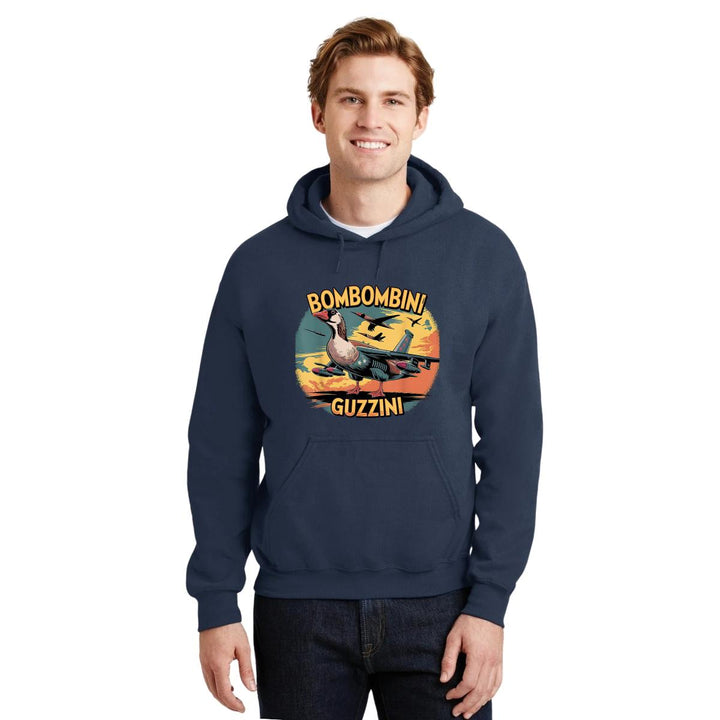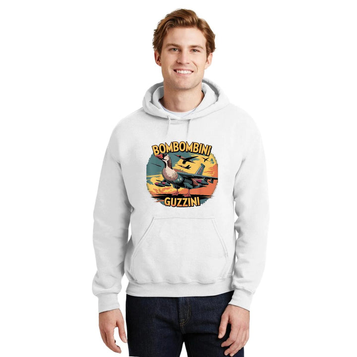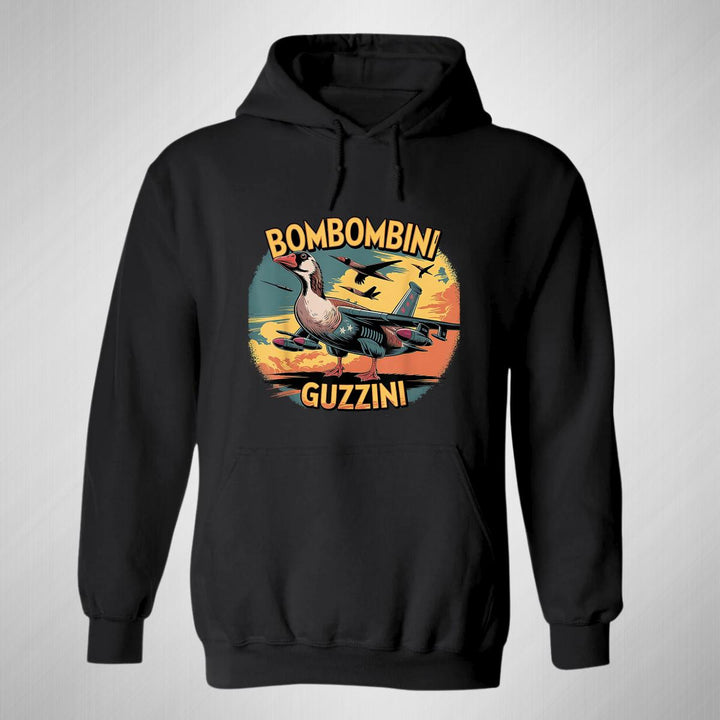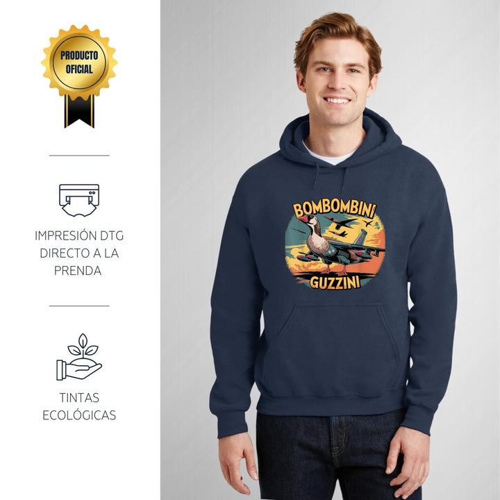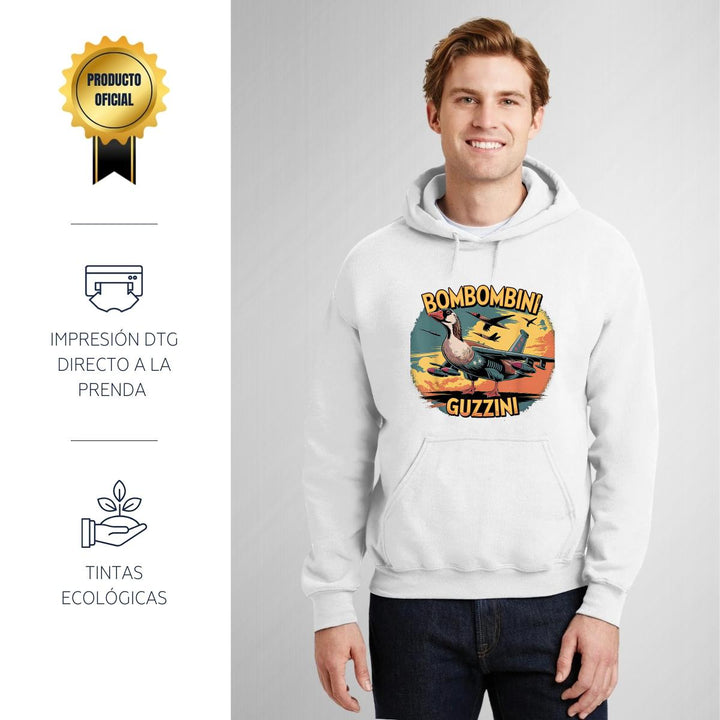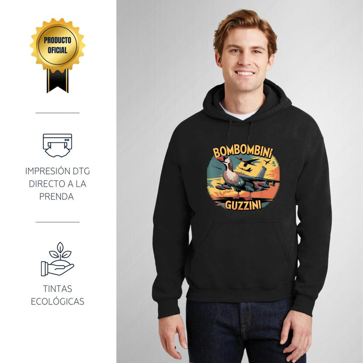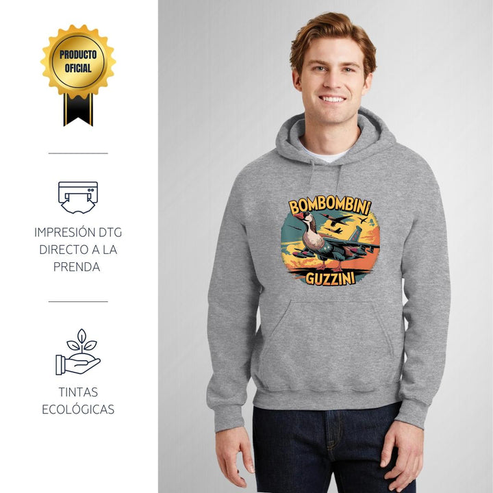 Sudadera hoodie de adulto con gorro o capucha y bolsillo frontal canguro, para hombre nueva, diseño Brainrot Bombombini Gusini original impreso con tecnología DTG (directo a la prenda) tacto cero, uso casual o deportiva, 50% algodón y 50% poliéster fleece pre encogido, estructura tubular con ajuste clásico. Colores de sudadera: Negro, Blanco, Azul Marino, Gris.