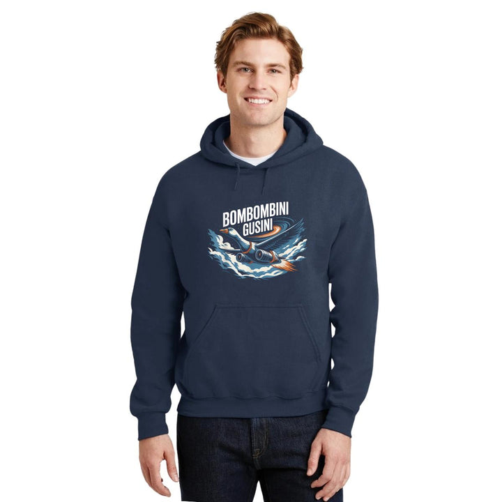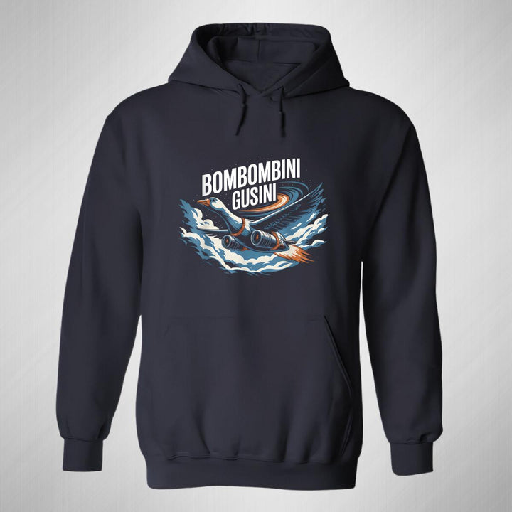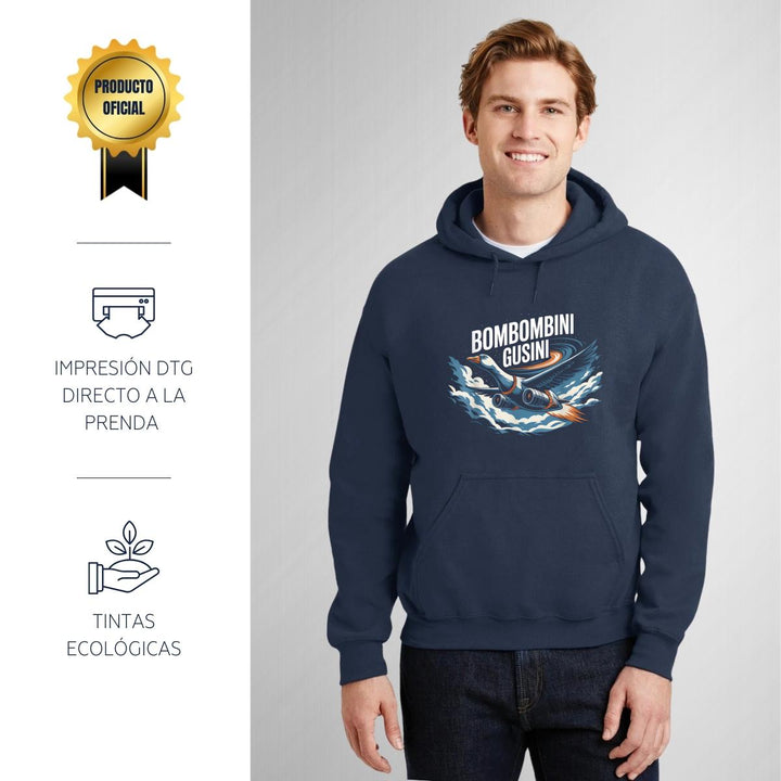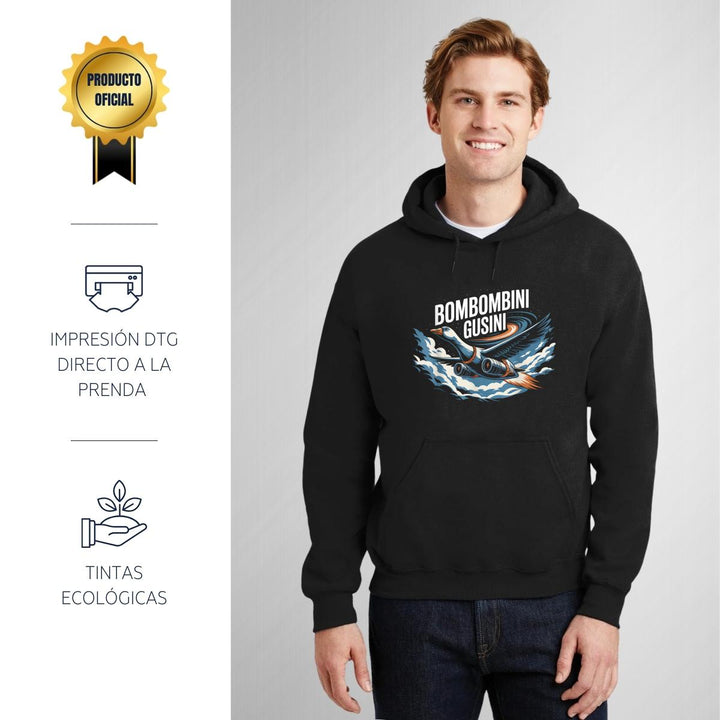 Sudadera hoodie de adulto con gorro o capucha y bolsillo frontal canguro, para hombre nueva, diseño Brainrot Bombombini Gusini original impreso con tecnología DTG (directo a la prenda) tacto cero, uso casual o deportiva, 50% algodón y 50% poliéster fleece pre encogido, estructura tubular con ajuste clásico. Colores de sudadera: Negro, Blanco, Azul Marino, Gris.