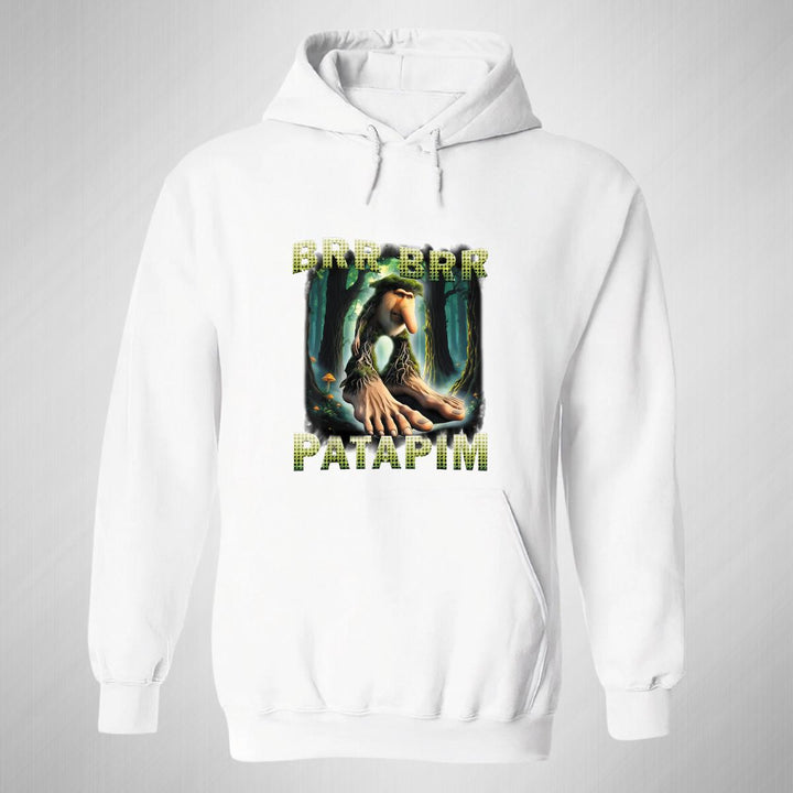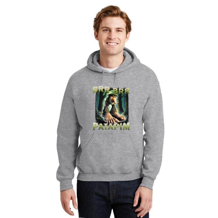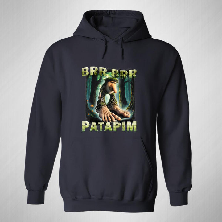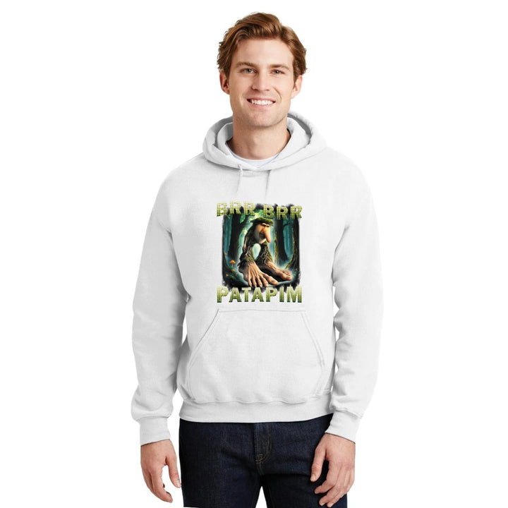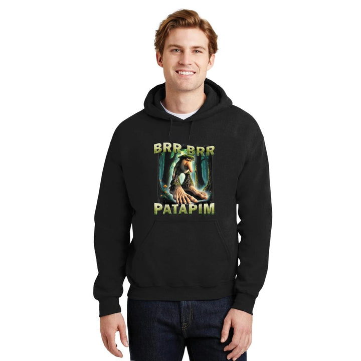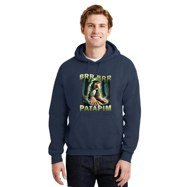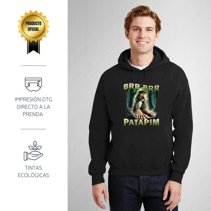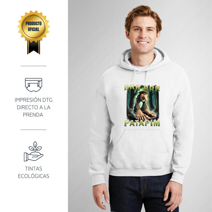 Sudadera hoodie de adulto con gorro o capucha y bolsillo frontal canguro, para hombre nueva, diseño Brainrot Brr Brr Patapim original impreso con tecnología DTG (directo a la prenda) tacto cero, uso casual o deportiva, 50% algodón y 50% poliéster fleece pre encogido, estructura tubular con ajuste clásico. Colores de sudadera: Negro, Blanco, Azul Marino, Gris.