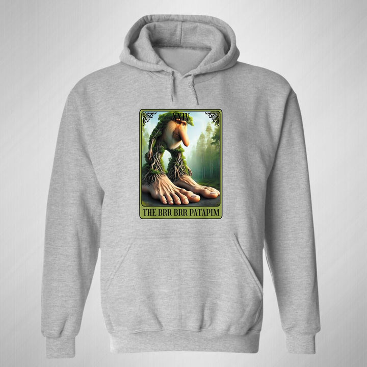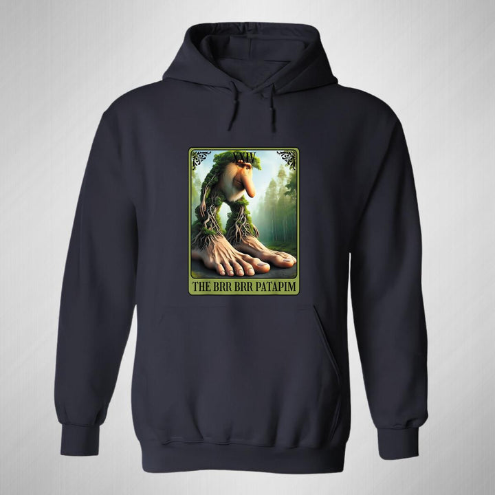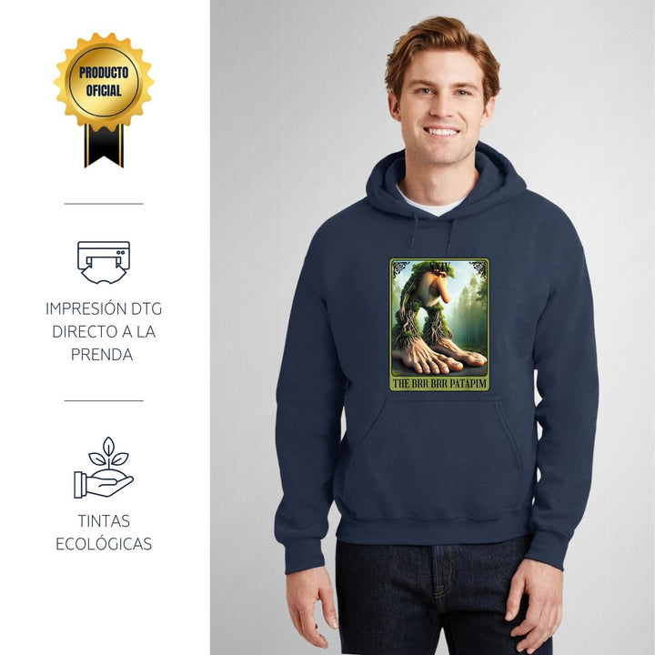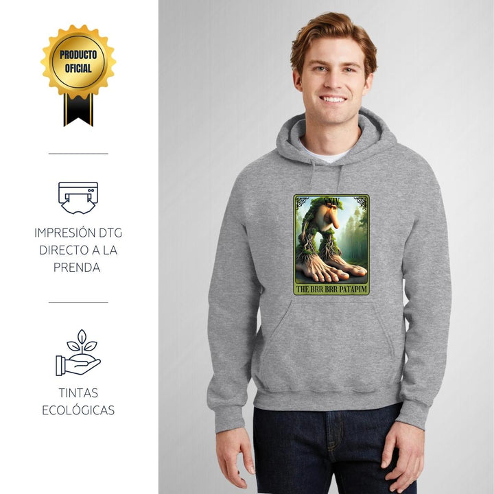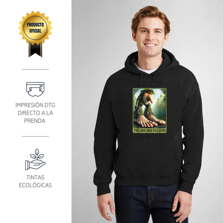 Sudadera hoodie de adulto con gorro o capucha y bolsillo frontal canguro, para hombre nueva, diseño Brainrot Brr Brr Patapim original impreso con tecnología DTG (directo a la prenda) tacto cero, uso casual o deportiva, 50% algodón y 50% poliéster fleece pre encogido, estructura tubular con ajuste clásico. Colores de sudadera: Negro, Blanco, Azul Marino, Gris.