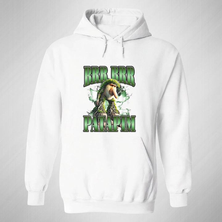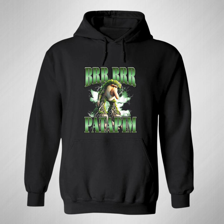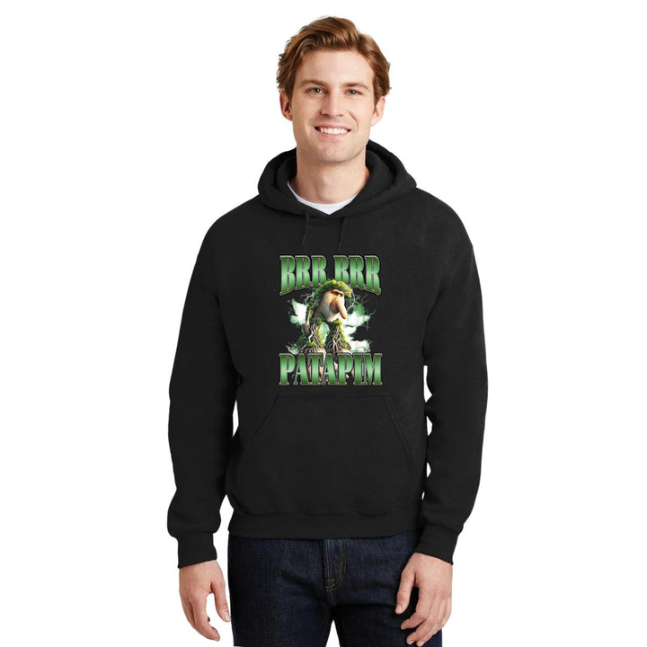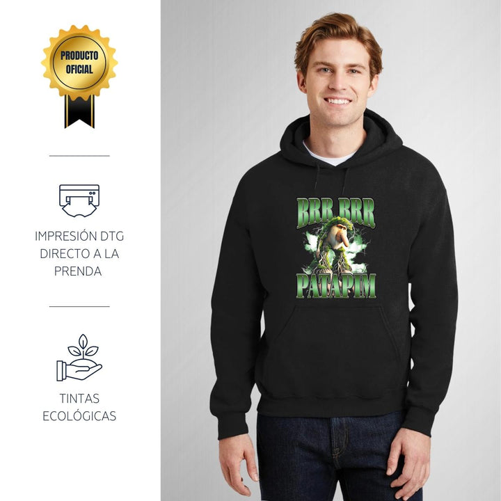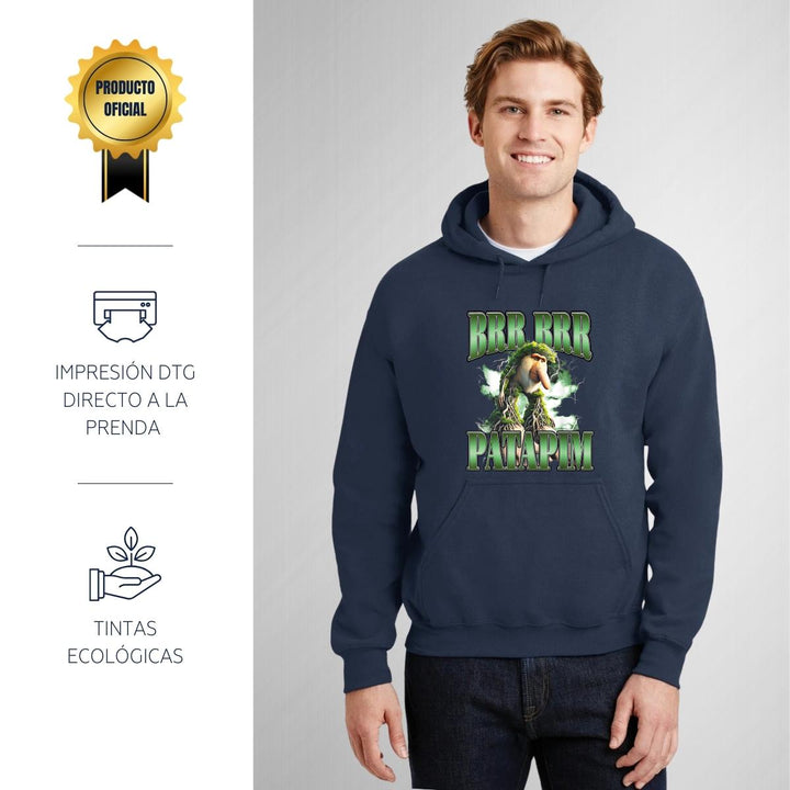 Sudadera hoodie de adulto con gorro o capucha y bolsillo frontal canguro, para hombre nueva, diseño Brainrot Brr Brr Patapim original impreso con tecnología DTG (directo a la prenda) tacto cero, uso casual o deportiva, 50% algodón y 50% poliéster fleece pre encogido, estructura tubular con ajuste clásico. Colores de sudadera: Negro, Blanco, Azul Marino, Gris.