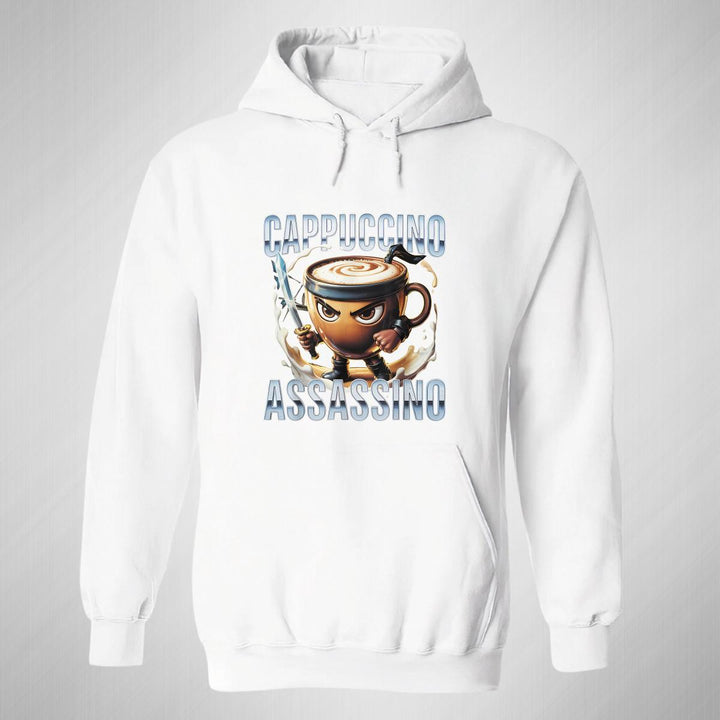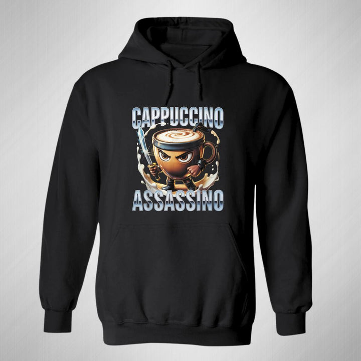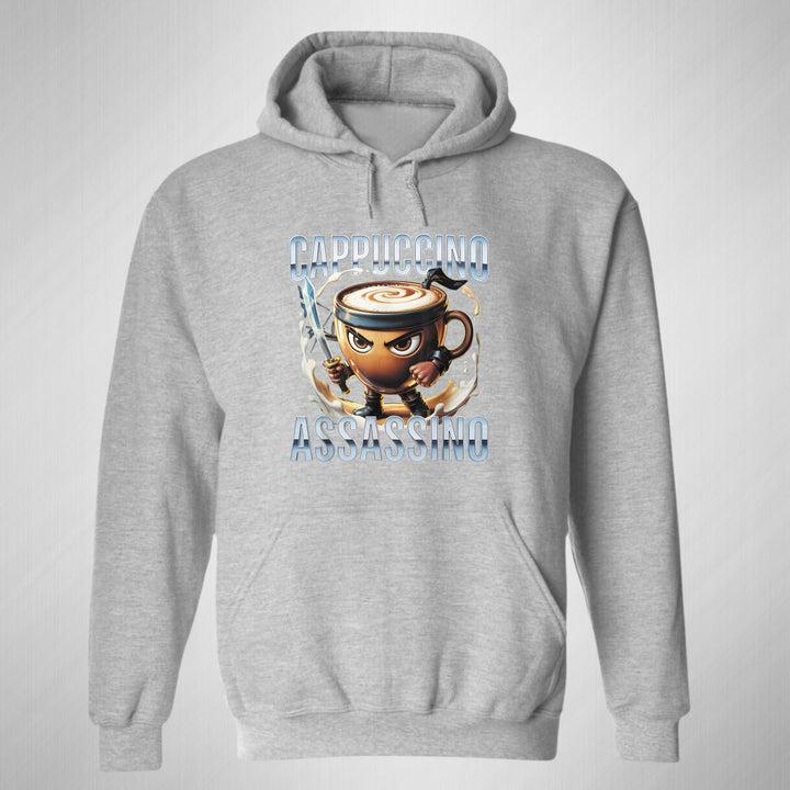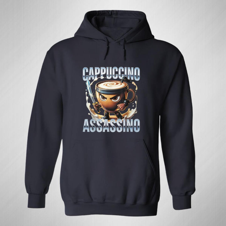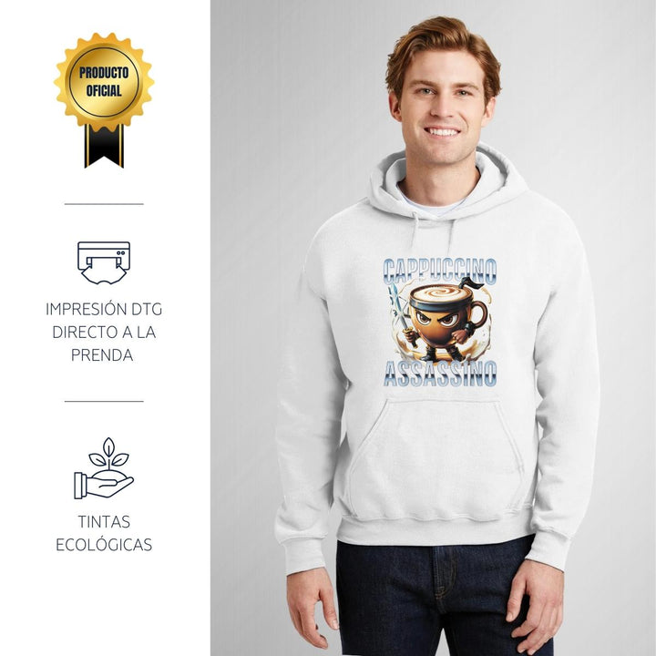 Sudadera hoodie de adulto con gorro o capucha y bolsillo frontal canguro, para hombre nueva, diseño Brainrot Cappuccino Assassino original impreso con tecnología DTG (directo a la prenda) tacto cero, uso casual o deportiva, 50% algodón y 50% poliéster fleece pre encogido, estructura tubular con ajuste clásico. Colores de sudadera: Negro, Blanco, Azul Marino, Gris.