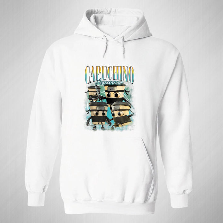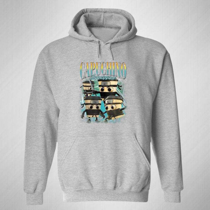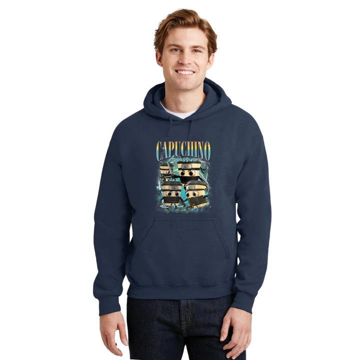 Sudadera hoodie de adulto con gorro o capucha y bolsillo frontal canguro, para hombre nueva, diseño Brainrot Cappuccino Assassino original impreso con tecnología DTG (directo a la prenda) tacto cero, uso casual o deportiva, 50% algodón y 50% poliéster fleece pre encogido, estructura tubular con ajuste clásico. Colores de sudadera: Negro, Blanco, Azul Marino, Gris.