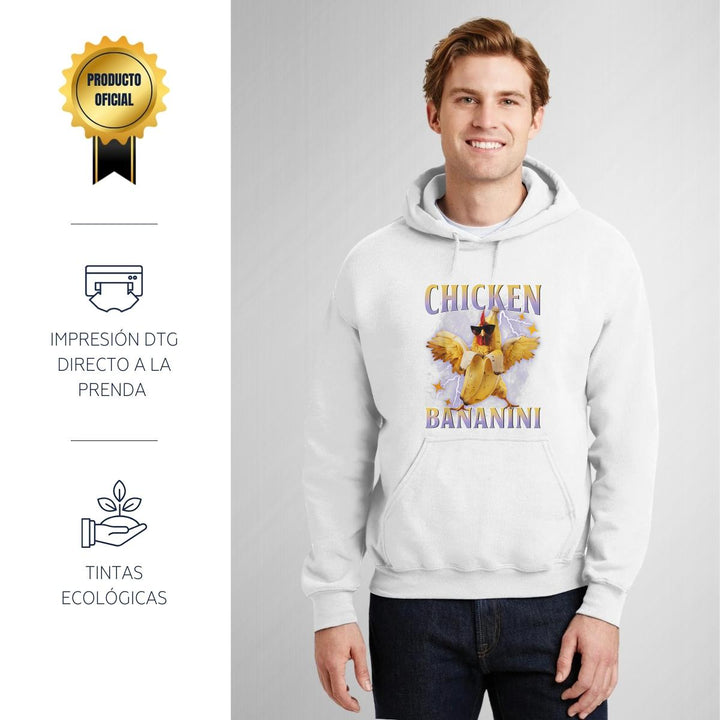 Sudadera hoodie de adulto con gorro o capucha y bolsillo frontal canguro, para hombre nueva, diseño Brainrot Chicken Banana original impreso con tecnología DTG (directo a la prenda) tacto cero, uso casual o deportiva, 50% algodón y 50% poliéster fleece pre encogido, estructura tubular con ajuste clásico. Colores de sudadera: Negro, Blanco, Azul Marino, Gris.